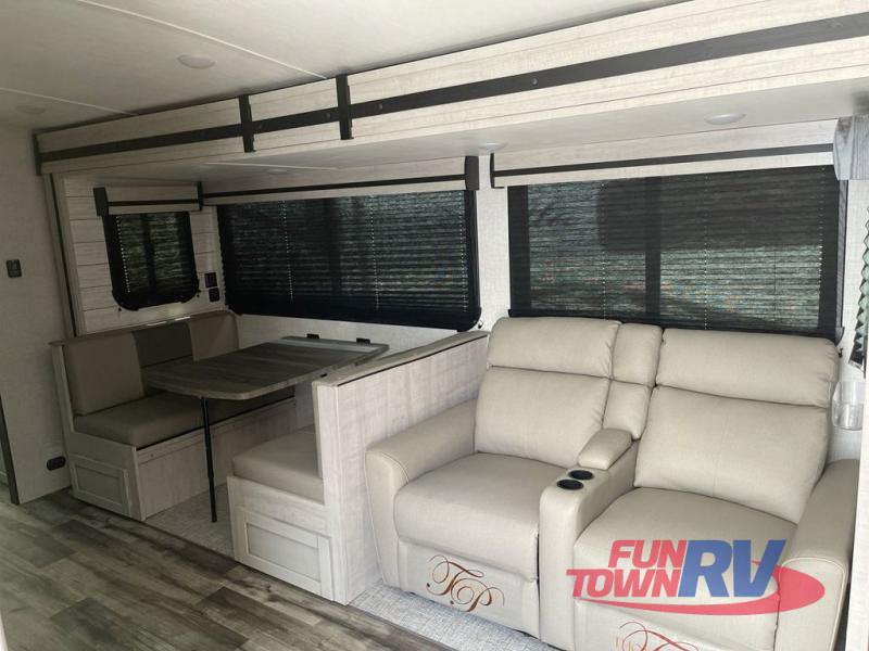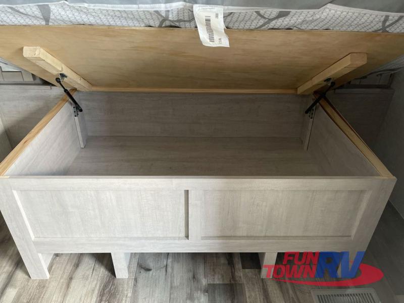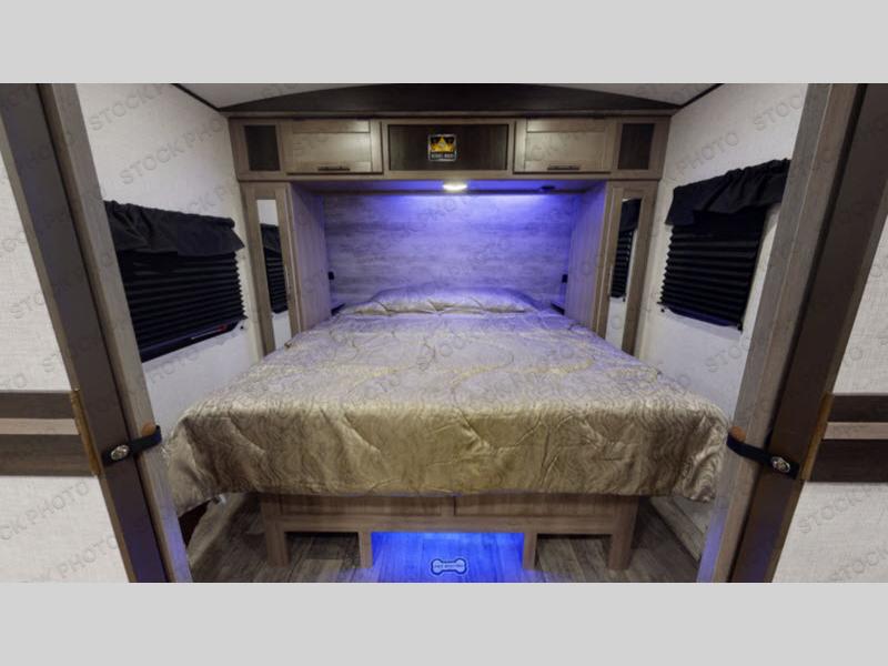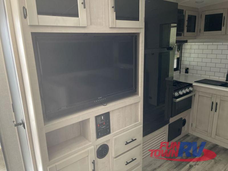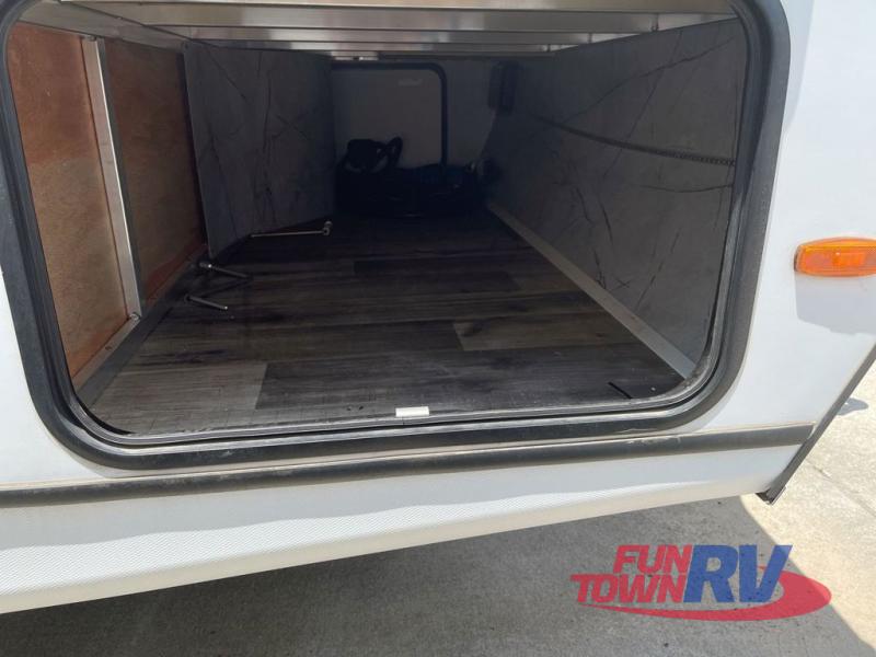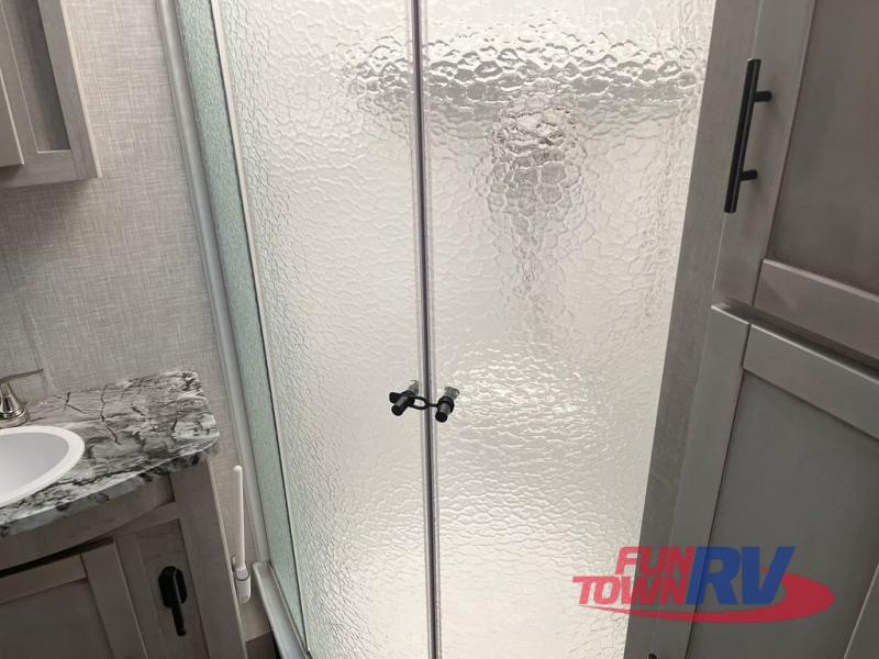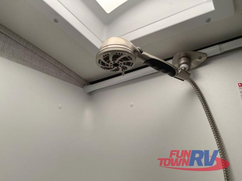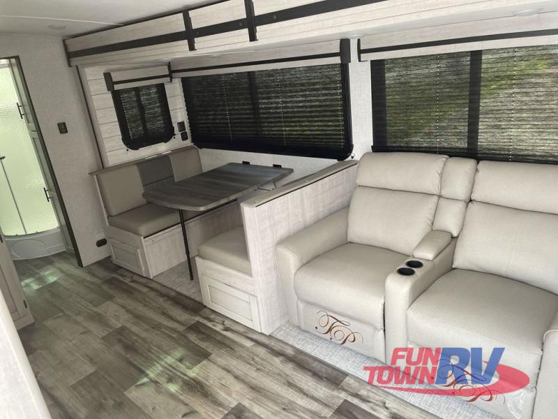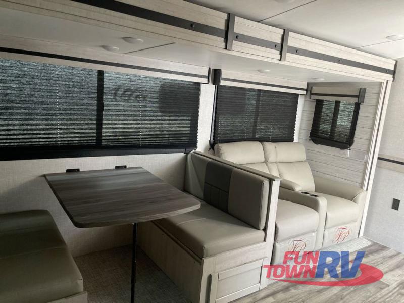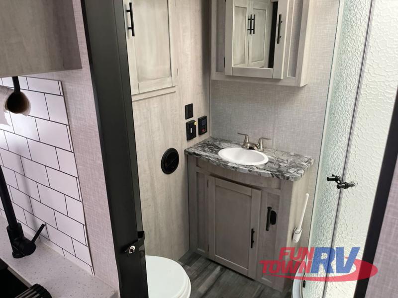 You will love the added interior space you have in this travel trailer thanks to the large slide out in the main living area. Here, you'll enjoy playing cards at the XL booth dinette and relaxing on the tri-fold sofa. Make home-cooked meals on the glass top range or use the exterior camp kitchen. There is even an exterior refrigerator for cold drinks, and the power awning will shade you from the hot summer sun. This model features a full rear bath for added privacy, and the shower skylight will allow natural light in. The front private bedroom includes a king bed, dual wardrobes, plus a shoe storage and pet station for your convenience!