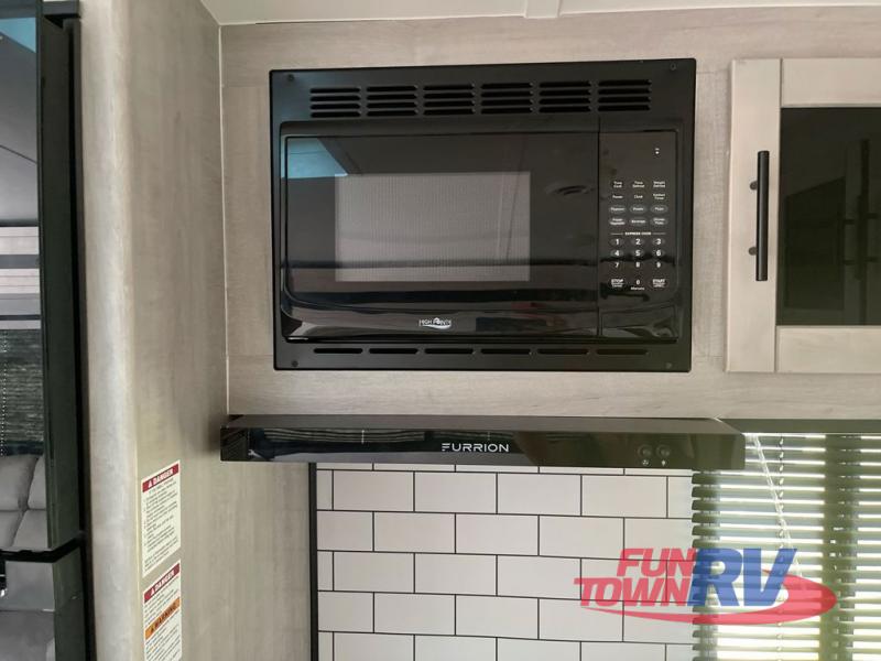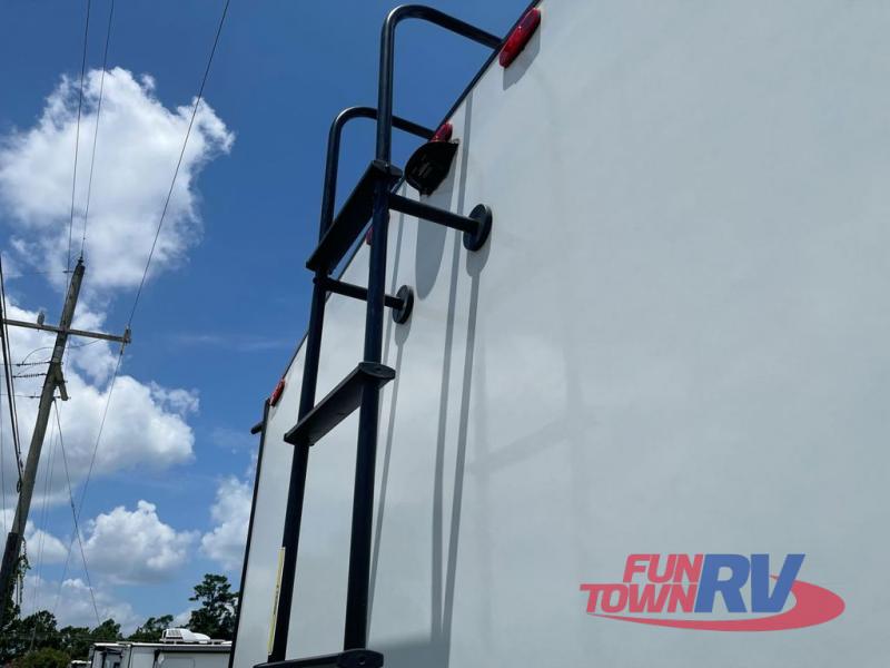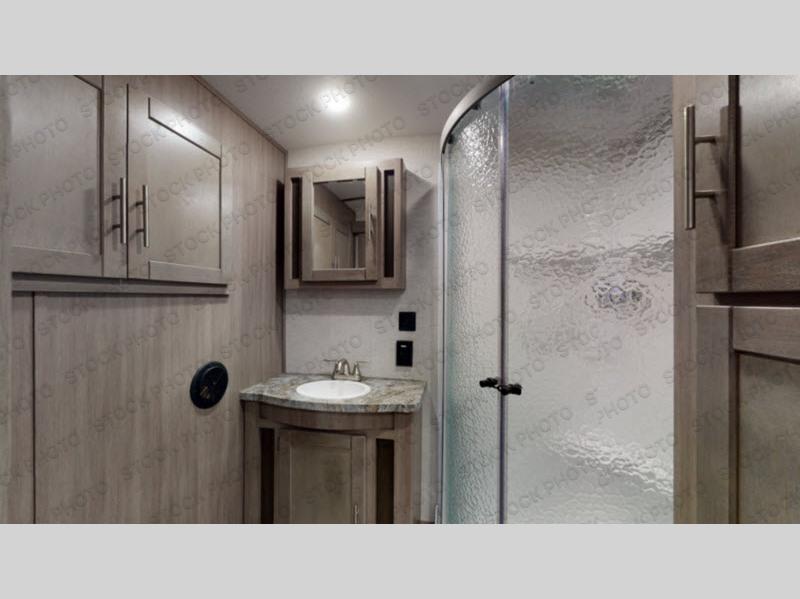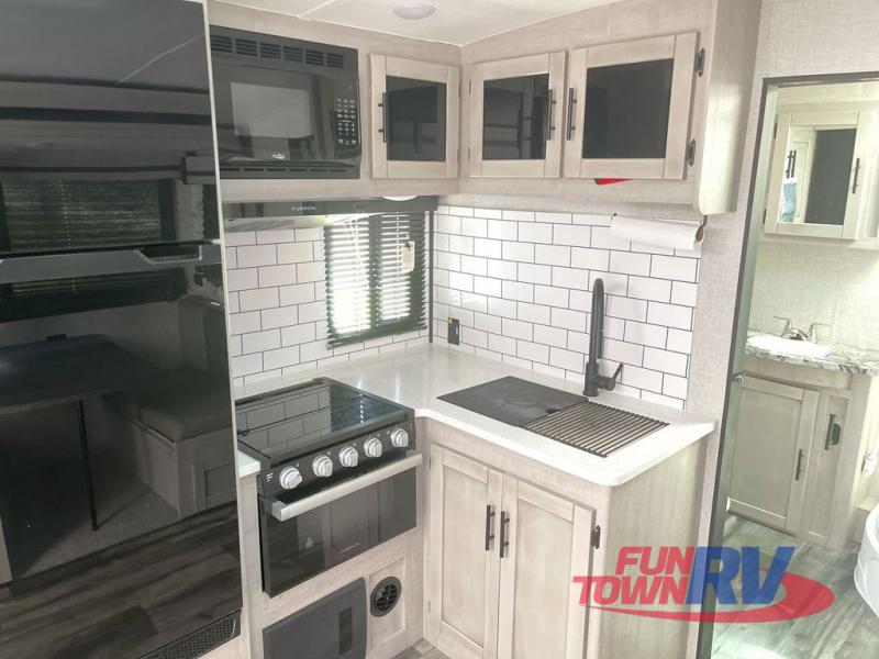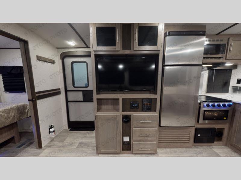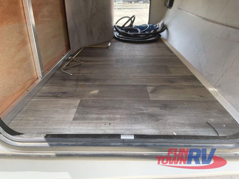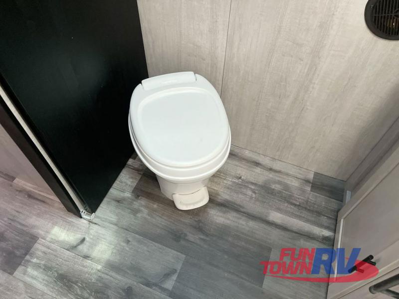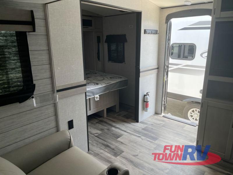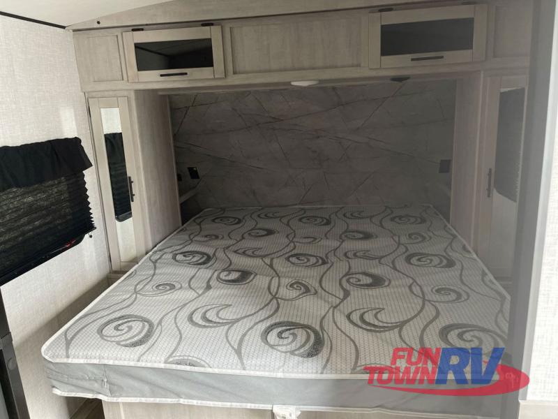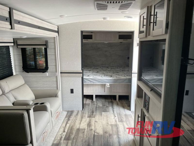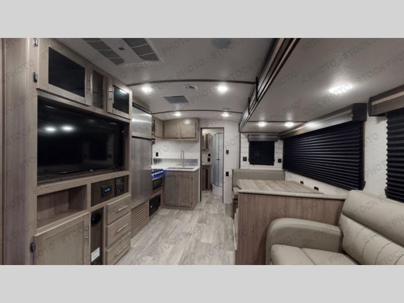 You will love the added interior space you have in this travel trailer thanks to the large slide out in the main living area. Here, you'll enjoy playing cards at the XL booth dinette and relaxing on the tri-fold sofa. Make home-cooked meals on the glass top range or use the exterior camp kitchen. There is even an exterior refrigerator for cold drinks, and the power awning will shade you from the hot summer sun. This model features a full rear bath for added privacy, and the shower skylight will allow natural light in. The front private bedroom includes a king bed, dual wardrobes, plus a shoe storage and pet station for your convenience!