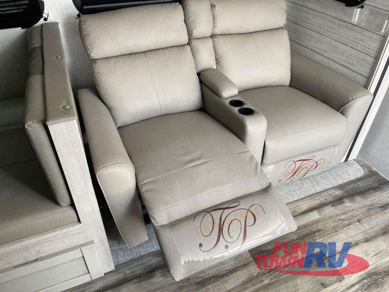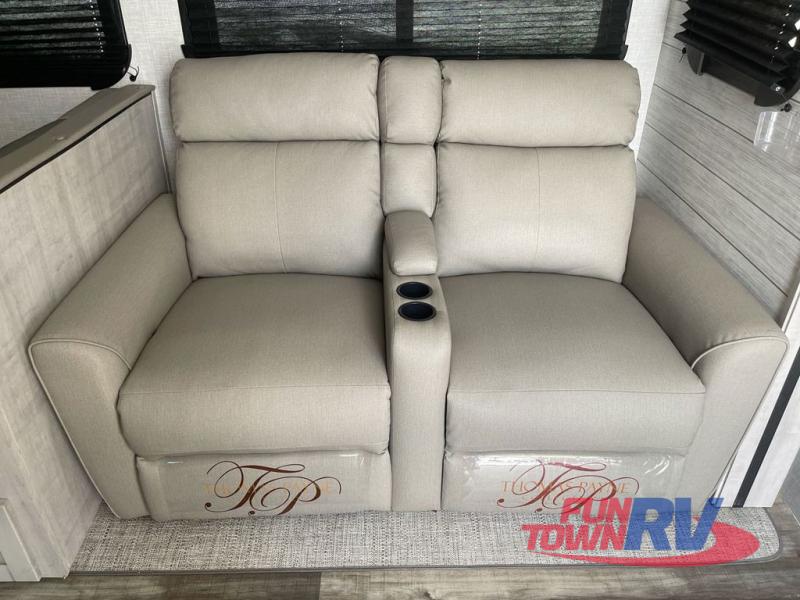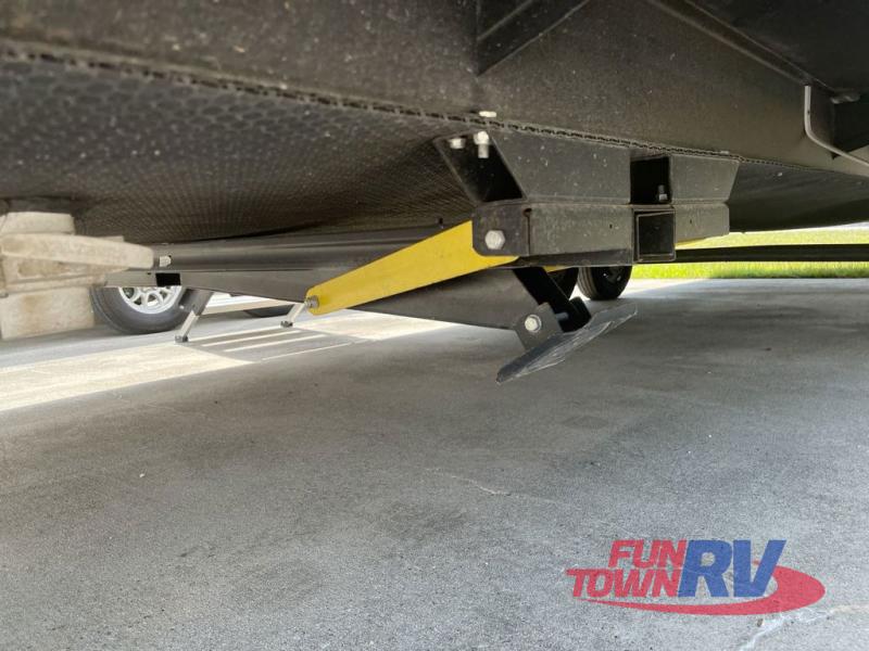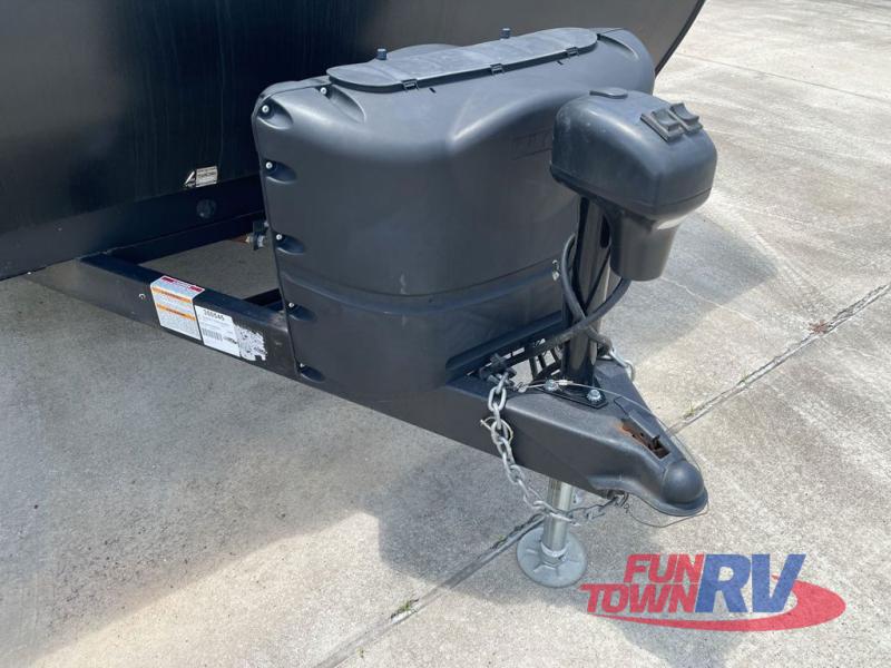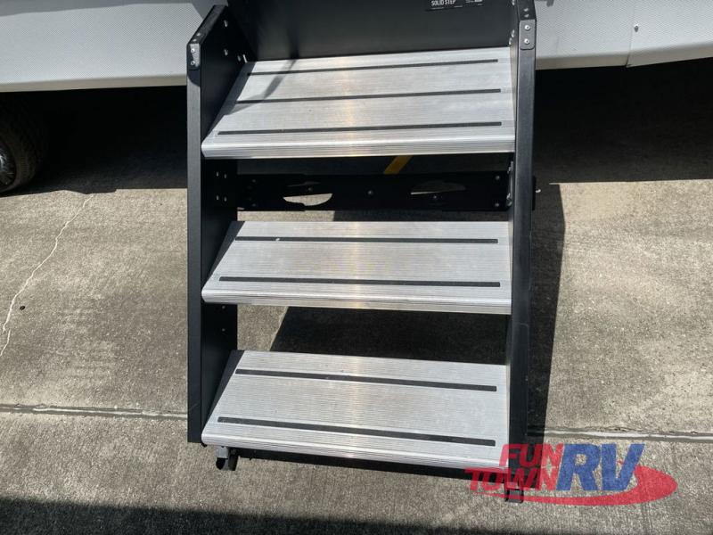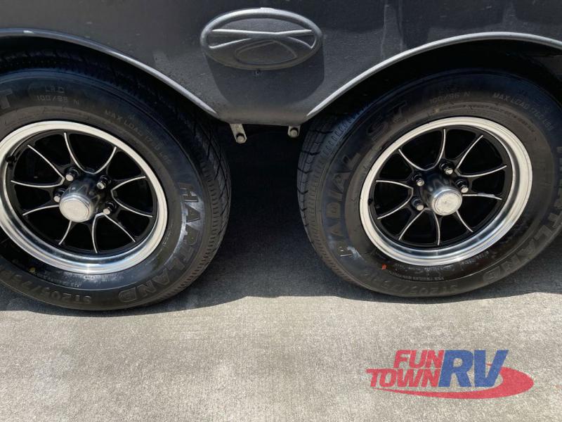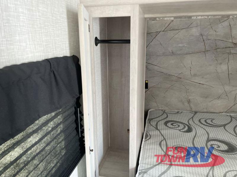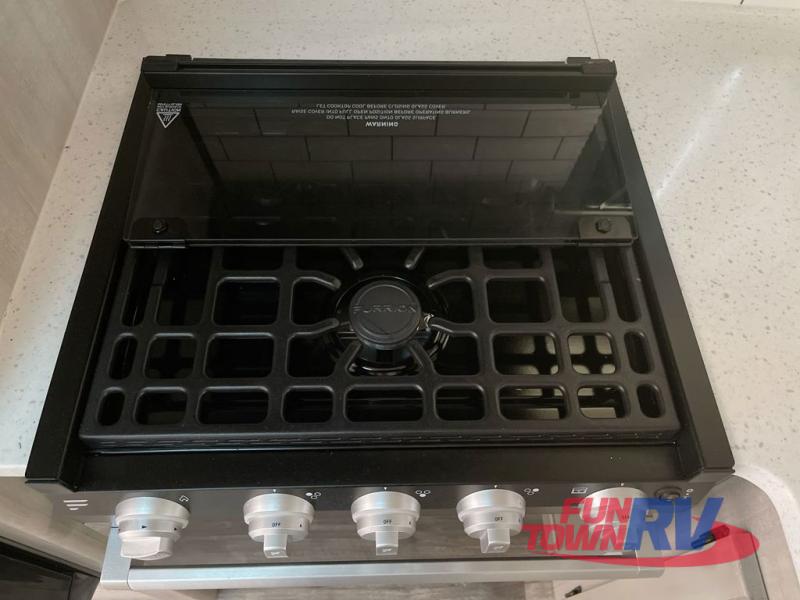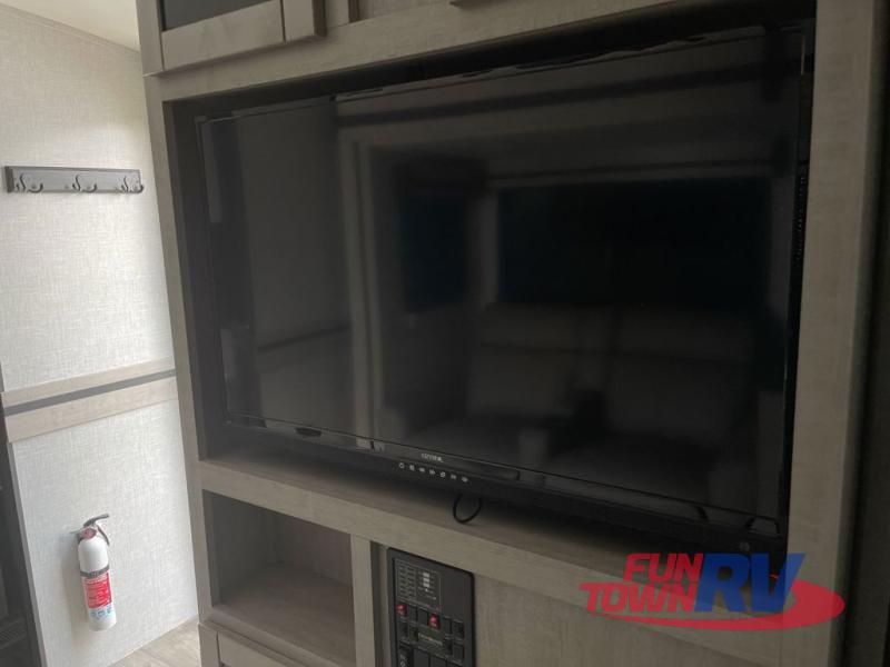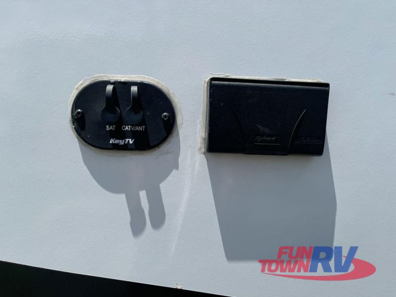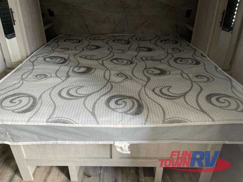You will love the added interior space you have in this travel trailer thanks to the large slide out in the main living area. Here, you'll enjoy playing cards at the XL booth dinette and relaxing on the tri-fold sofa. Make home-cooked meals on the glass top range or use the exterior camp kitchen. There is even an exterior refrigerator for cold drinks, and the power awning will shade you from the hot summer sun. This model features a full rear bath for added privacy, and the shower skylight will allow natural light in. The front private bedroom includes a king bed, dual wardrobes, plus a shoe storage and pet station for your convenience!
