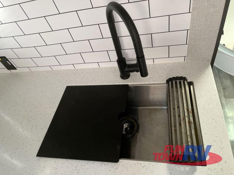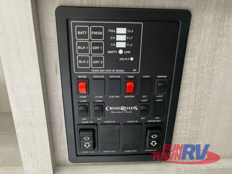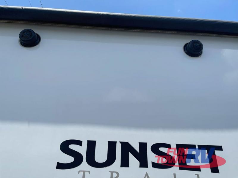 With any Sunset Trail travel trailer by CrossRoads RV, the interior offers a stainless steel farmhouse sink with a cover, solid surface kitchen countertops, and a docking station with 12 Volt, USB Port, and 110 Outlets. Also included is a 13,500 BTU air conditioner plus upgraded insulation with roof and floor reflective foil for added comfort, plus sturdy construction elements like a plywood bed board with strut assist, residential wood window trim, and hardwood cabinet doors. Make your lightweight and comfortable RV decision today!