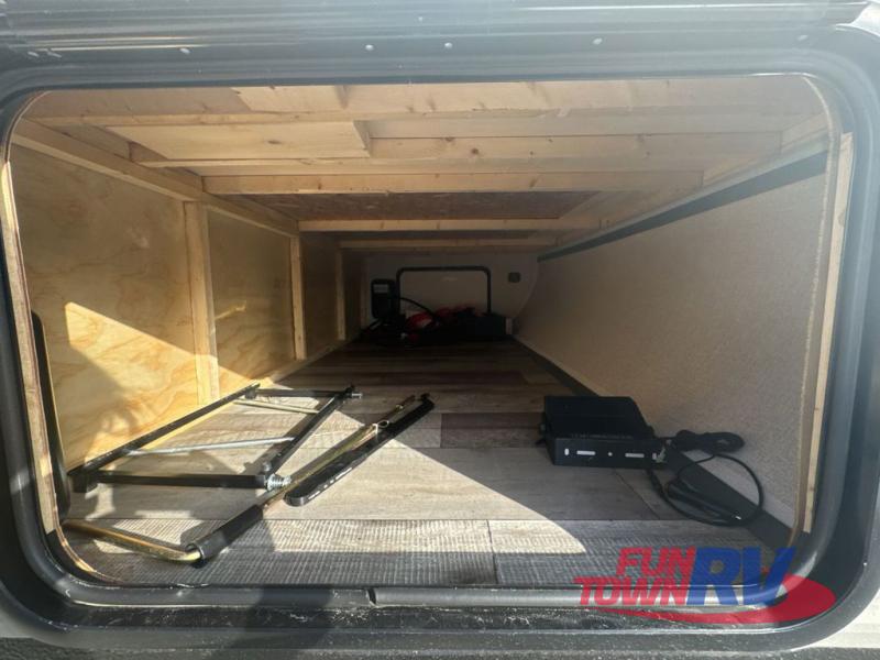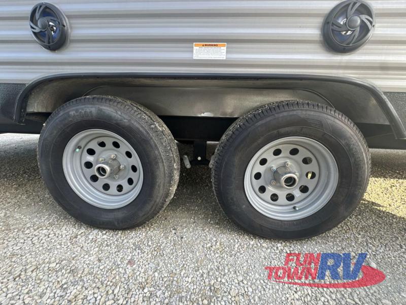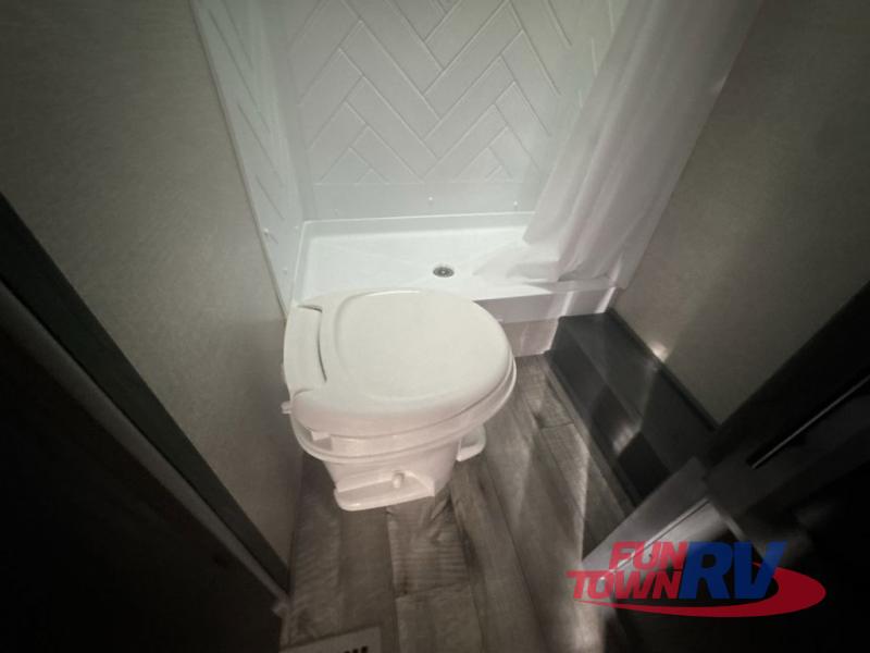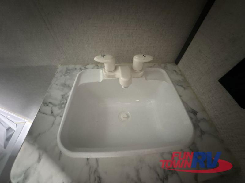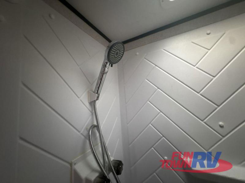 Enjoy privacy in the front bedroom when you close the curtains. You can sleep on your own residential queen bed, and there are two wardrobes to stow away your clothes. Your family and friends can sleep on the double-size bunks in the rear next to the full bathroom with a shower, and the booth dinette as well as the sofa provide extra sleeping space. The 7 cu. ft. refrigerator will hold your cold items, and you can cook using the range top, and keep everything clean using the galley sink with high rise faucet. And the overhead cabinets will hold your dishes, snacks and such.