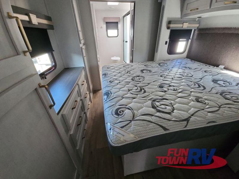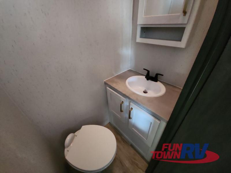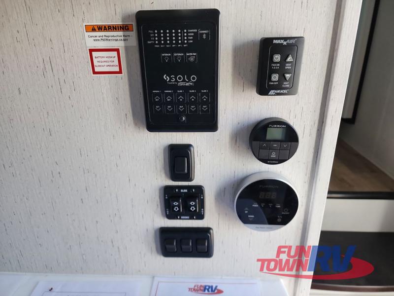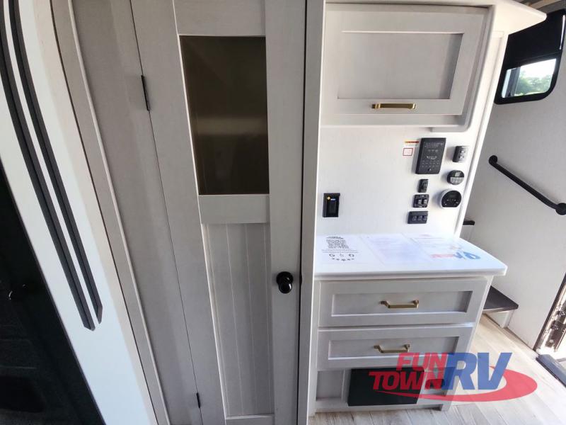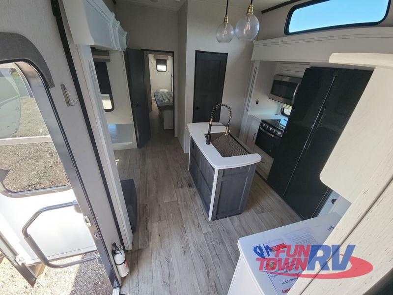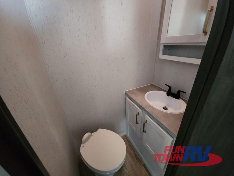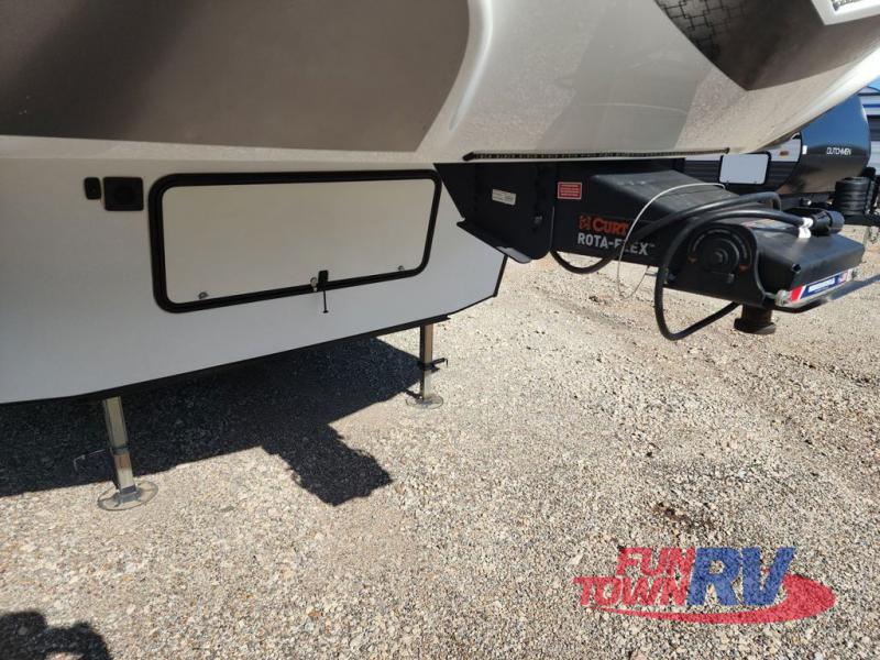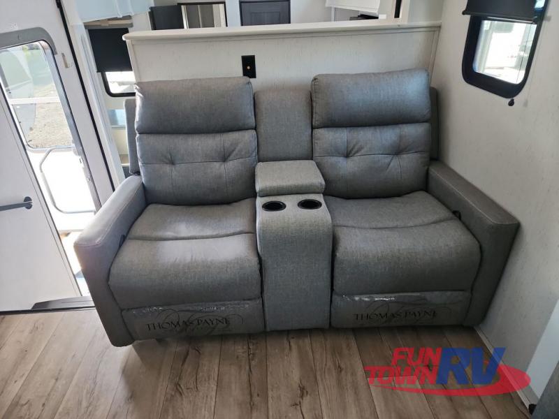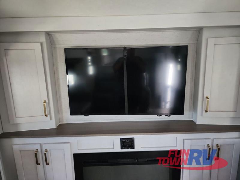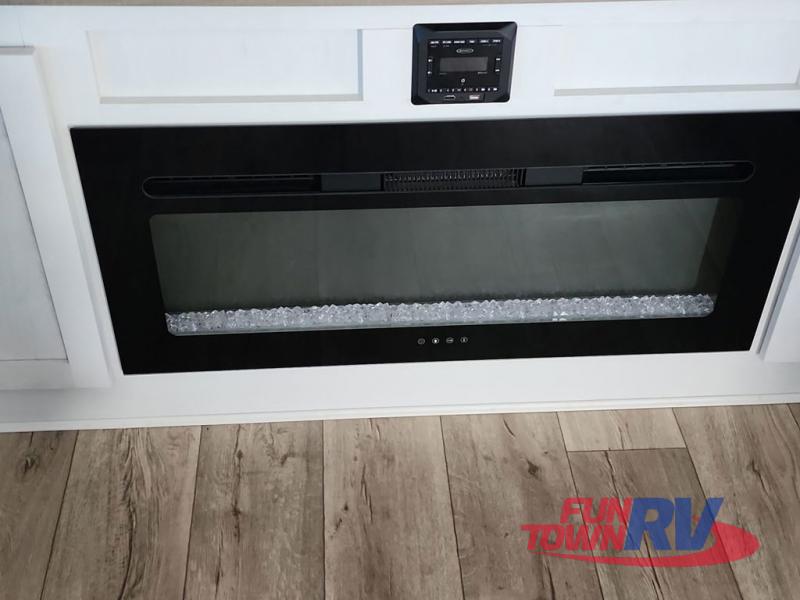 Experience a comfortable camping trip with this fifth wheel! The front living area not only has opposing sofa slides, but also theater seating across from an entertainment center with a 40" glass fireplace and a 50" LED TV. The separate kitchen has everything you will need to prepare delicious home cooked meals including a glass top three burner cooktop with a 21" oven and a kitchen island with a large sink that has a high rise faucet with sprayer for an easy clean up. There is even a half bathroom by the kitchen so you can use it and quickly get back to cooking. The master suite has a king bed slide for more walking around space, an entertainment center for a comfortable movie night, and access to the spacious full rear bathroom with a dual sink vanity, storage and a space prepped for a washer/dryer option.