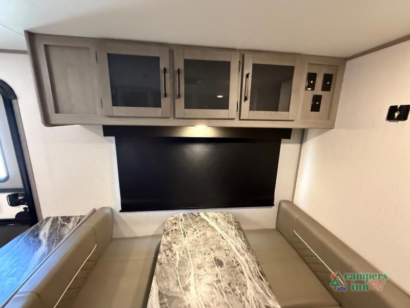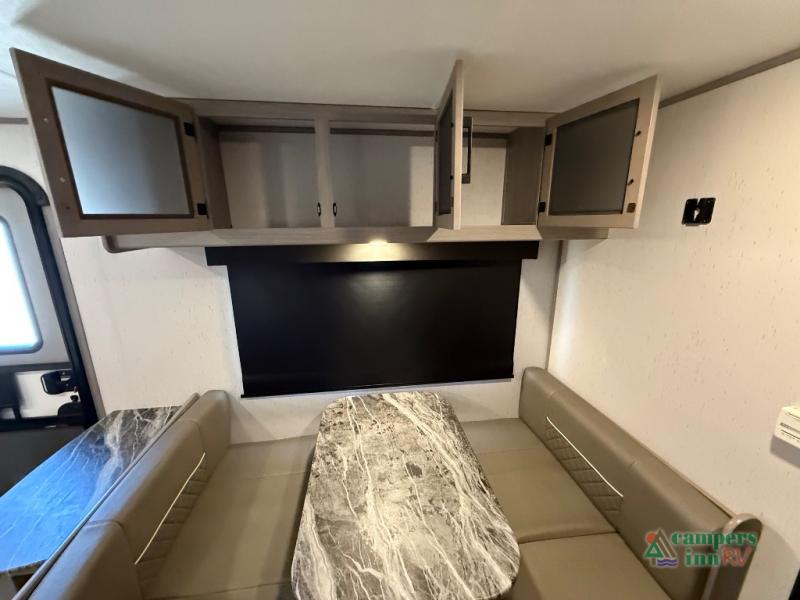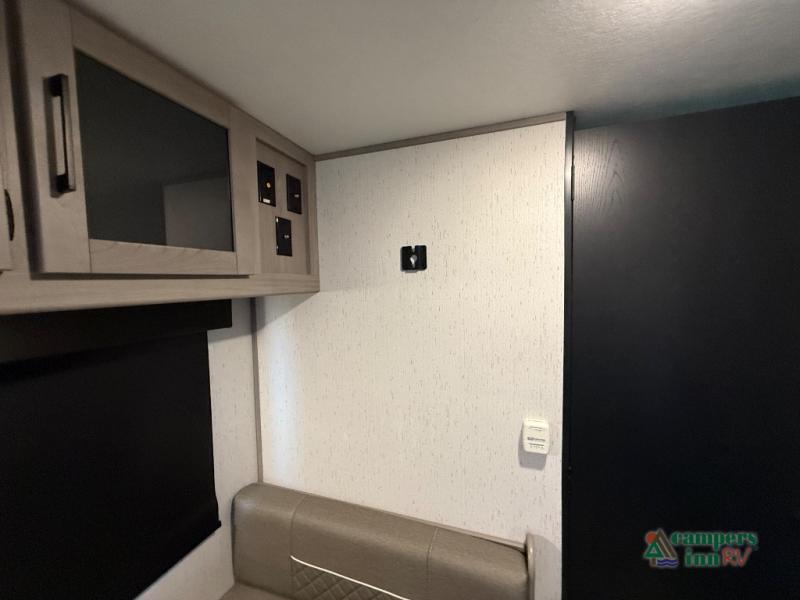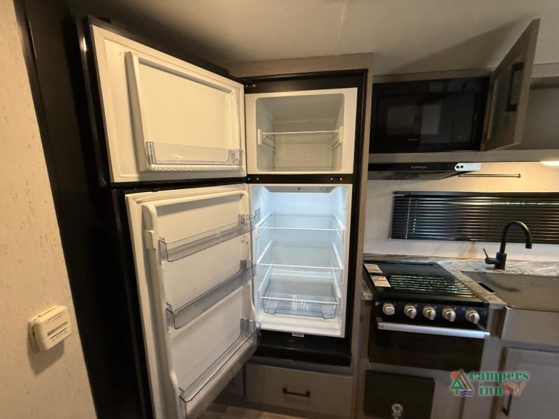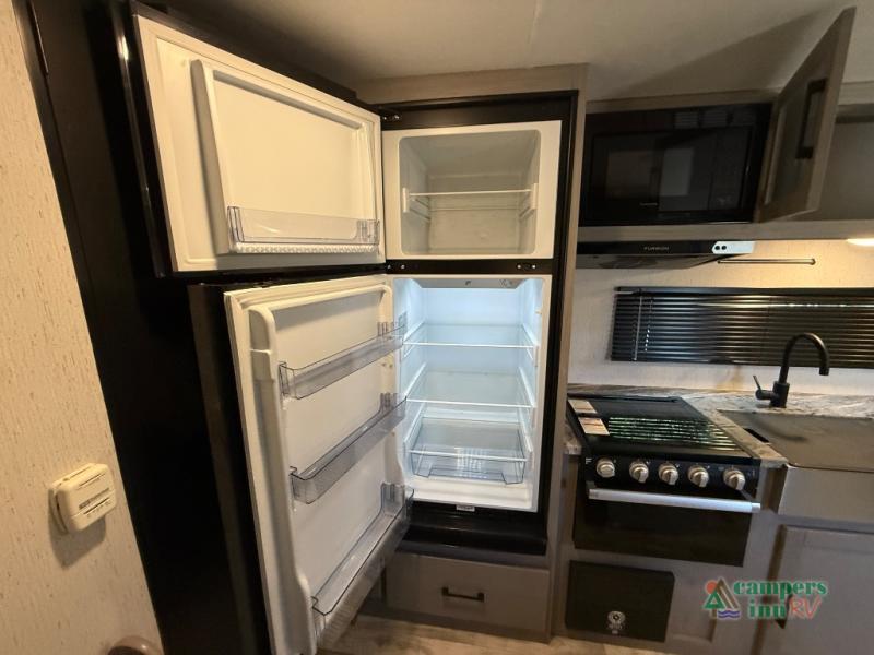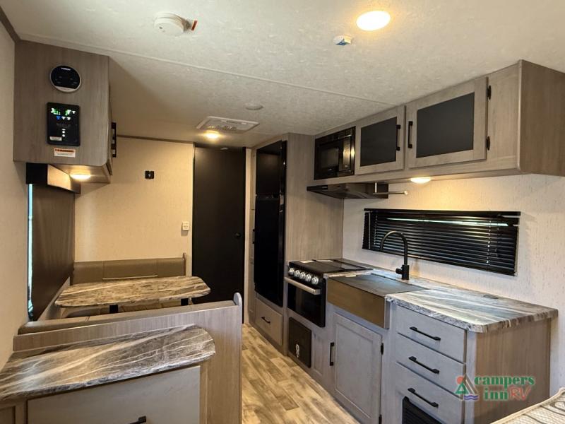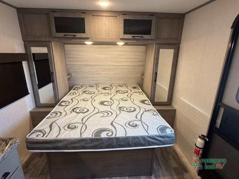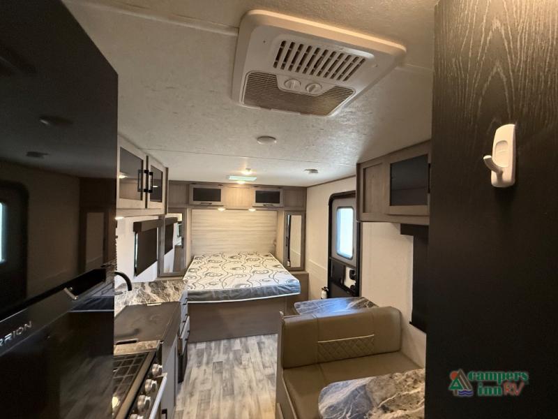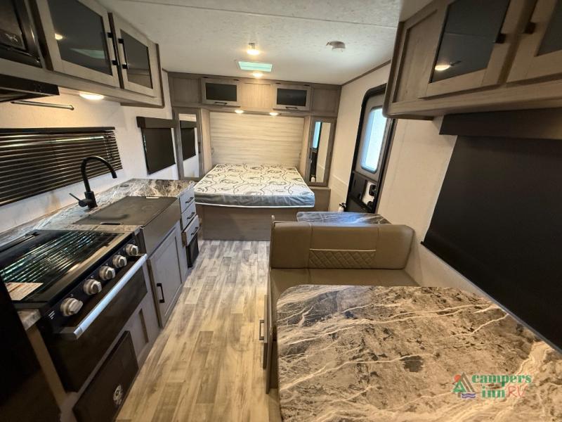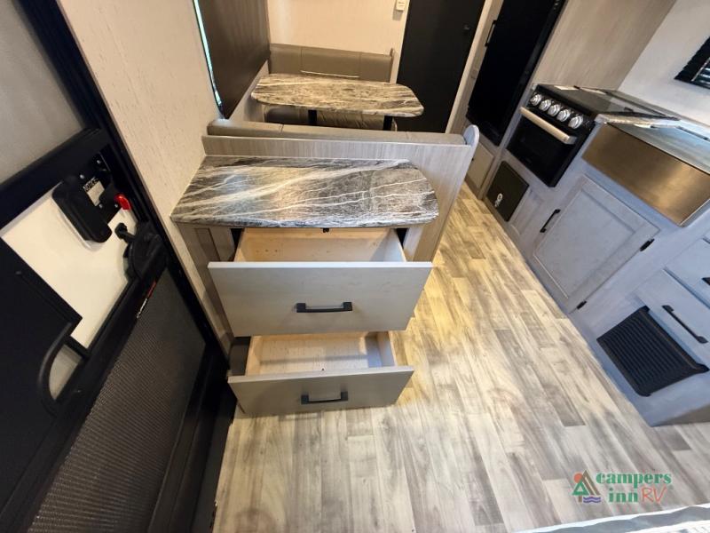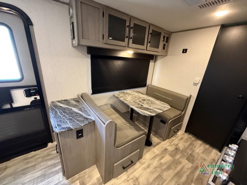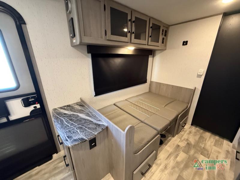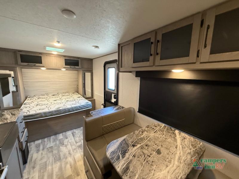 This couple's trailer is perfect for weekend excursions or extended getaways at your favorite state park. You will have your own queen bed up front with storage space for your things, and the full rear bath will add privacy and convenience. Prepare your meals on the three burner range or in the microwave oven, and you can dine together at the booth dinette. The dinette can also be used as additional sleeping space for one guest or two kids.