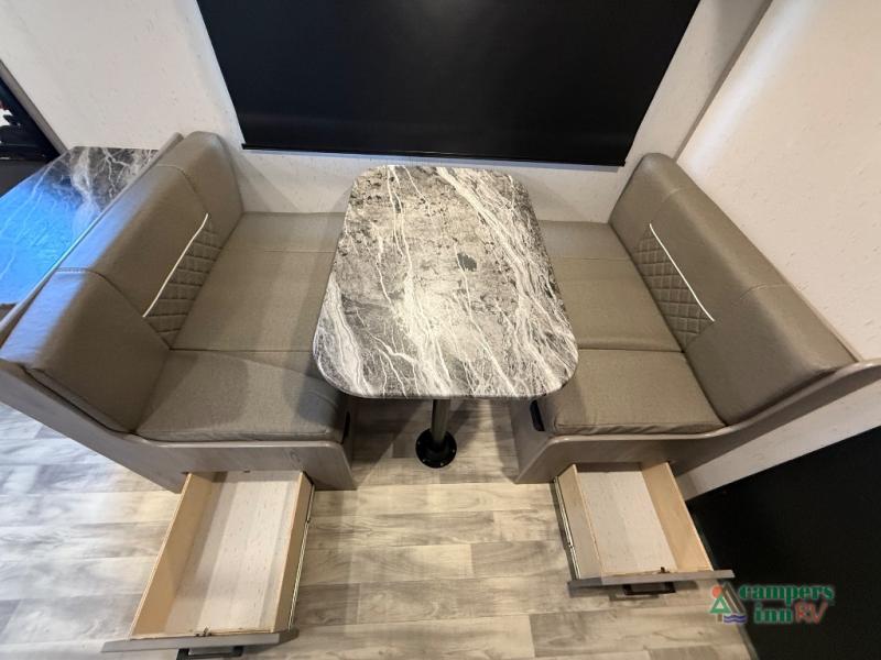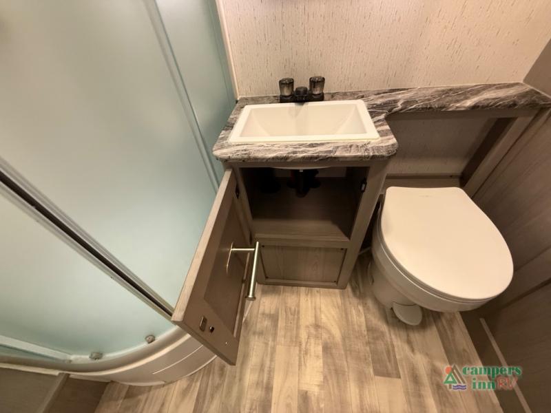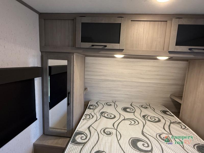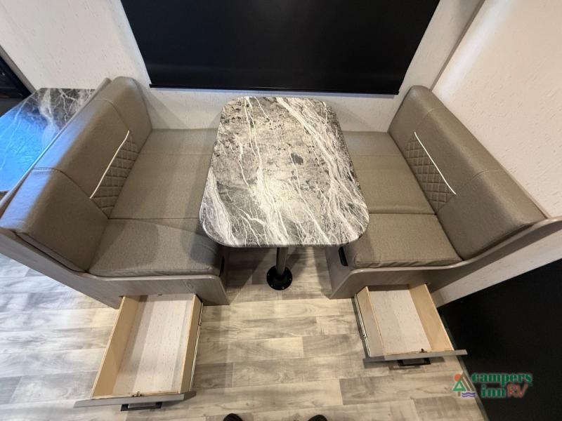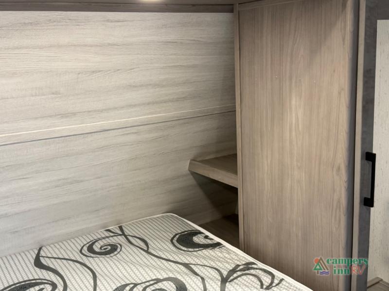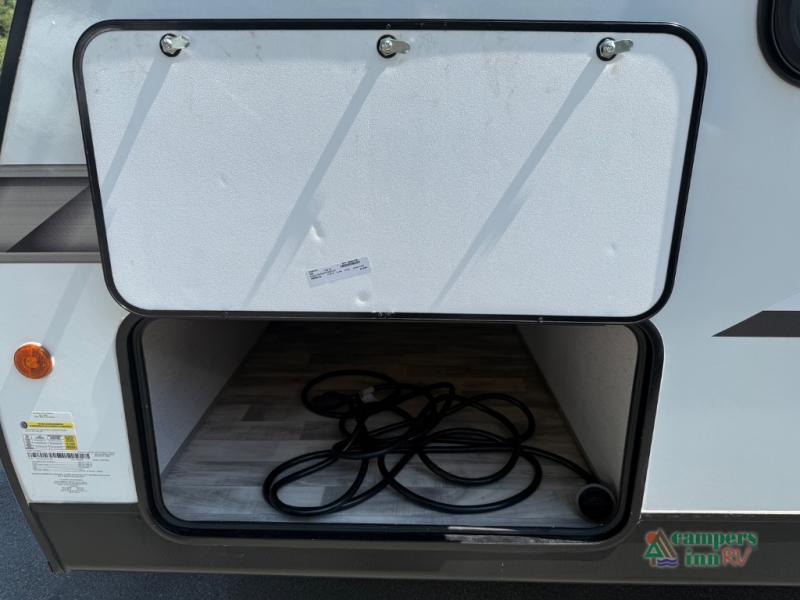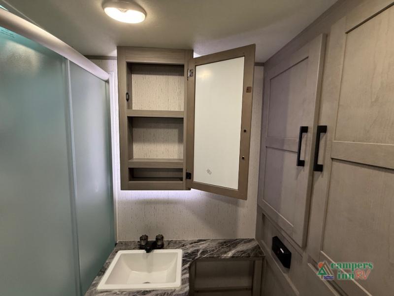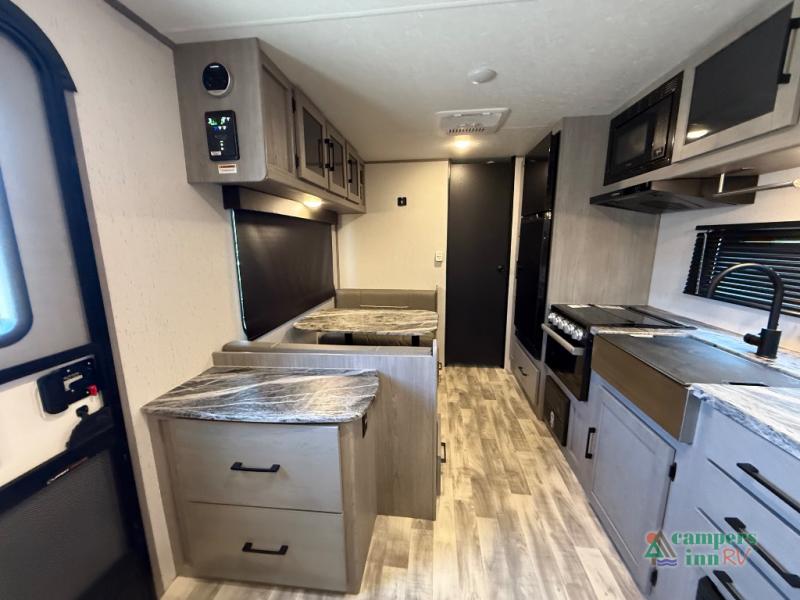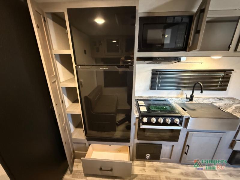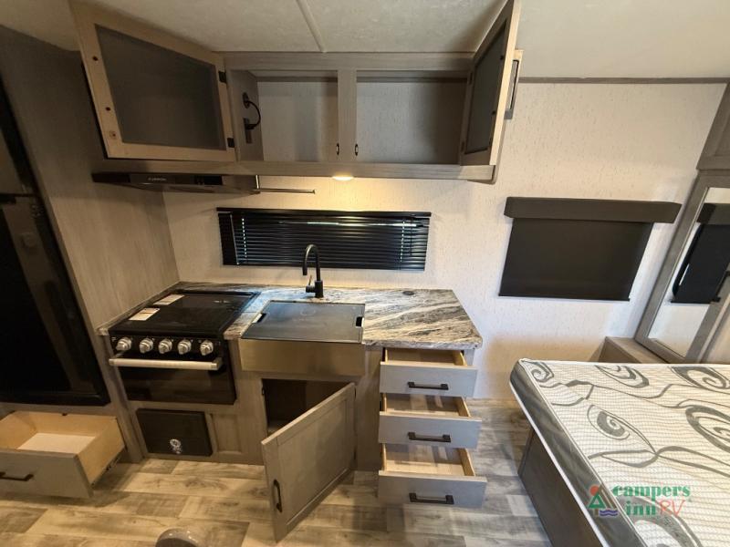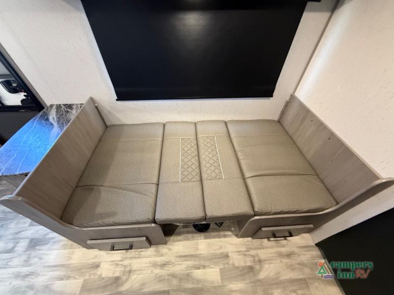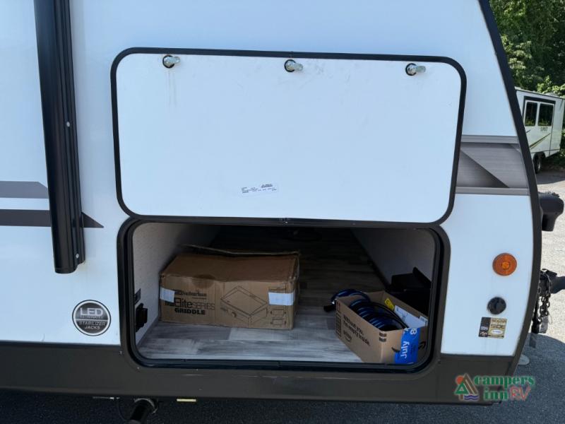 This couple's trailer is perfect for weekend excursions or extended getaways at your favorite state park. You will have your own queen bed up front with storage space for your things, and the full rear bath will add privacy and convenience. Prepare your meals on the three burner range or in the microwave oven, and you can dine together at the booth dinette. The dinette can also be used as additional sleeping space for one guest or two kids.