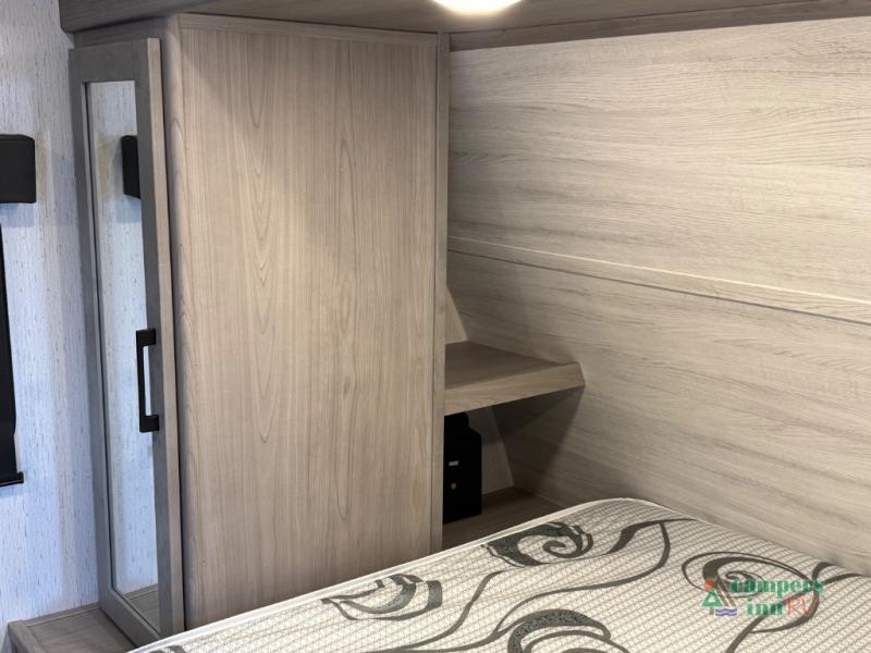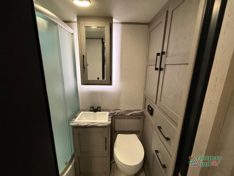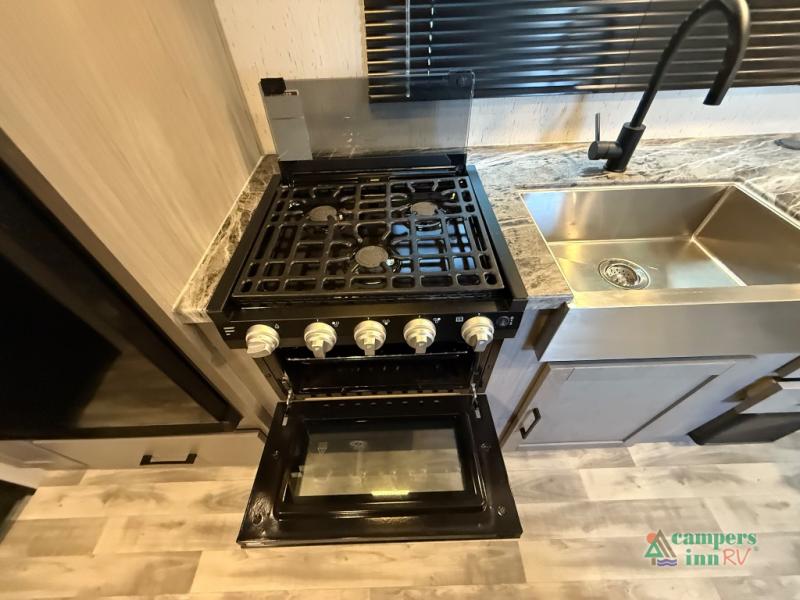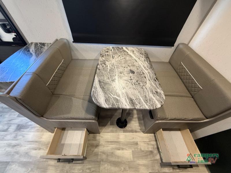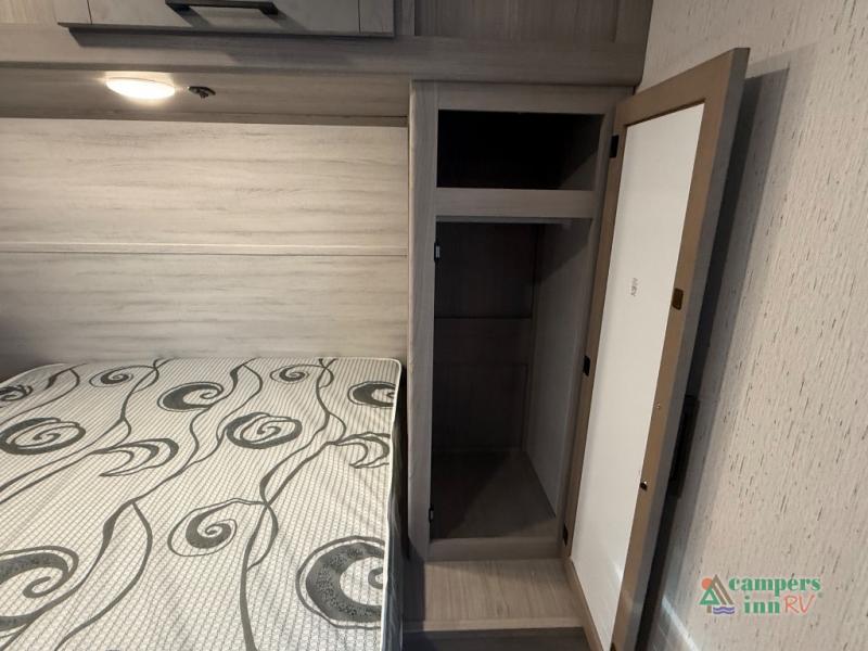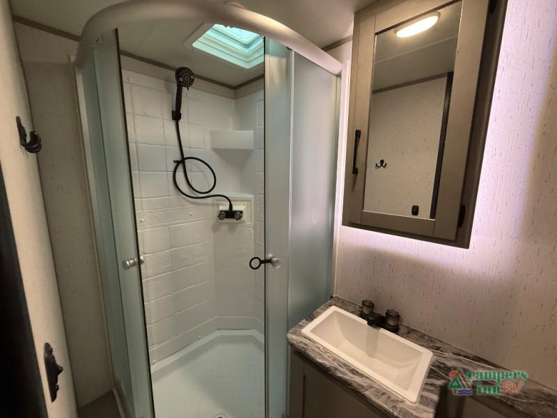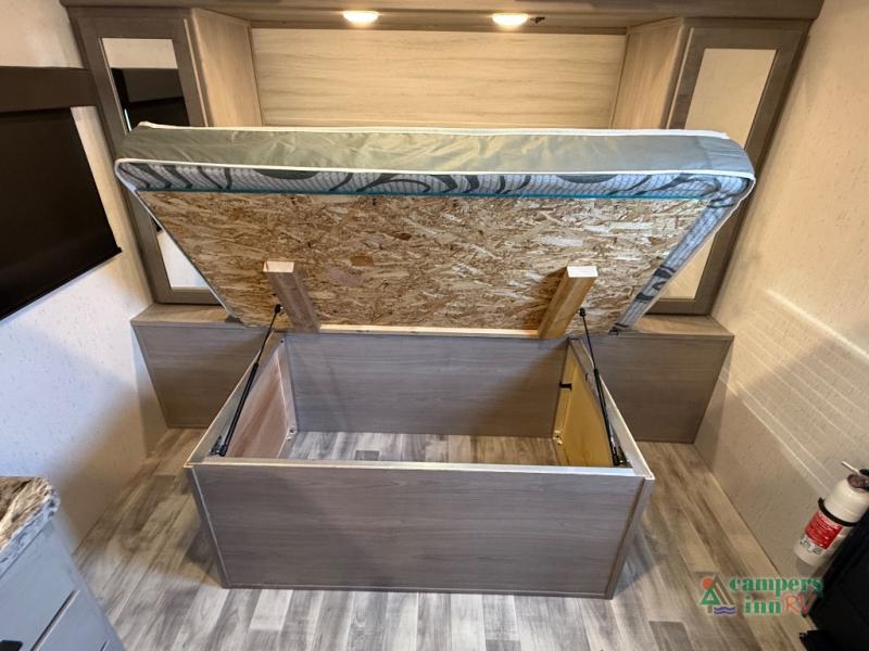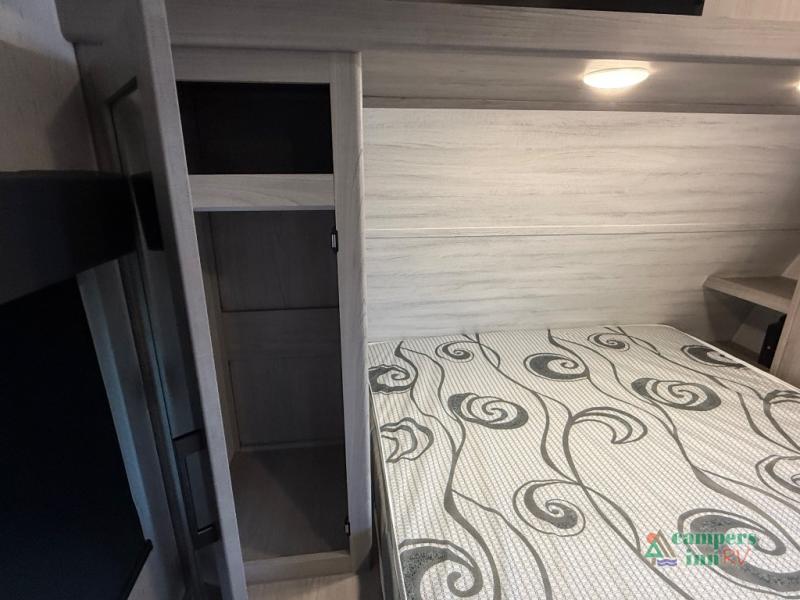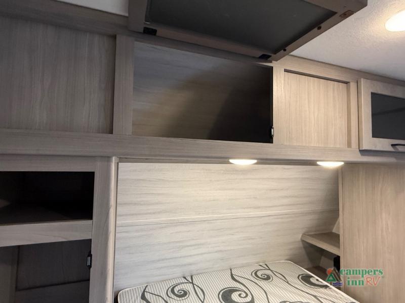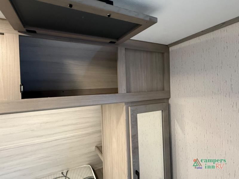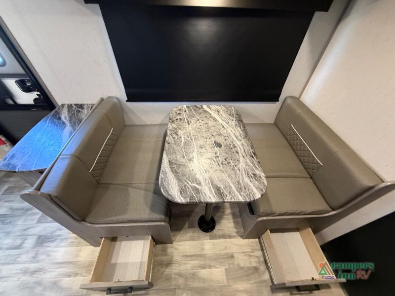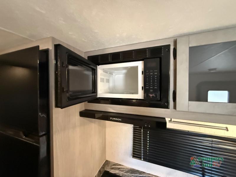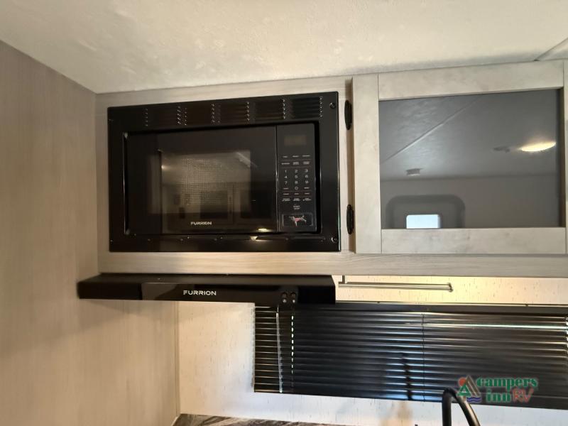 This couple's trailer is perfect for weekend excursions or extended getaways at your favorite state park. You will have your own queen bed up front with storage space for your things, and the full rear bath will add privacy and convenience. Prepare your meals on the three burner range or in the microwave oven, and you can dine together at the booth dinette. The dinette can also be used as additional sleeping space for one guest or two kids.