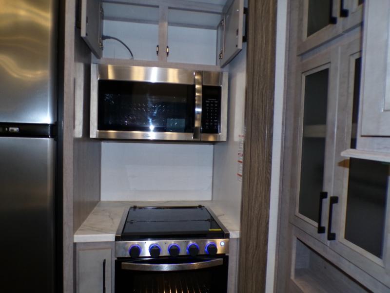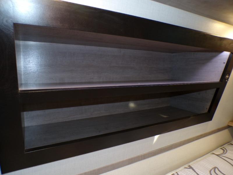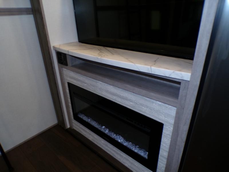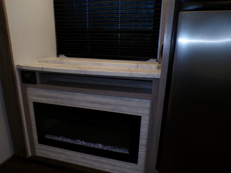 Head to the lake for unforgettable weekends riding the trails and kicking up some mud with this toy hauler in tow! Once you remove your toys from the 13' separate garage, you can set up the roll-over sofas that include a table in between them, and there is a convenient half bath here as well. Your guests can make this their bedroom at night, plus there is a Happi-Jack power bunk and a loft with a twin-size bed for the little ones! The main living area will be a favorite spot to hang since there are dual opposing slides for tons of space, a comfy sofa, plus a 50" TV with a fireplace below it for a more cozy feel. And check out the front private bedroom with a king-size bed and a slide out wardrobe to keep your clothes neat and tidy!