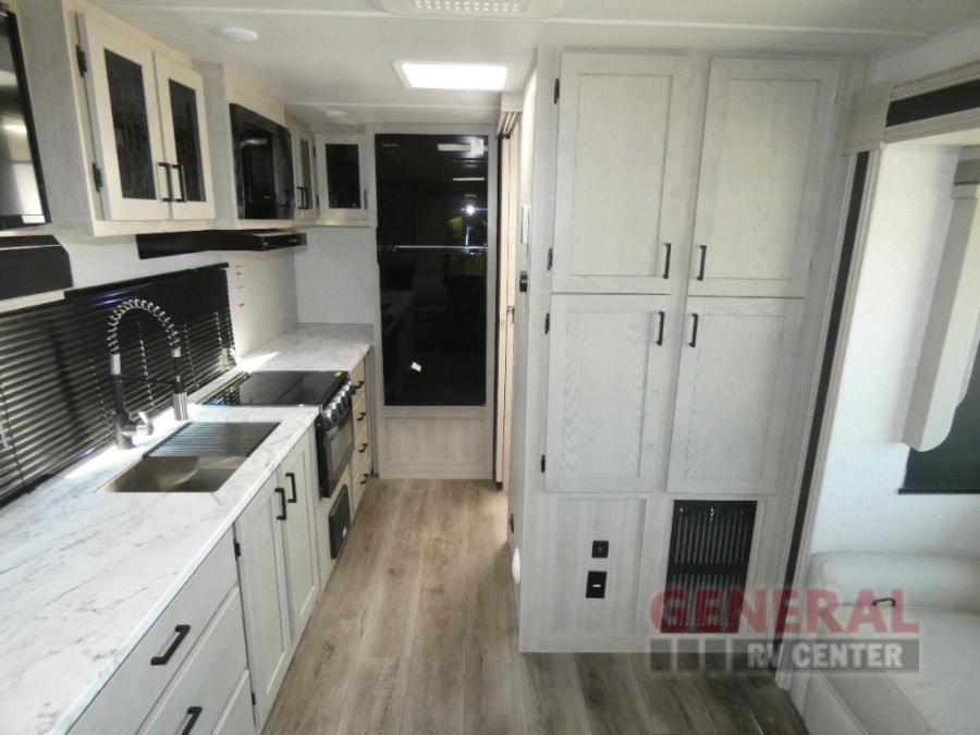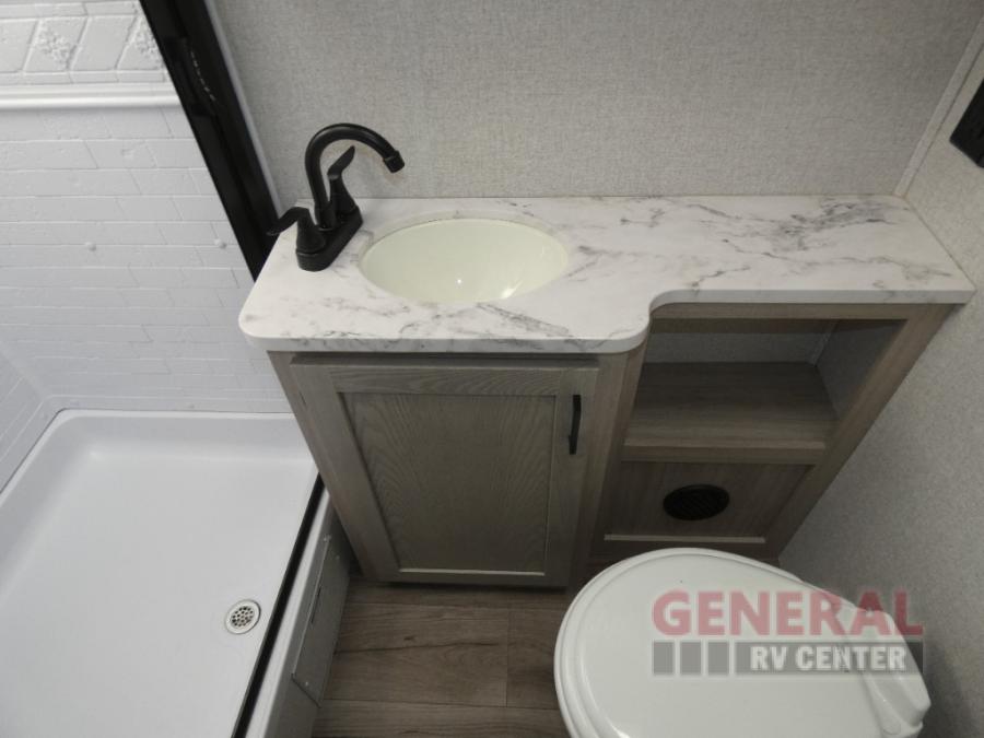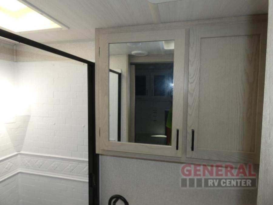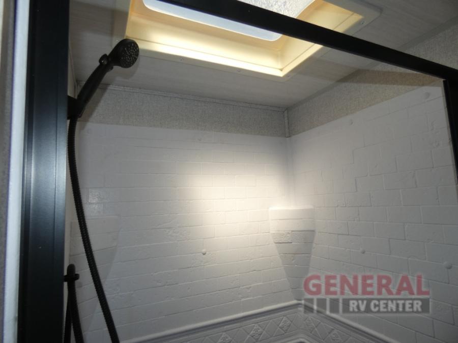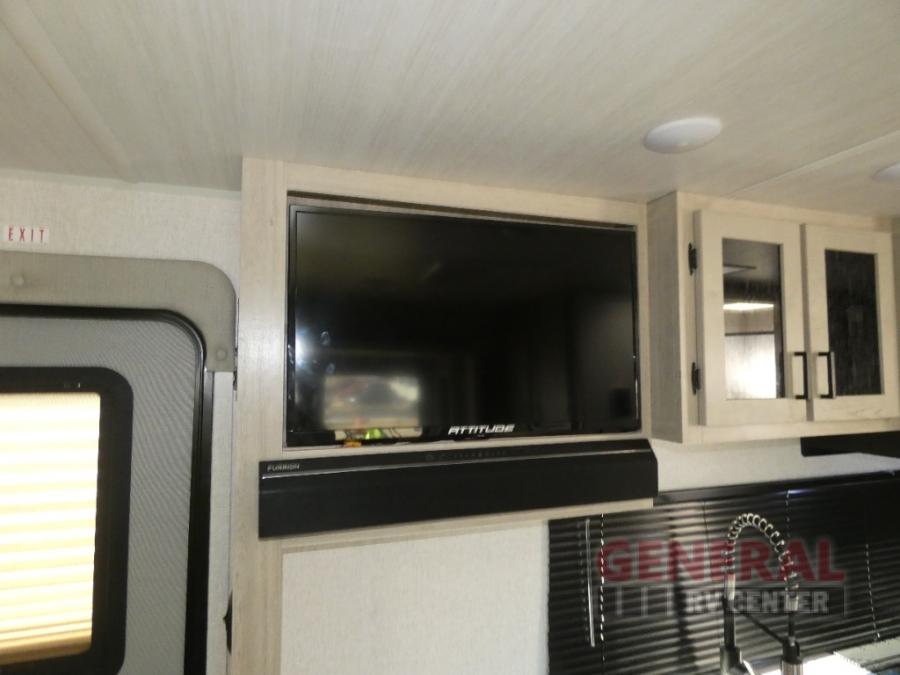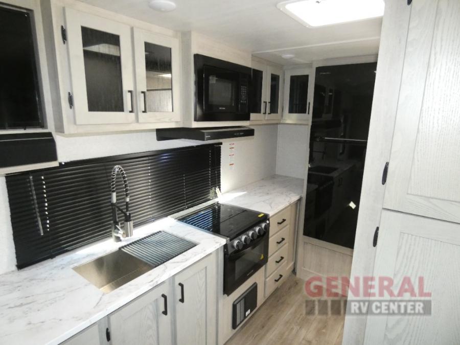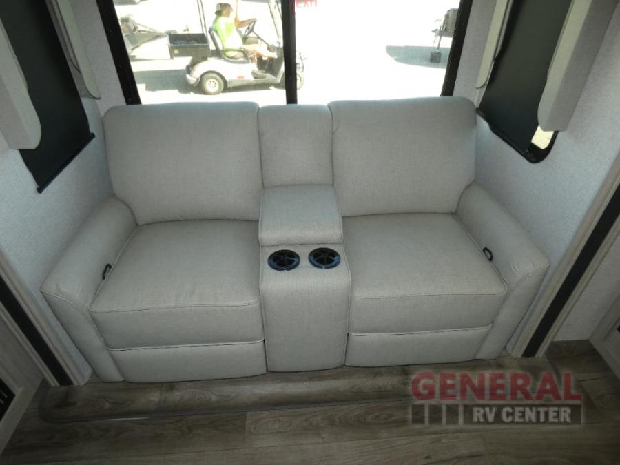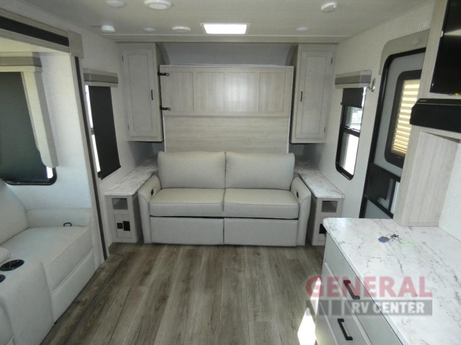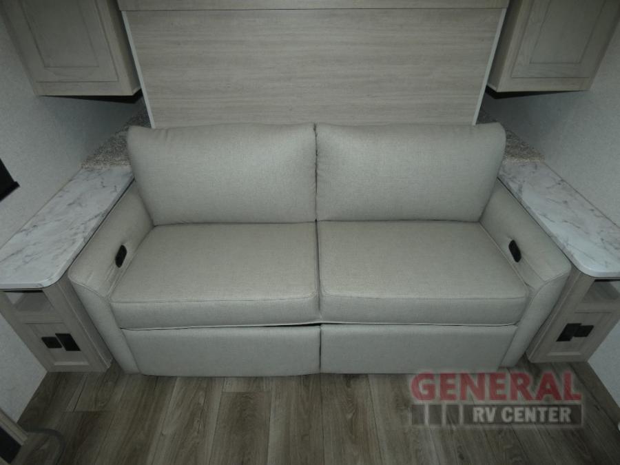 If you're looking for the perfect couple's trailer for weekend getaways you've found it in this Alta model. The queen Murphy bed up front can be folded up in the morning so you can relax on the sofa, or you may just want to enjoy your coffee on the theater seats. Your meals can be prepared on the three burner cooktop or in the microwave oven, and you can dine outdoors under the 16' power awning. This model also includes a universal docking station for an all-in one location for you hookups and utilities. How convenient!