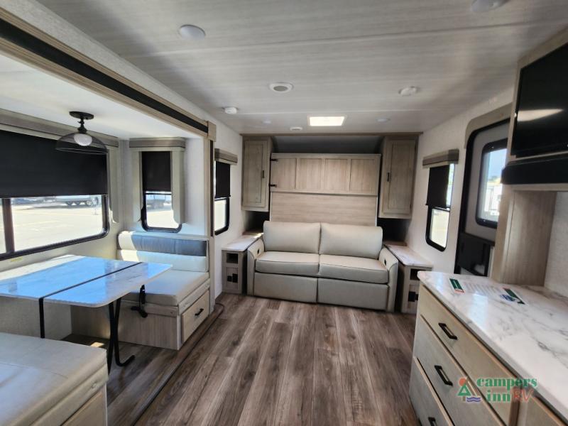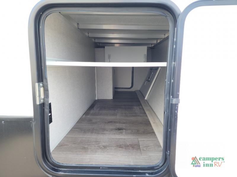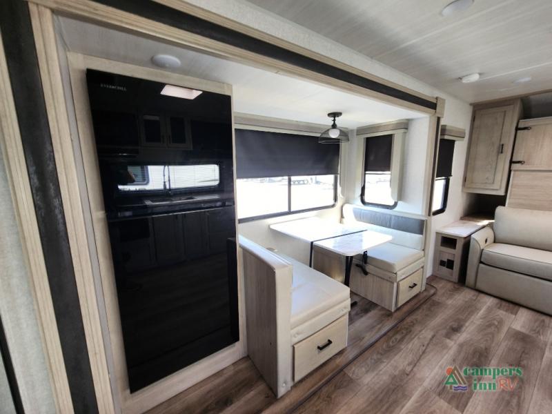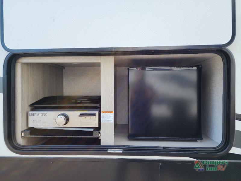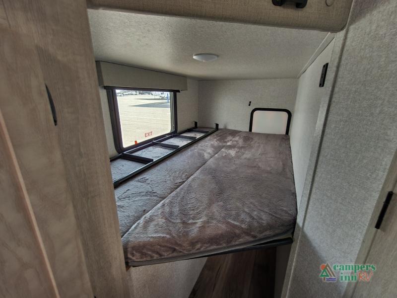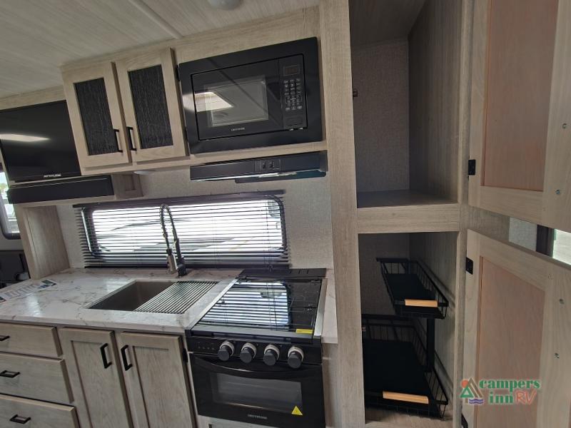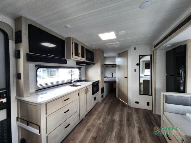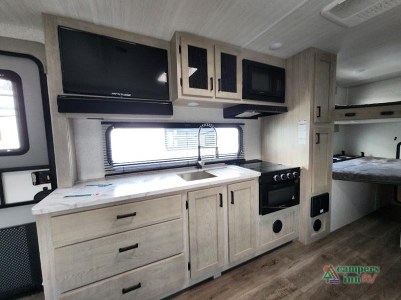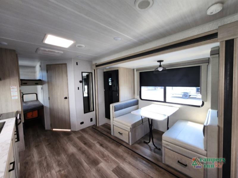 Double over double bunks are sure to be fun for everyone! With a queen Murphy bed that can be hidden away during the day, this travel trailer is versatile. A center kitchen with three-burner cooktop, refrigerator, and pantry will make cooking easy, and the booth dinette is a great choice, or you can exchange it for the optional free-standing dinette. A rear bath has a linen closet for towel storage, and the shower skylight lets the light in. Outside you'll find a whole other set of features, like a outside kitchen, TV hookup, and a storage door that is large enough for bikes or kayaks. Perfect for the outdoor adventure you've been craving!