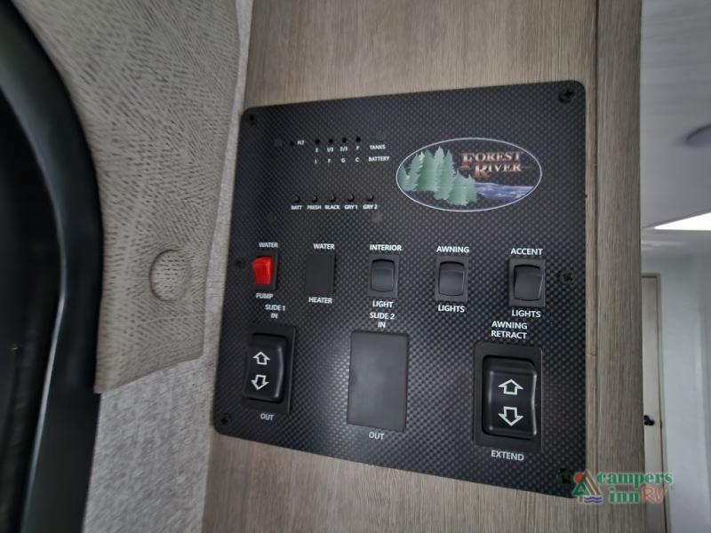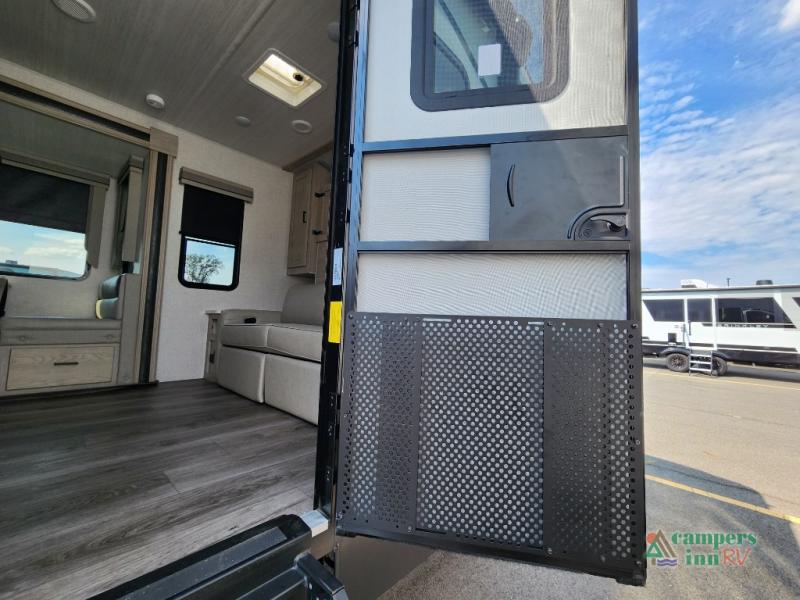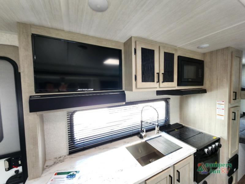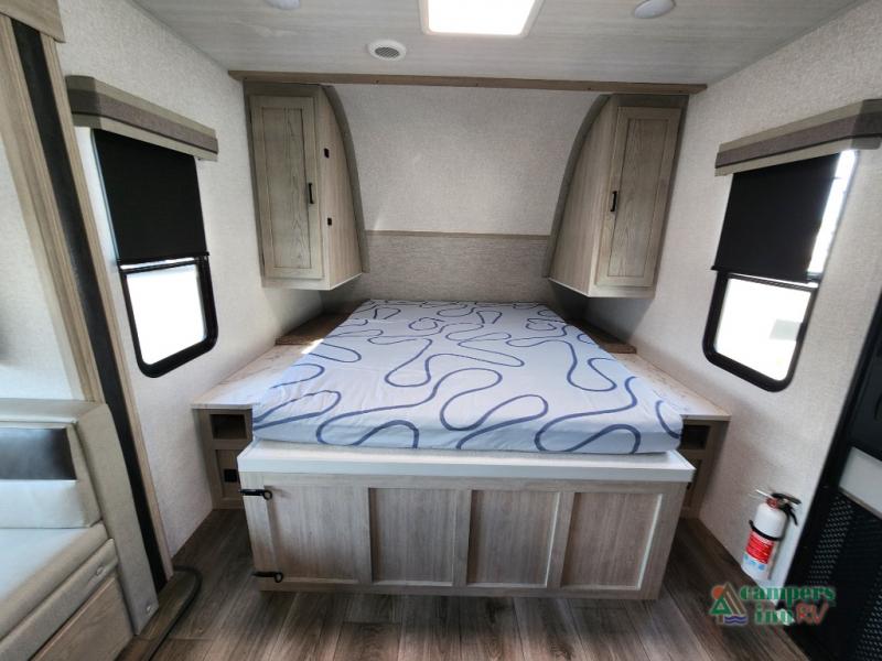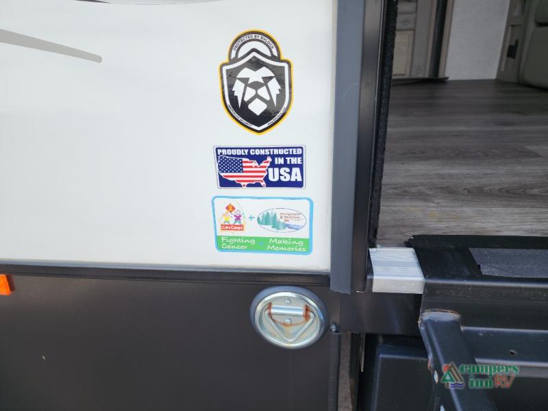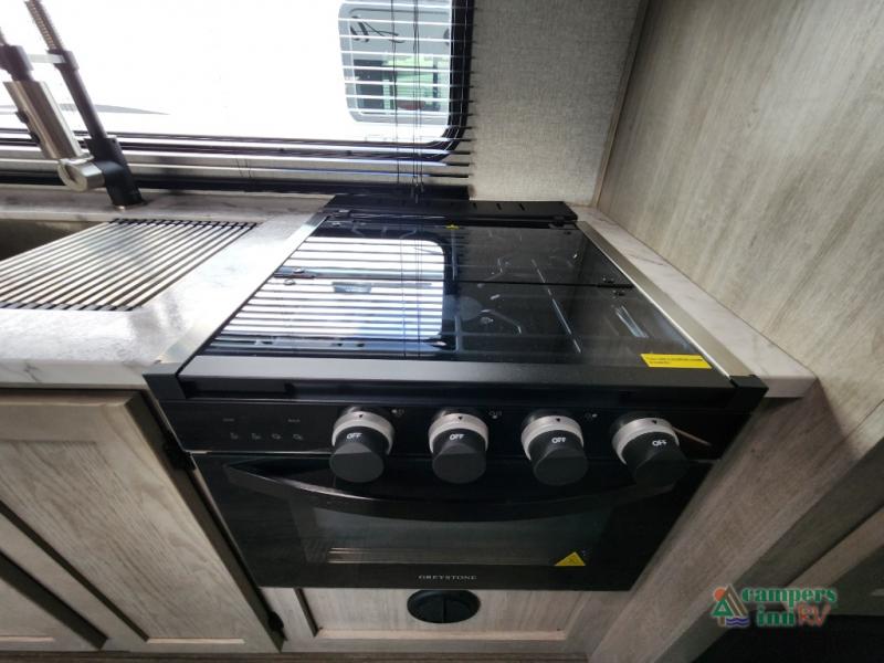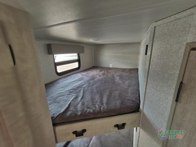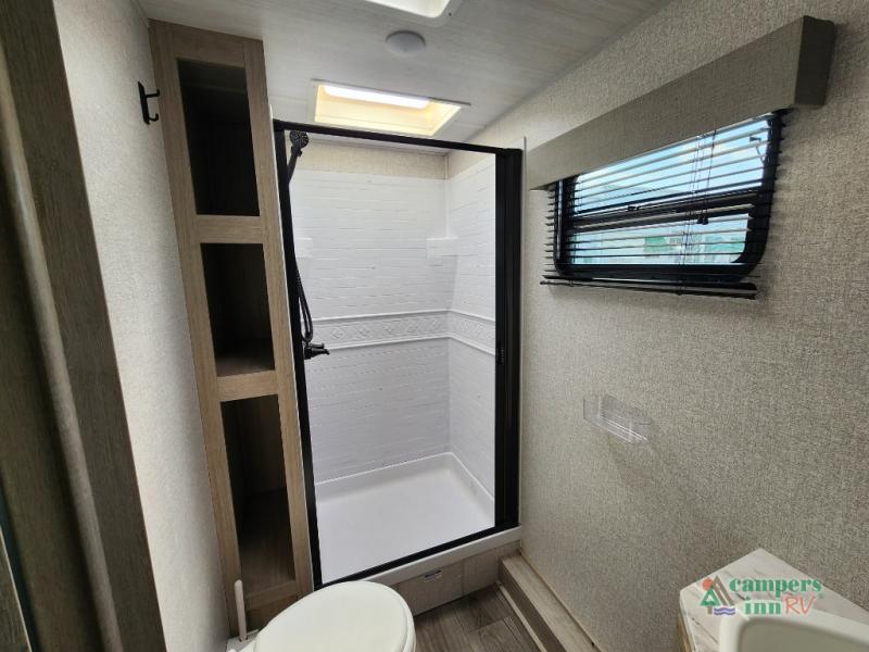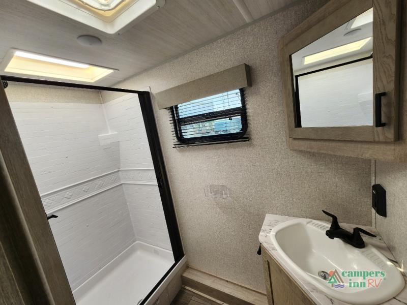 Double over double bunks are sure to be fun for everyone! With a queen Murphy bed that can be hidden away during the day, this travel trailer is versatile. A center kitchen with three-burner cooktop, refrigerator, and pantry will make cooking easy, and the booth dinette is a great choice, or you can exchange it for the optional free-standing dinette. A rear bath has a linen closet for towel storage, and the shower skylight lets the light in. Outside you'll find a whole other set of features, like a outside kitchen, TV hookup, and a storage door that is large enough for bikes or kayaks. Perfect for the outdoor adventure you've been craving!