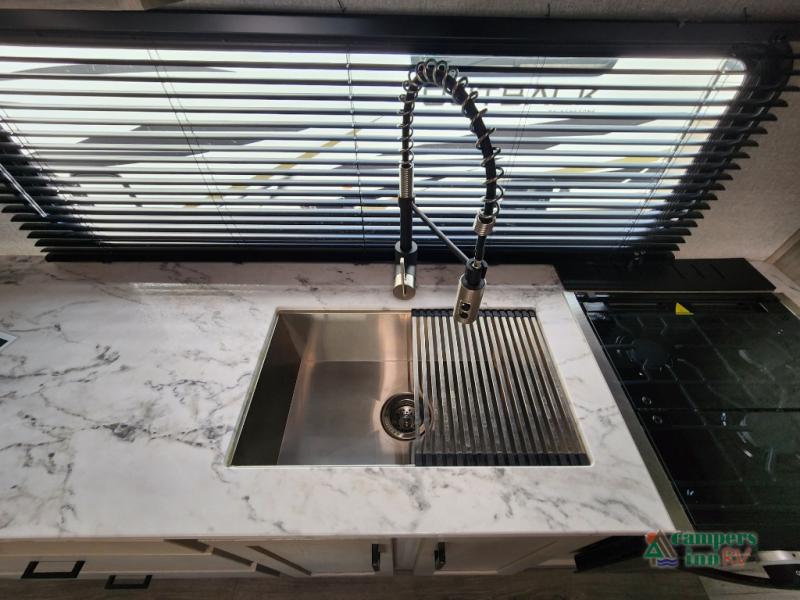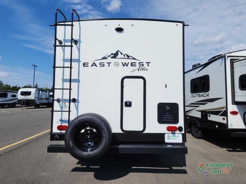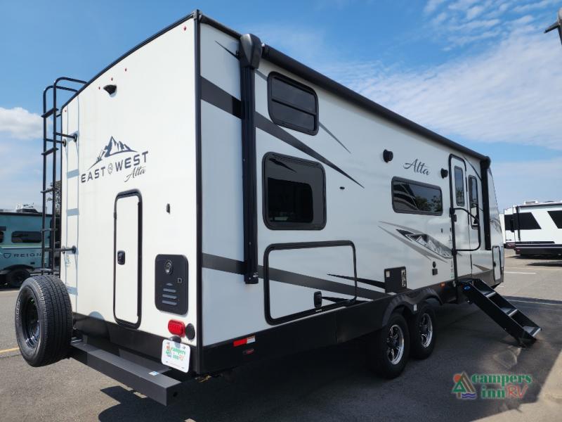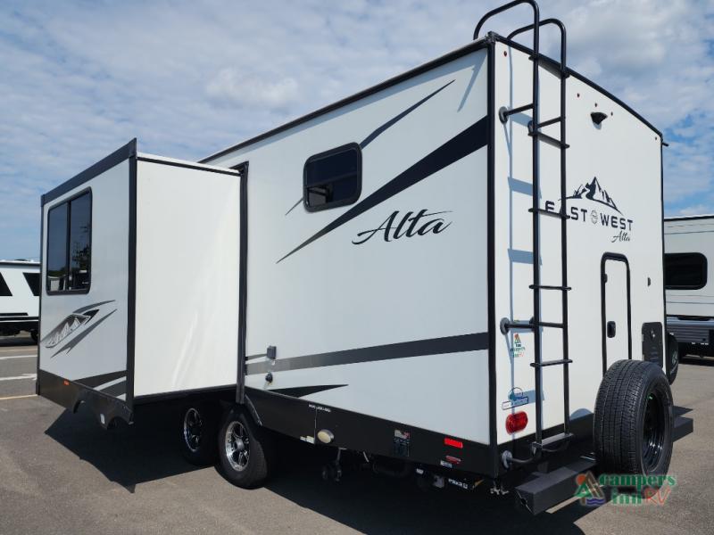 Each Alta travel trailer by EAST TO WEST is constructed with a 5" vacuum bonded roof, flush floor slide outs (where applicable), and diamond plate front rock guard for added protection. Outside, you'll find marine-grade exterior speakers, a universal docking station, and back-up camera prep that can be added to make maneuvering in and out of campgrounds easier than ever. There are USB charging stations for your tablet or phone and designer solid surface countertops you are sure to love. The furnace and 15,000 BTU ducted A/C with quick cool will keep you comfortable in any season, and the 81" interior ceiling height will provide ample space to move about without feeling confined. Start a new adventure in an Alta travel trailer today!