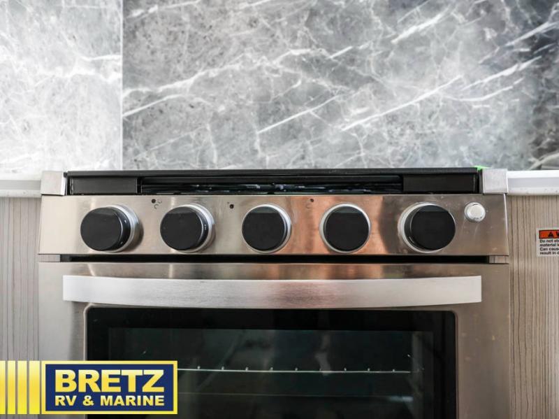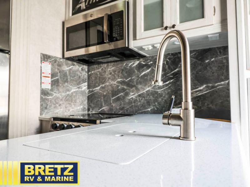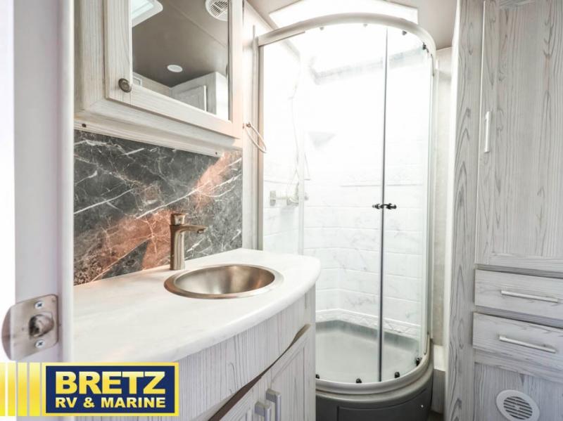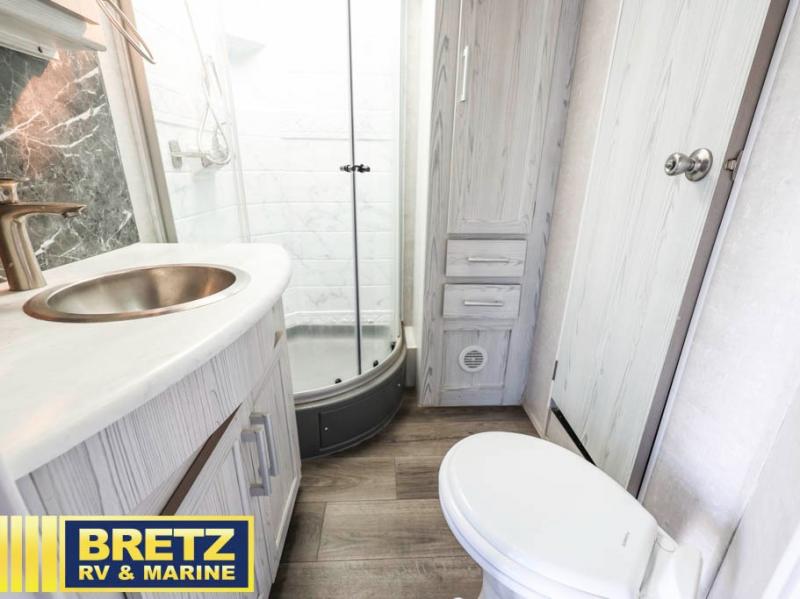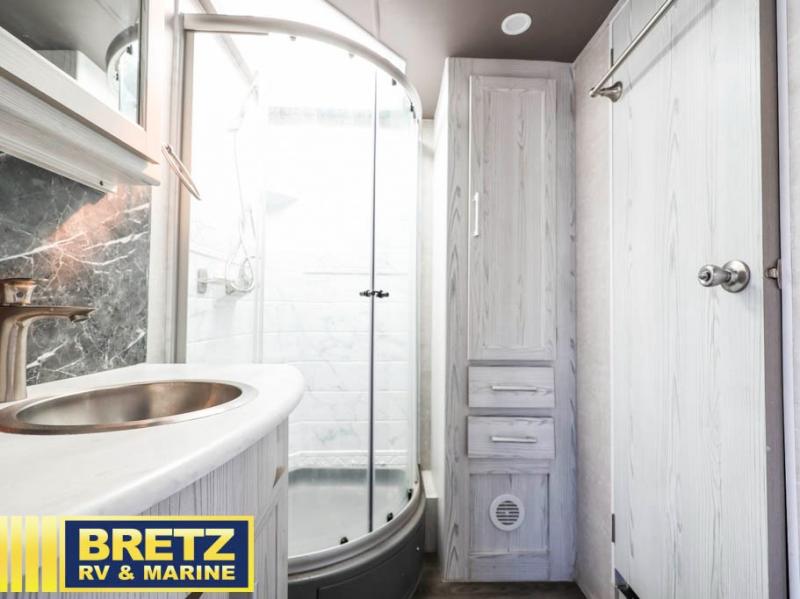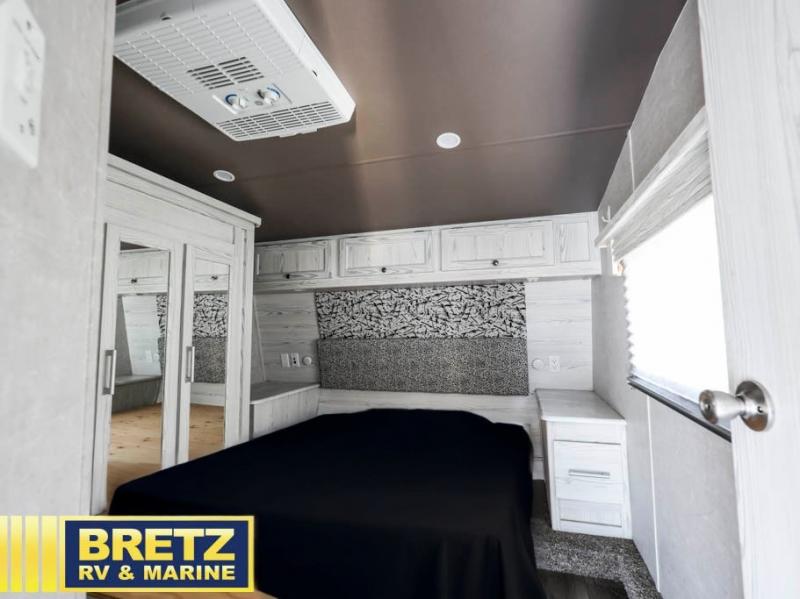 Family outdoor fun with your toys and camping with comforts like home can be found when you have this fifth wheel set up! You will have your own privacy in the front bedroom when you like, plus a queen bed to sleep on while the kiddos sleep on the electric bed above the dinette seats. Someone might even sleep on the sofa within the slide. Make warm meals using the kitchen amenities, and the peninsula counter offers space to prepare and serve food plus dry the dishes. You will find storage throughout in overhead cabinets, and the front bedroom even offers a wardrobe slide option for more floor space and storage. And don't forget about the 16' to 19'8" of cargo space for your toys to travel safely!