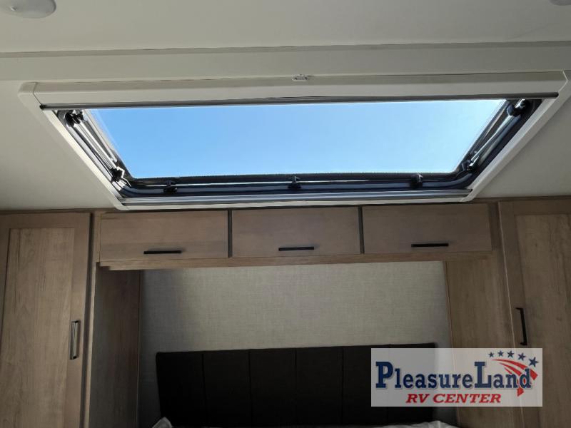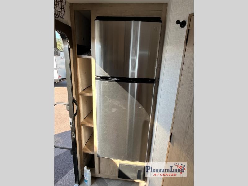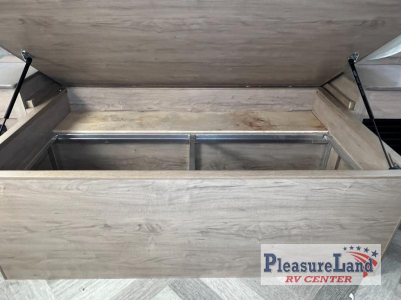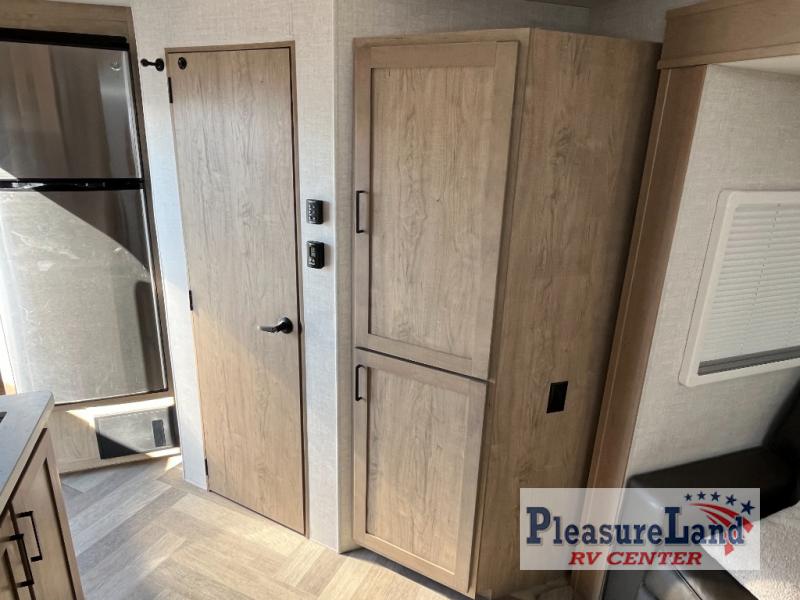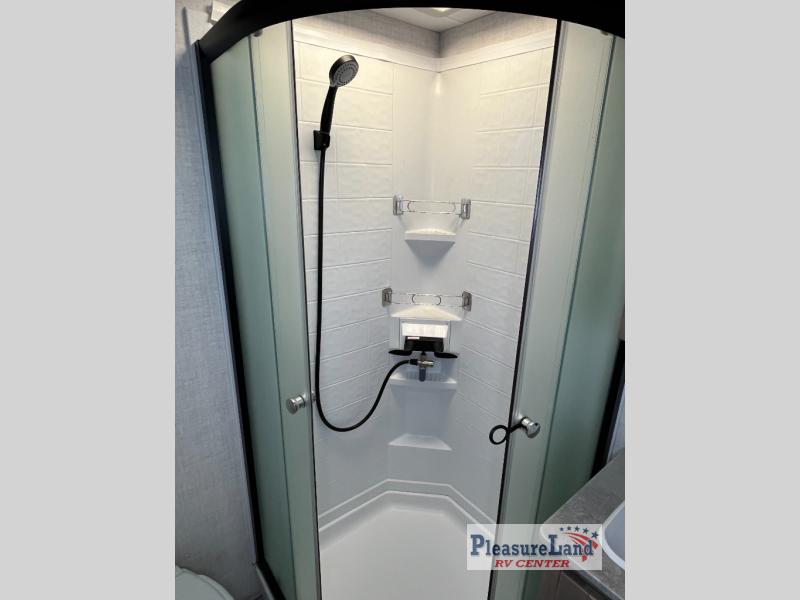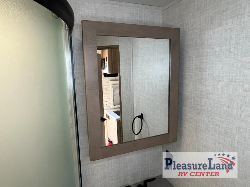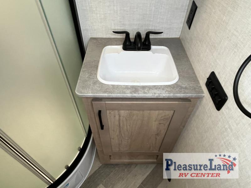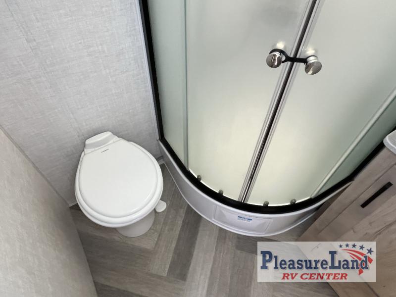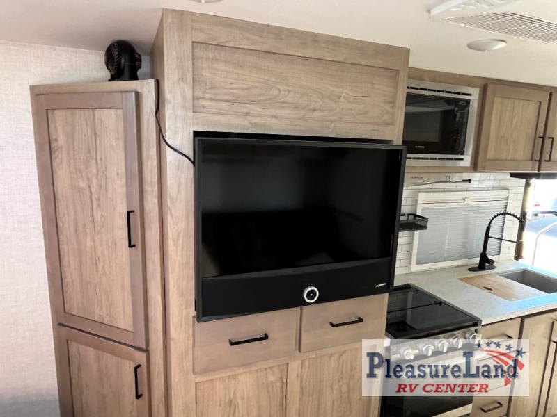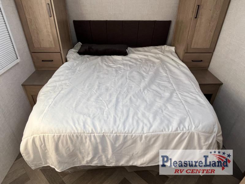 This is the perfect couple's travel trailer! It features a front queen bed with nightstands on either side and a "Stargazer" skylight so you can look up at the stars in the comfort of your own bed. Prepare a delicious home cooked meal with the three burner cooktop then relax on the theater sofa slide across from 12V HDTV/AV system on hinge with a hidden wardrobe behind it. If you add the optional outside kitchen then you can cook on the griddle and enjoy a cold beverage from the 1.6 cu. ft. refrigerator. The rear corner bathroom has a 32" radius shower to freshen up in each morning too!