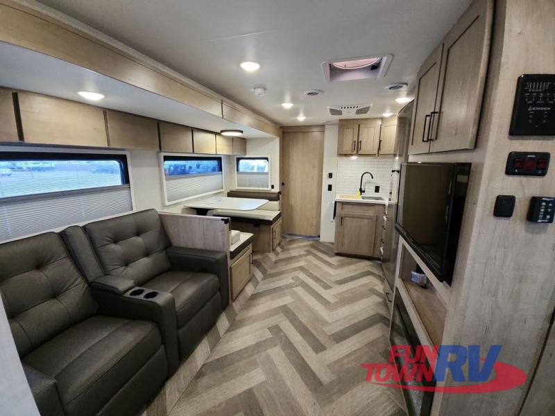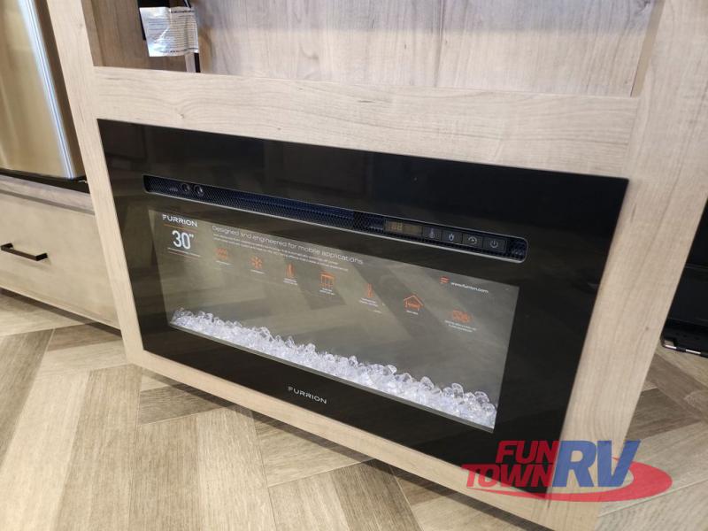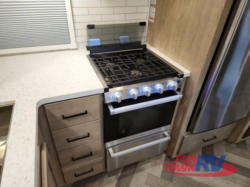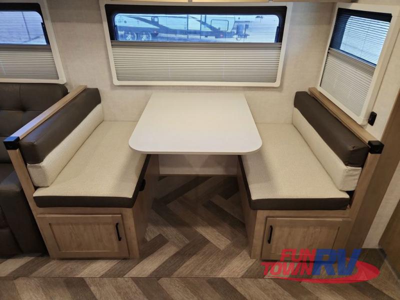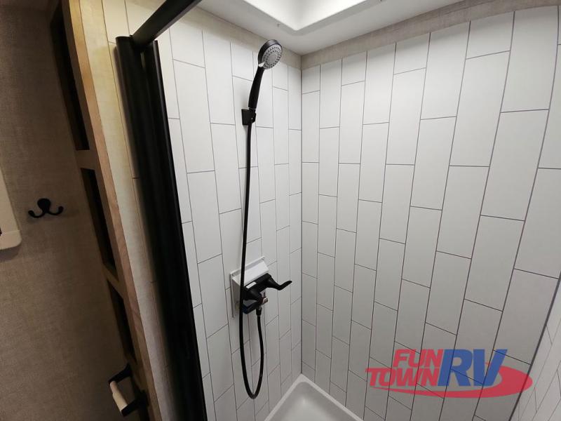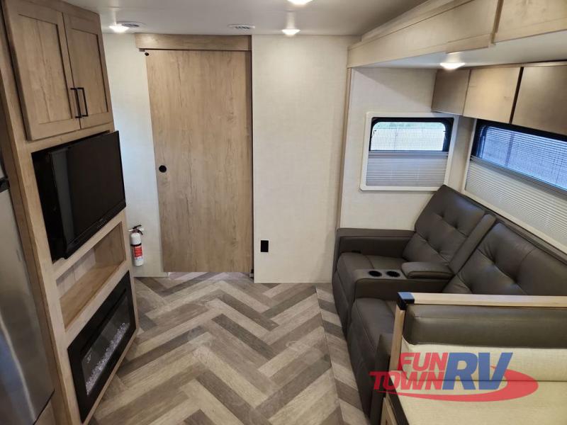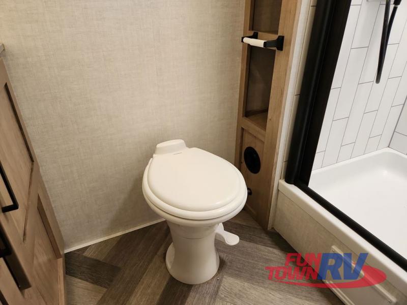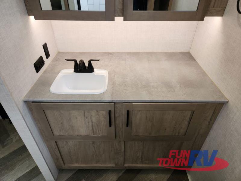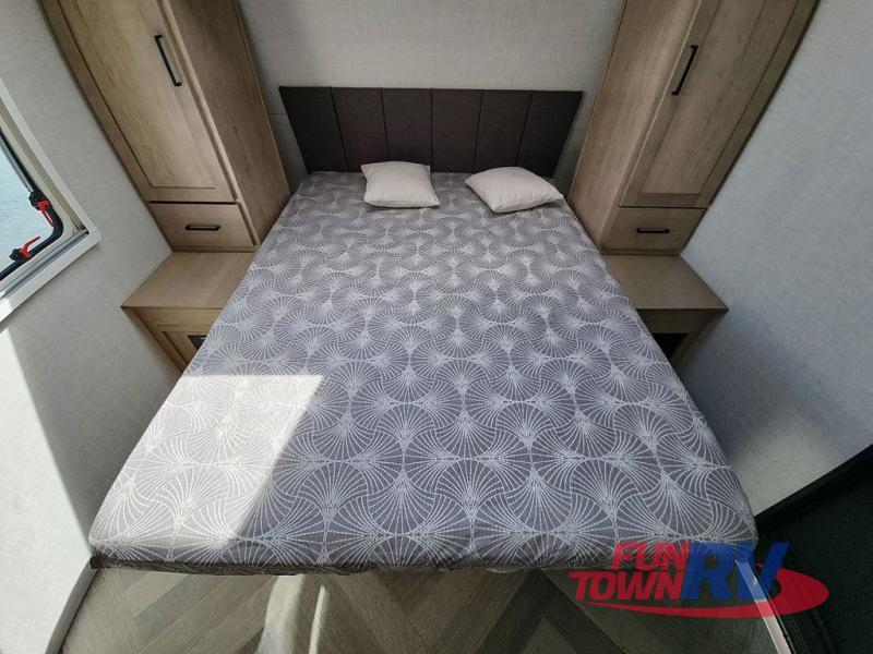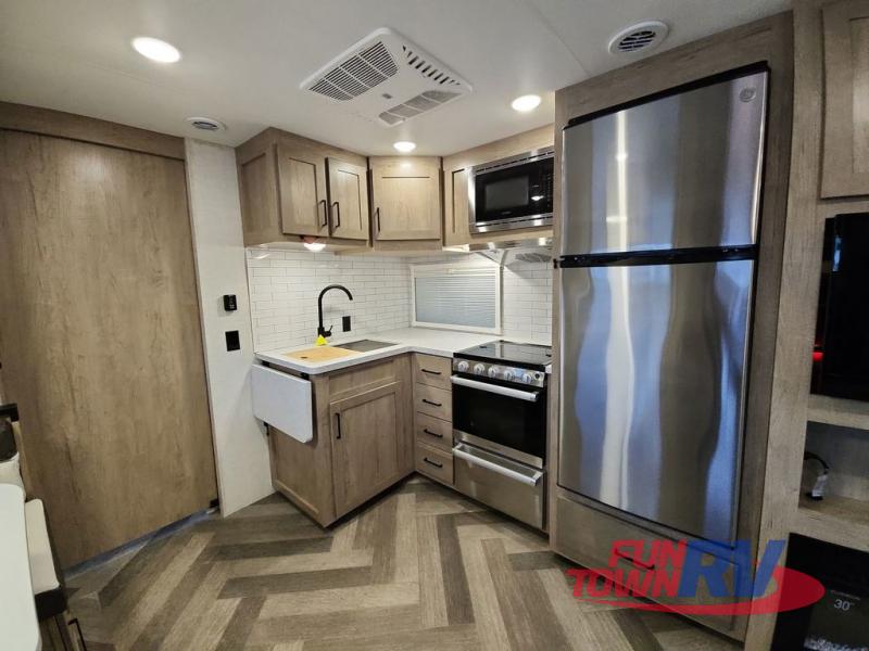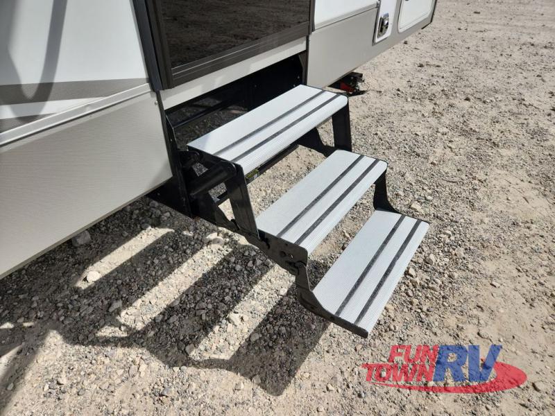 You won't want to camp any other way once you step inside this travel trailer! The front private bedroom will have you feeling right at home with the queen bed that has nightstands on either side and a "Stargazer" skylight above it, plus there is one of the dual entry doors to the unit so you can easily slip out for an early morning walk. After you get back, you can grab some eggs from the 12V refrigerator and fry them up on the three burner cooktop then eat them at the legless dinette or you can switch it out for an optional free standing table and chairs. The theater seating is directly across from the 12V LED HDTV and can also be switched out for an optional hide-a-bed sofa. Clean up in the full bathroom with the 30" x 36" shower after a fun filled day outdoors!
