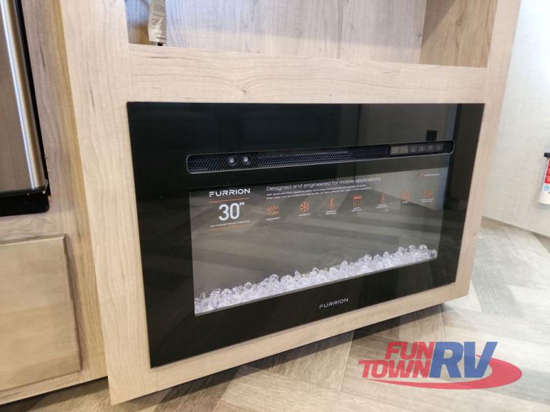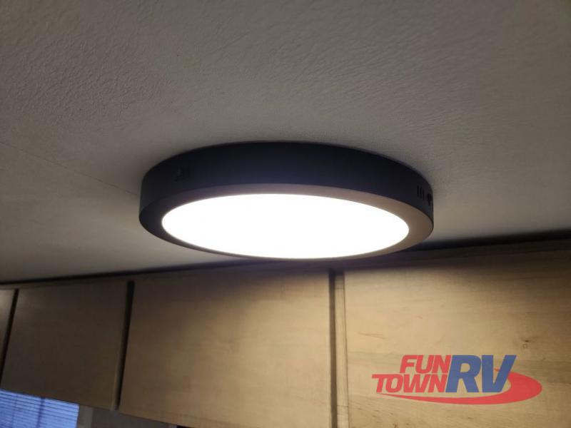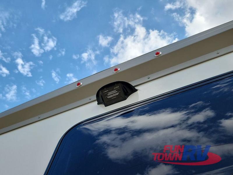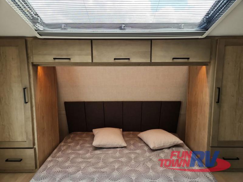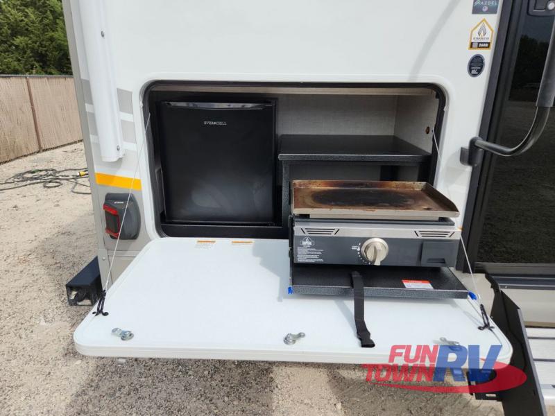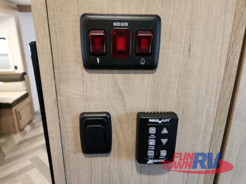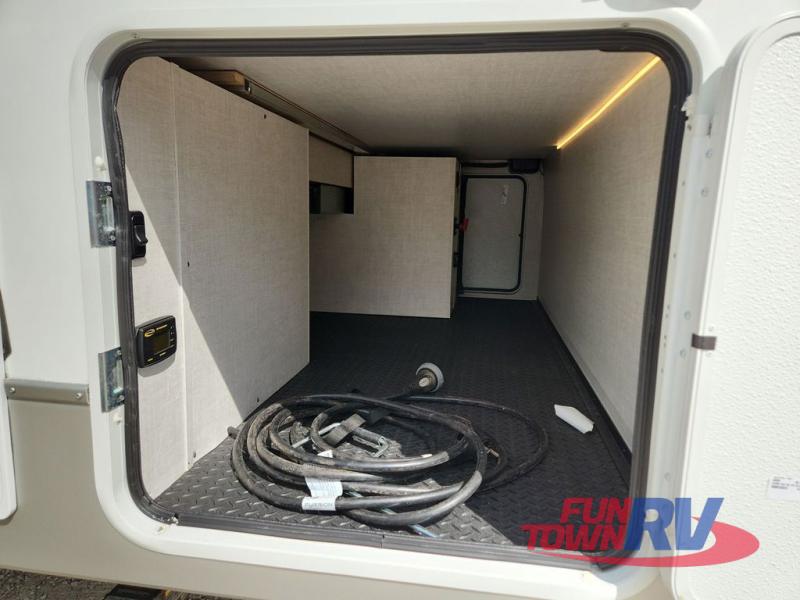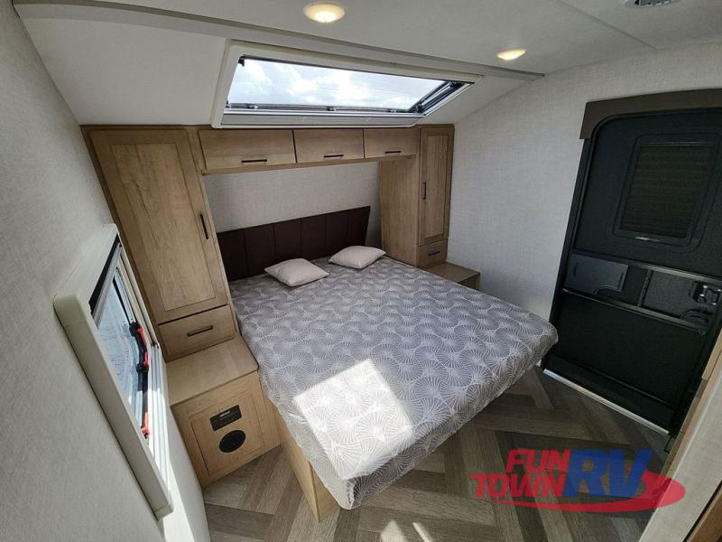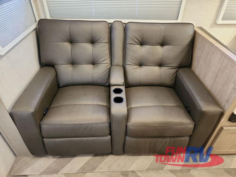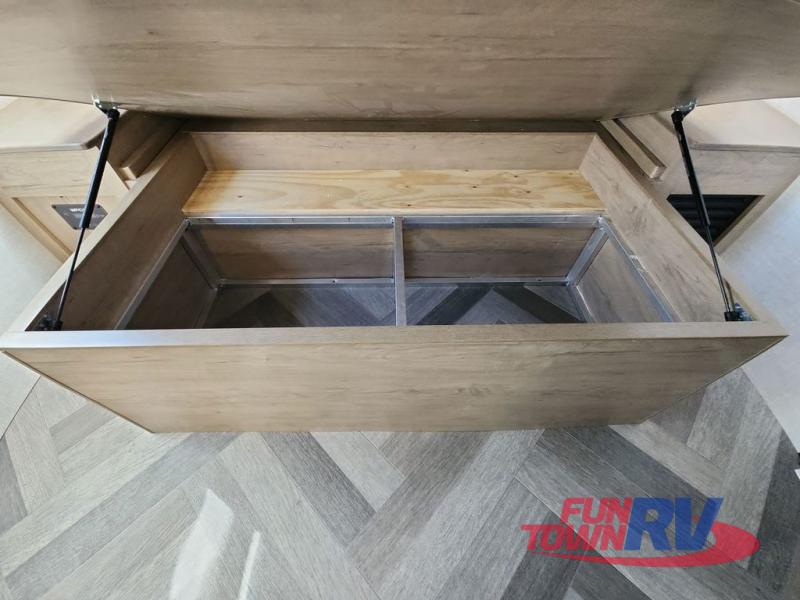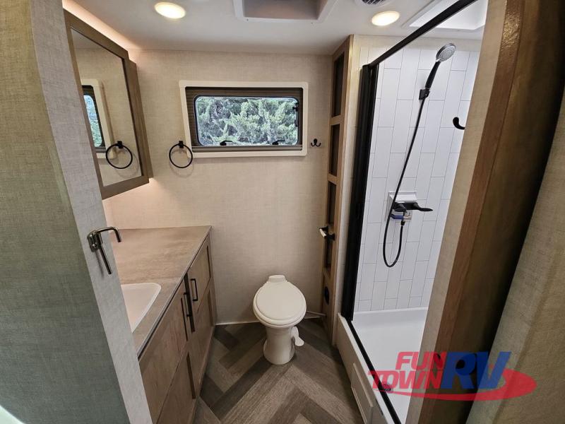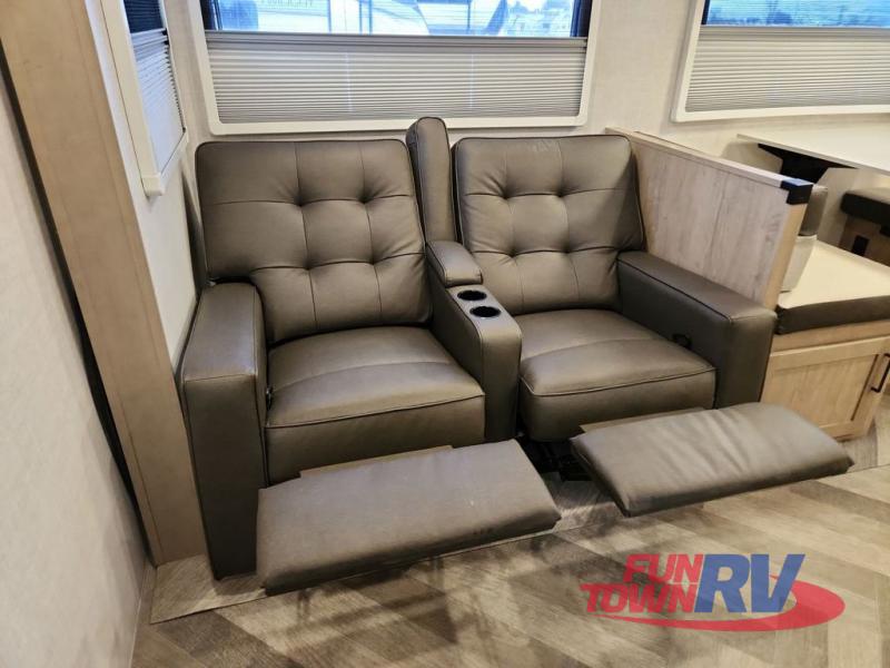 You won't want to camp any other way once you step inside this travel trailer! The front private bedroom will have you feeling right at home with the queen bed that has nightstands on either side and a "Stargazer" skylight above it, plus there is one of the dual entry doors to the unit so you can easily slip out for an early morning walk. After you get back, you can grab some eggs from the 12V refrigerator and fry them up on the three burner cooktop then eat them at the legless dinette or you can switch it out for an optional free standing table and chairs. The theater seating is directly across from the 12V LED HDTV and can also be switched out for an optional hide-a-bed sofa. Clean up in the full bathroom with the 30" x 36" shower after a fun filled day outdoors!