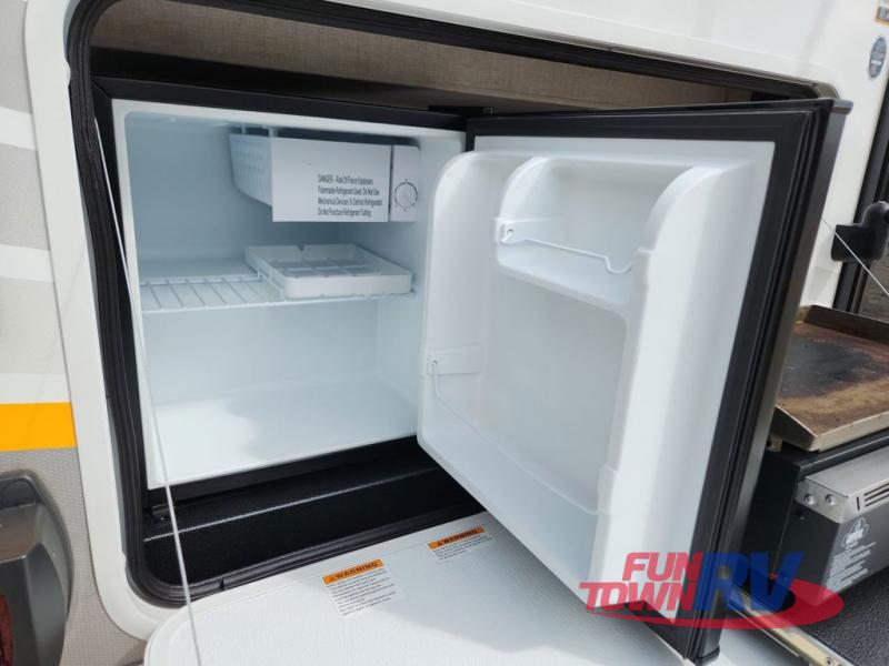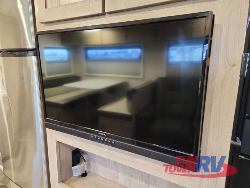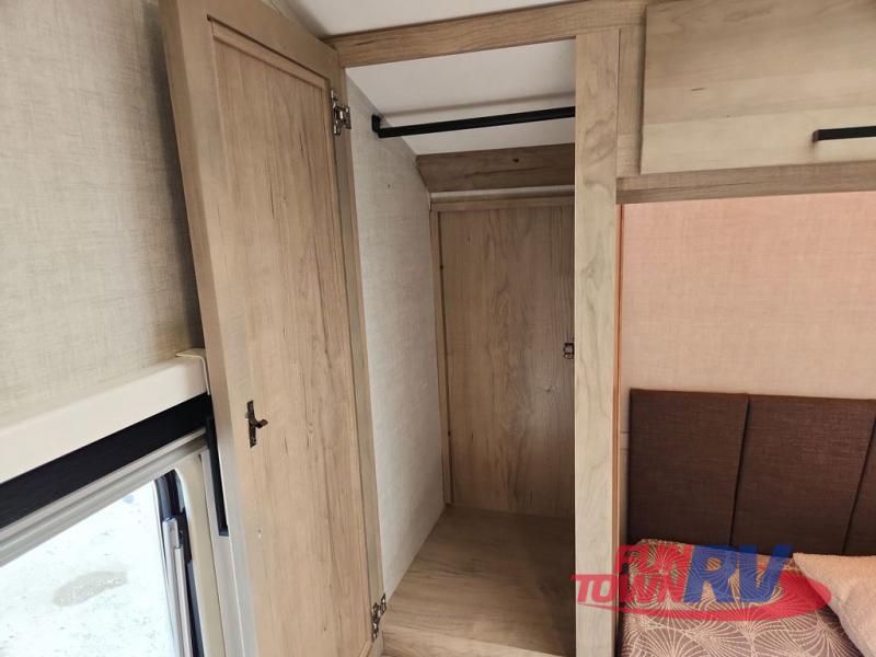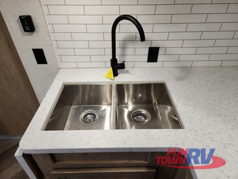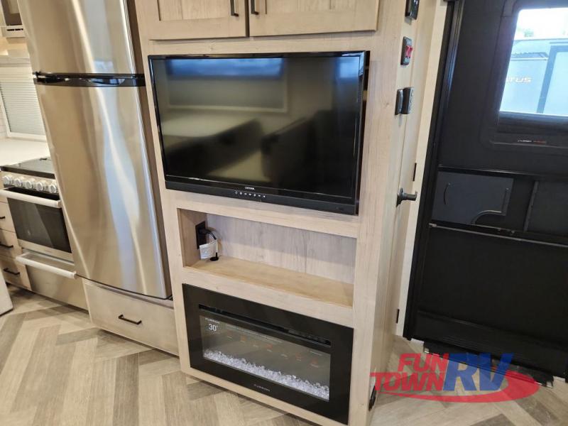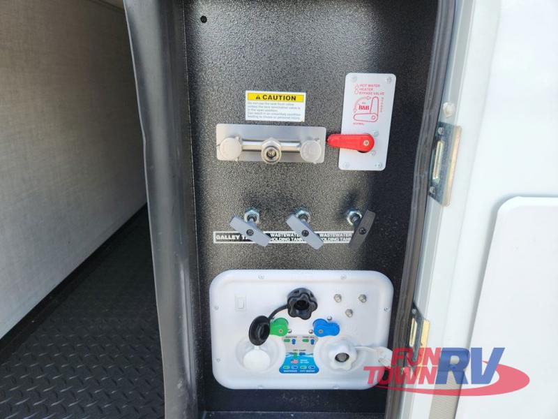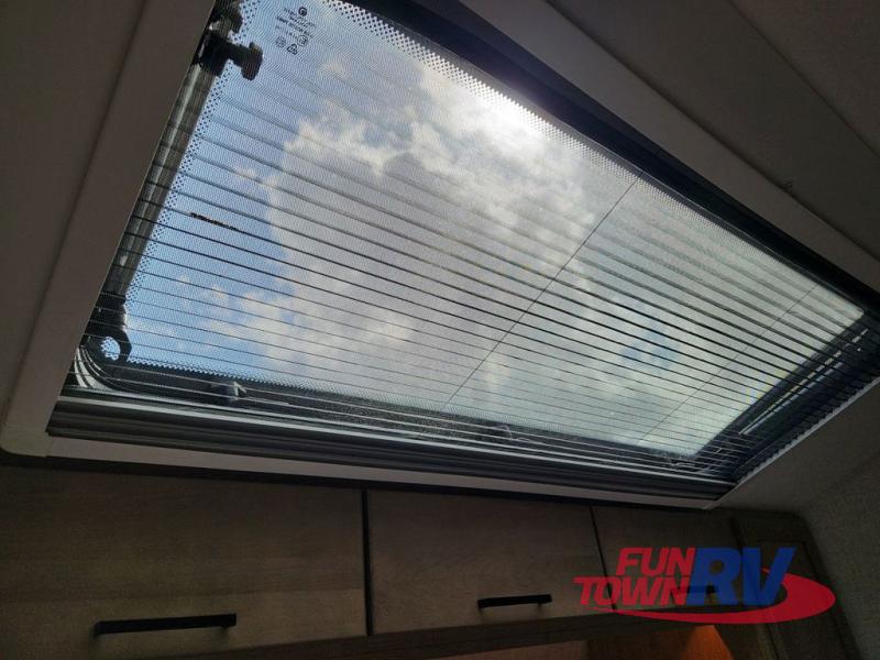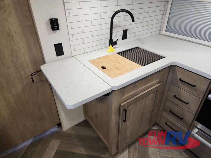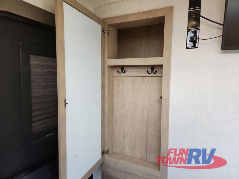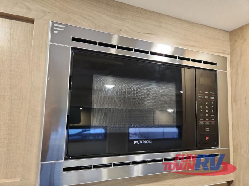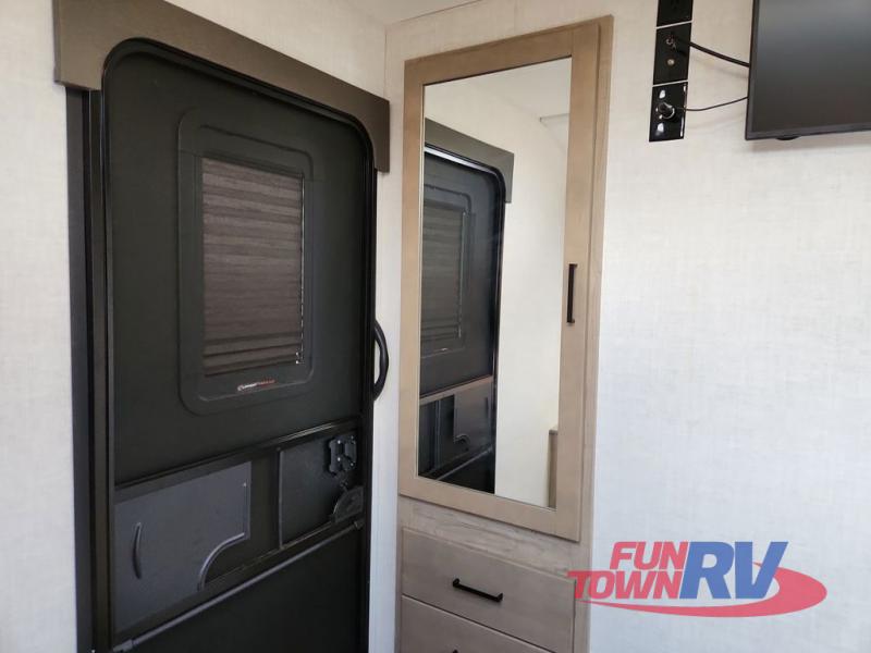You won't want to camp any other way once you step inside this travel trailer! The front private bedroom will have you feeling right at home with the queen bed that has nightstands on either side and a "Stargazer" skylight above it, plus there is one of the dual entry doors to the unit so you can easily slip out for an early morning walk. After you get back, you can grab some eggs from the 12V refrigerator and fry them up on the three burner cooktop then eat them at the legless dinette or you can switch it out for an optional free standing table and chairs. The theater seating is directly across from the 12V LED HDTV and can also be switched out for an optional hide-a-bed sofa. Clean up in the full bathroom with the 30" x 36" shower after a fun filled day outdoors!