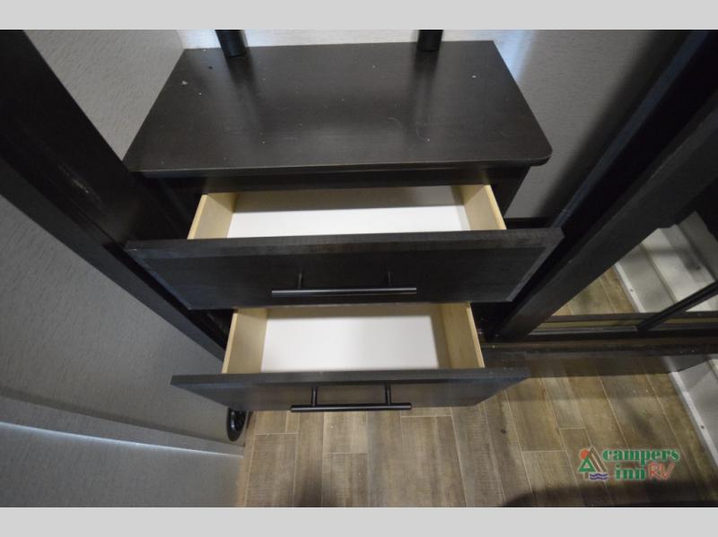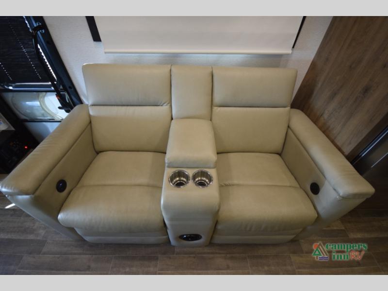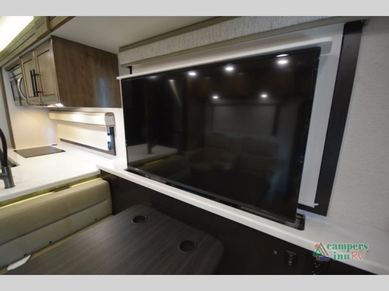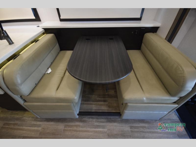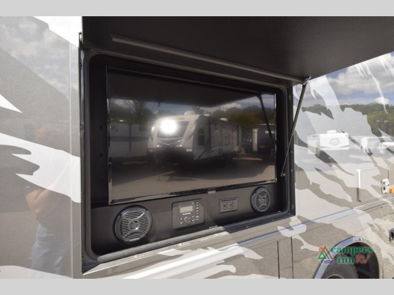 Step inside and discover a spacious interior designed for ultimate relaxation. Kick back on the jack-knife sofa or enjoy a meal at the booth dinette, both perfectly positioned for a front-row seat to the 39" lift TV, which tucks away when not in use. Whether you're streaming your favorite shows or catching the game outside under the stars, the outdoor entertainment center has you covered.