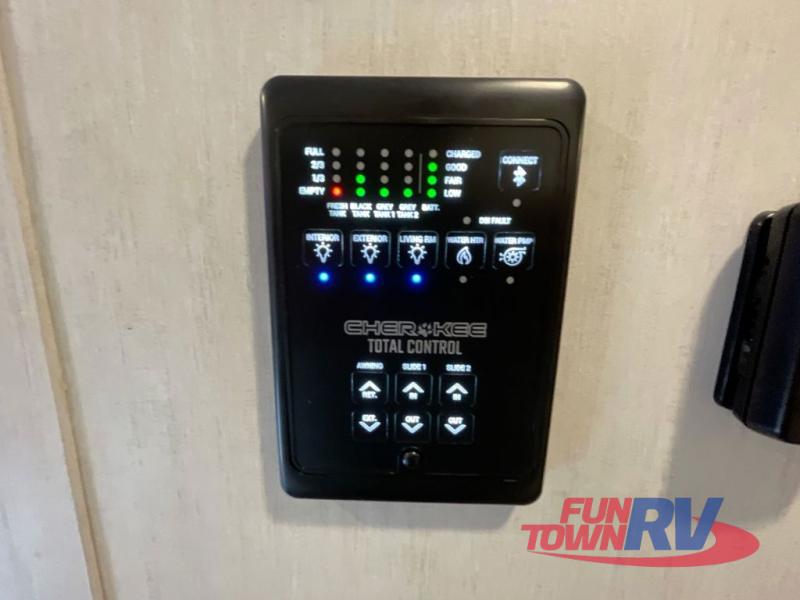 If you want something that is going to accommodate the whole family, check out this Cherokee Arctic Wolf fifth wheel! Not only is there a private bedroom with a residential queen bed for you, but there is also a private bunkhouse with triple bunk beds for any other tired campers. You can even use the tri-fold sofa out in the main living area for additional sleeping space. This main living area has home theater seating across from a fireplace with TV prep, so you can relax in true comfort each night. You can also play a game or put together a puzzle at the free-standing table with two fixed chairs and two folding chairs. This whole area will be kept cool when you switch on the ceiling fan, and if you need to head outside to check on the campfire, you can easily grab your jacket from the entryway coat drop zone and your sandals from the shoe storage under the steps.