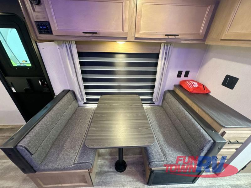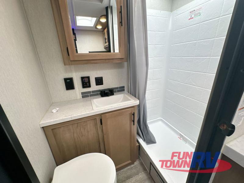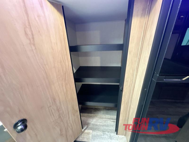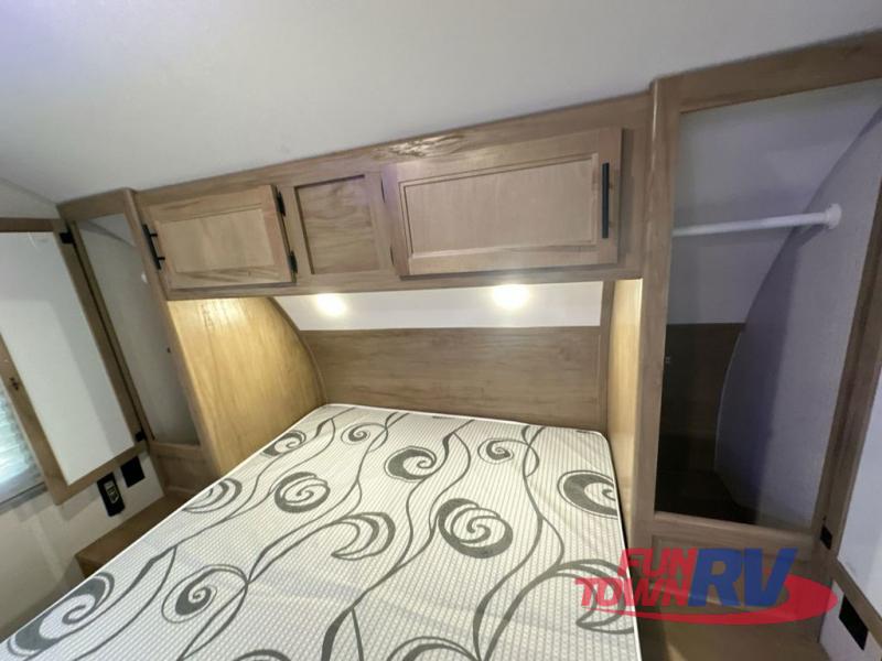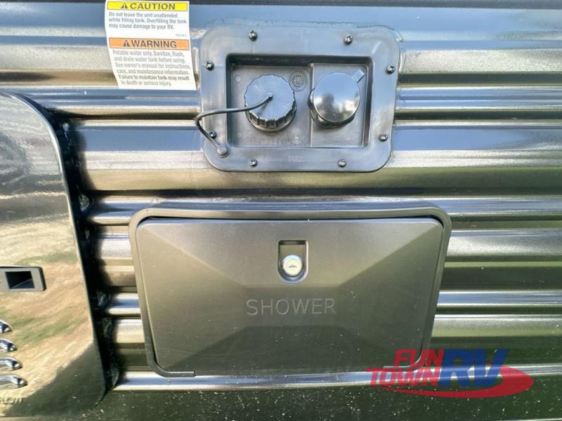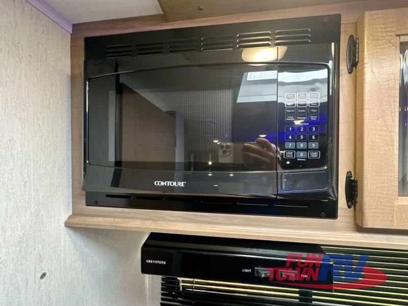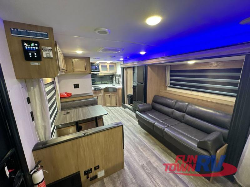 You will love traveling with this Cherokee Grey Wolf in tow. This is a great unit for a couple or family as the booth dinette and sofa can both be used for added sleeping for children or quests if needed. There is a comfortable queen bed up front that you will love for a great night's rest with storage space in nightstands and wardrobes for your clothing and things on either side of the bed. A two burner cooktop and microwave oven is available for cooking inside, and the rear corner bath includes a tub/shower, toilet and sink. A nice 15' awning creates more outdoor living space to enjoy protected from the elements both day and night with an LED light strip for after dark. You can also add a TV on the exterior as it has an outside TV mount.
