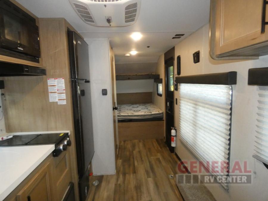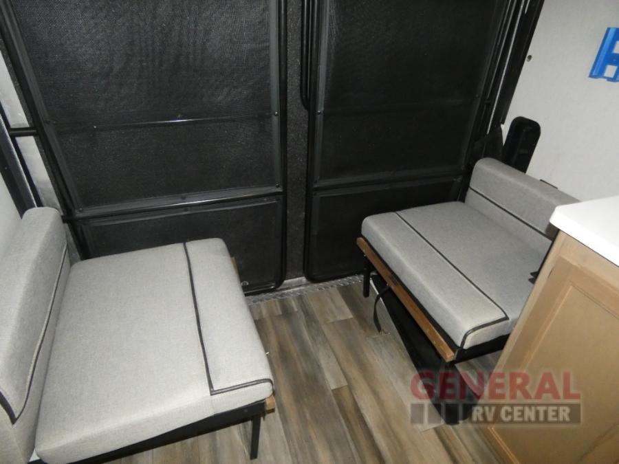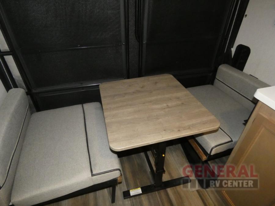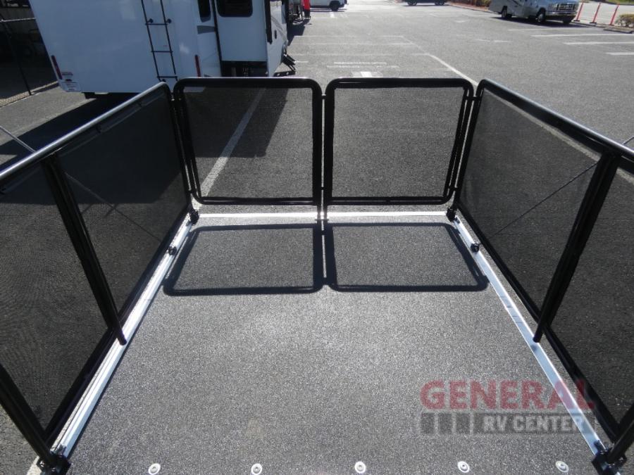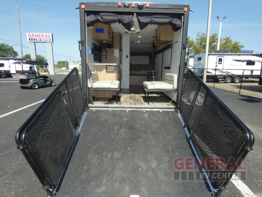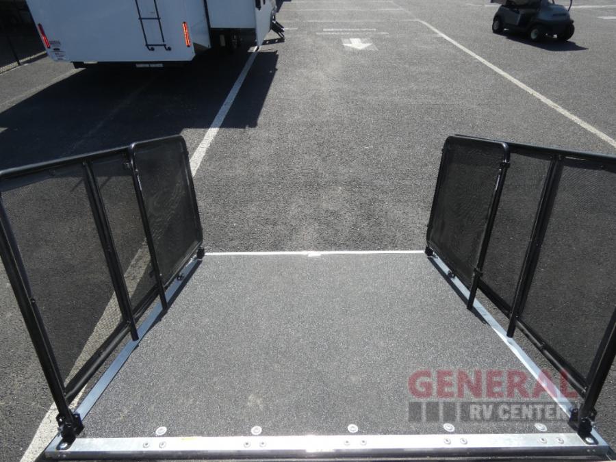 Load up your favorite off-road toys with the ramp door into the 9' 4" garage with 13' 11" total cargo space when you utilize the space up front! Enjoy all of the at home features like a fully equipped kitchen with a high output cooktop, a 12V high efficiency refrigerator, and a high output microwave. Comfortably eat your delicious meals at the rear dinette with a removable table for convenience. The full bathroom has a tub/shower for you to freshen up in the morning after getting a good night's rest on the front queen bed which also has a bunk bed above it too. There is also outside storage and an outside shower with hot and cold water!