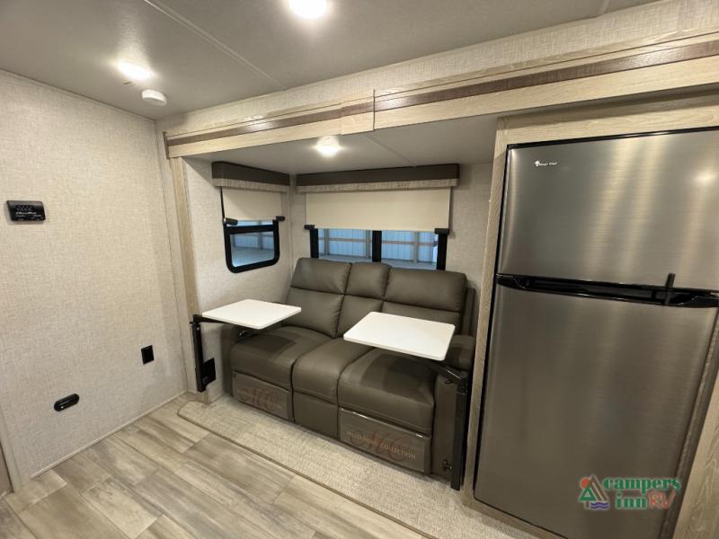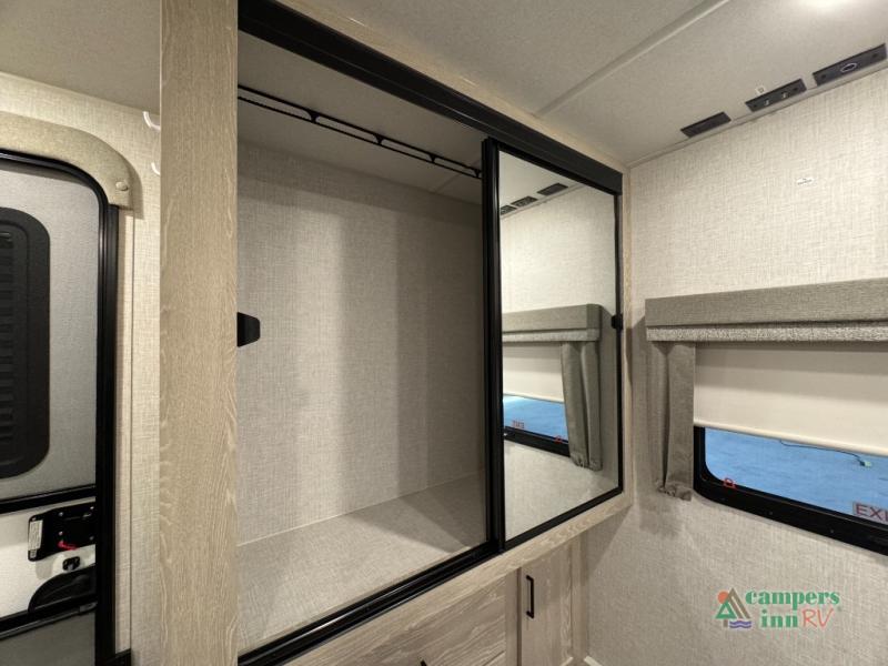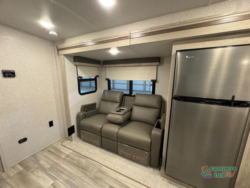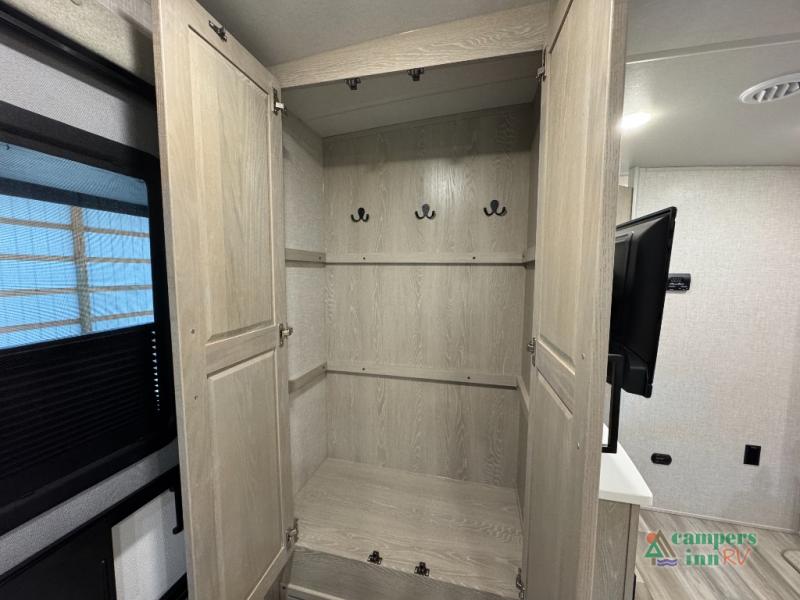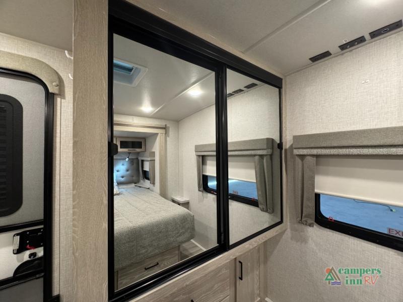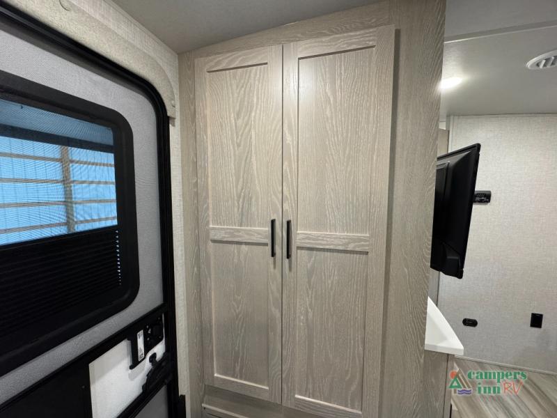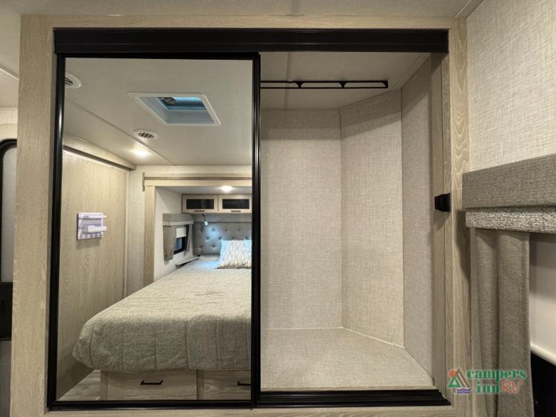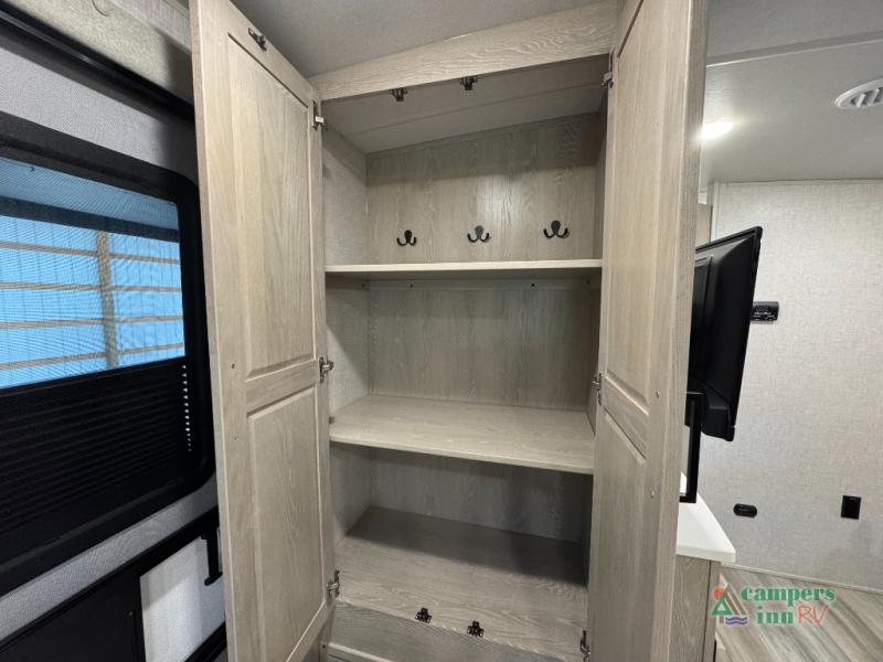 This Flagstaff Micro Lite travel trailer is going to make your camping dreams come true! With a queen bed slide and a large wardrobe in the private bedroom, you will have all that you need for sleeping and storing your belongings. Plus, the second exterior entry door leads right into the bedroom so that you can escape for an early morning run without running through the entire trailer to get outside. The front kitchen is open and accommodating with its helpful tools, and the 67" theater seat is right next to the double-door refrigerator on the slide out. Right next to the front entry door is a coat closet so that you can keep your jackets readily available, and there is also a linen closet in the walk-through bath so that you can keep your towels ready for your shower.