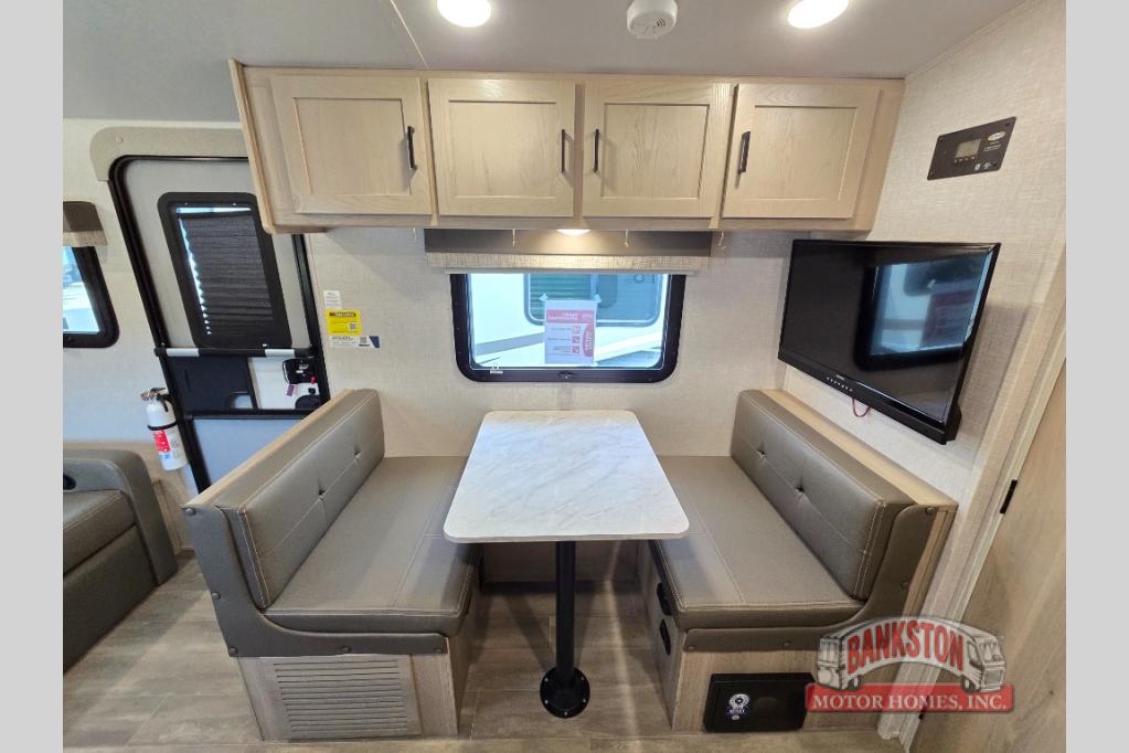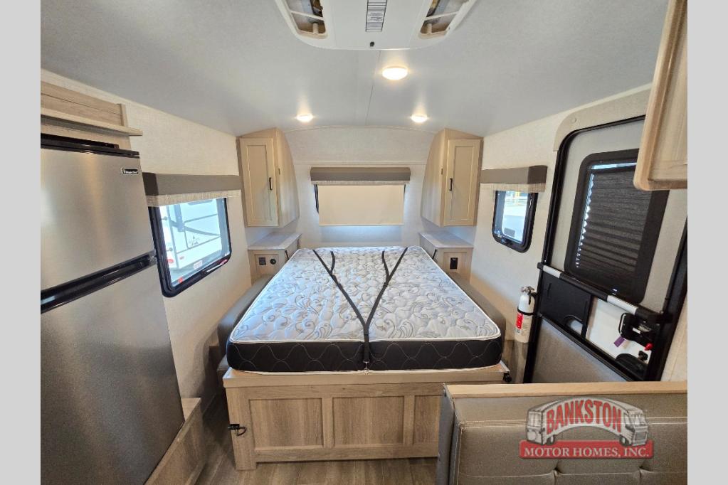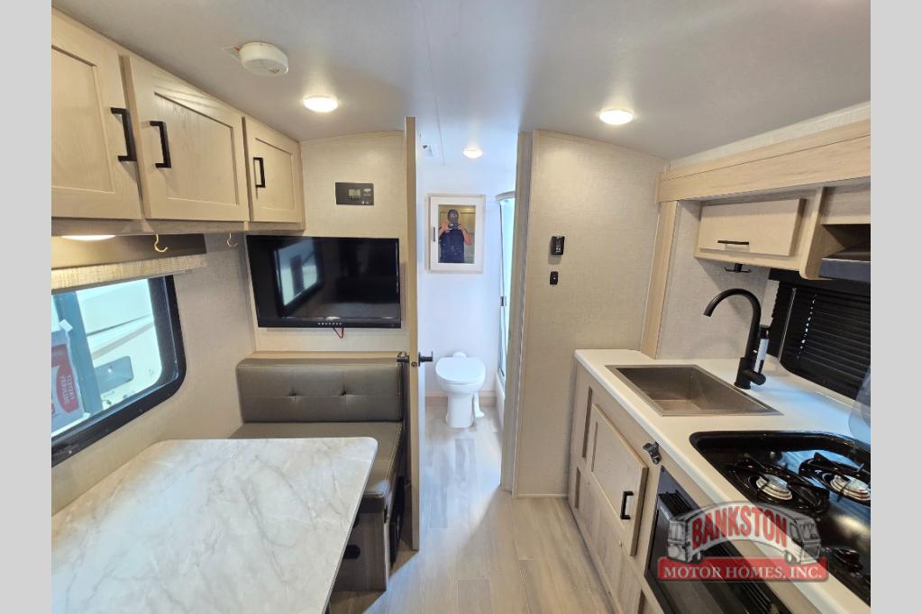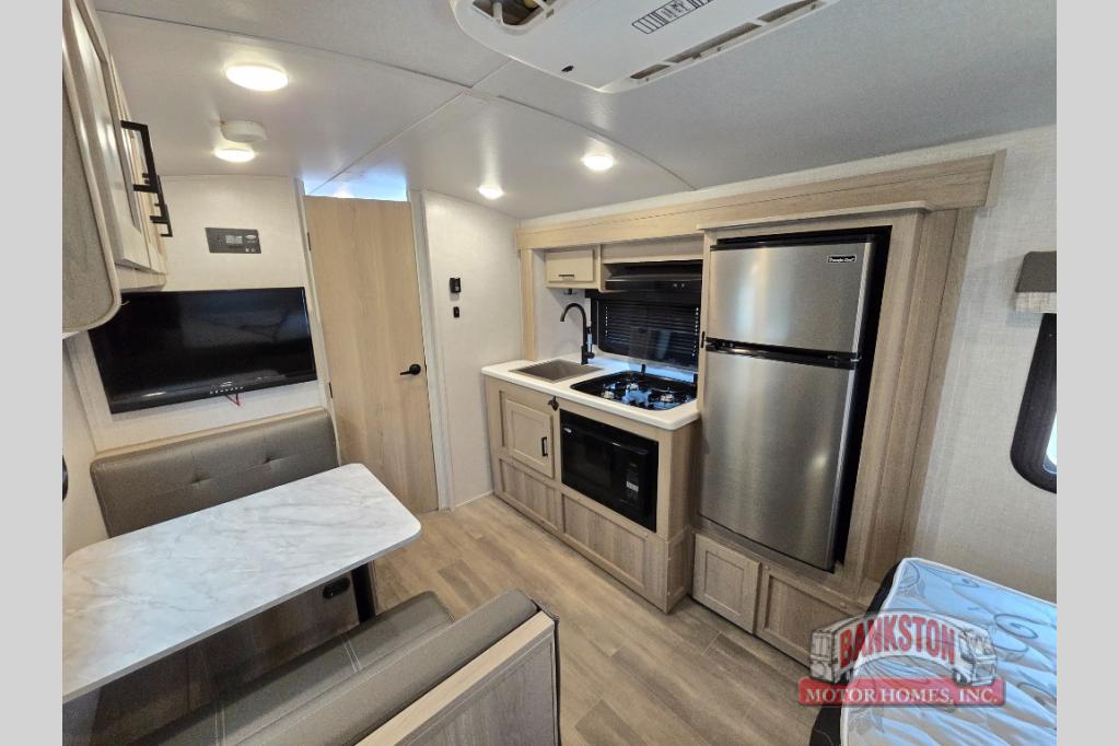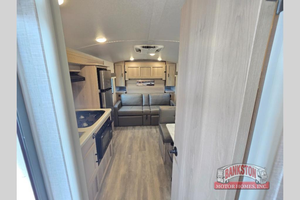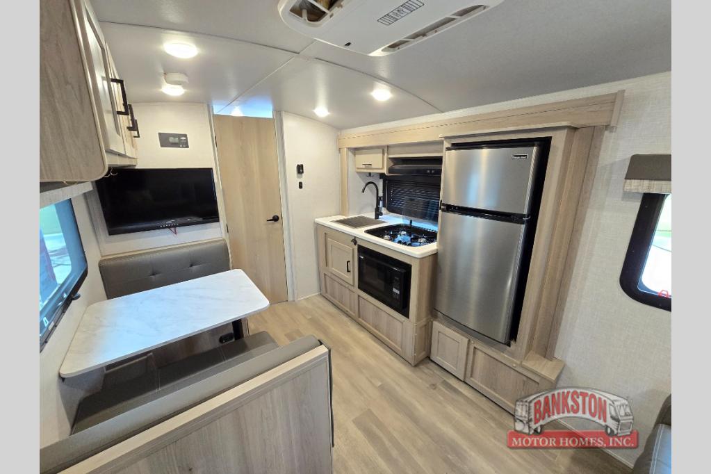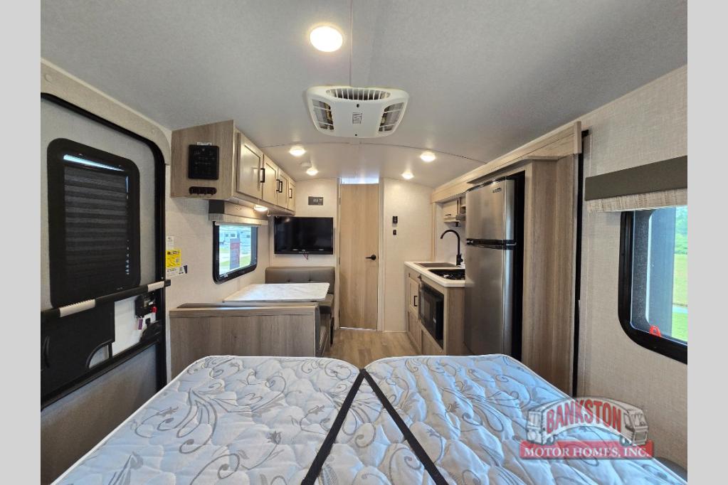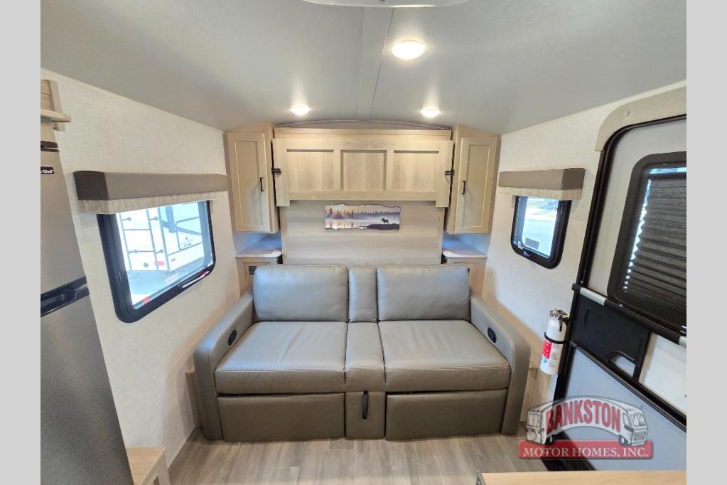 Camp with your favorite person in this trailer with the versatile Murphy bed/sofa combo up front giving you both a living area and a bedroom when you so choose. If you need sleeping space for one more, the dinette will provide that once easily setup. The large window gives you great views while dining or playing games, and the front windshield gives you more views. There is extra floor space in this trailer with the kitchen slide out that offers full amenities plus a sink to keep everything clean. And the full-length rear bathroom offers a spacious area to change your clothes in privacy and get cleaned up in the large shower.