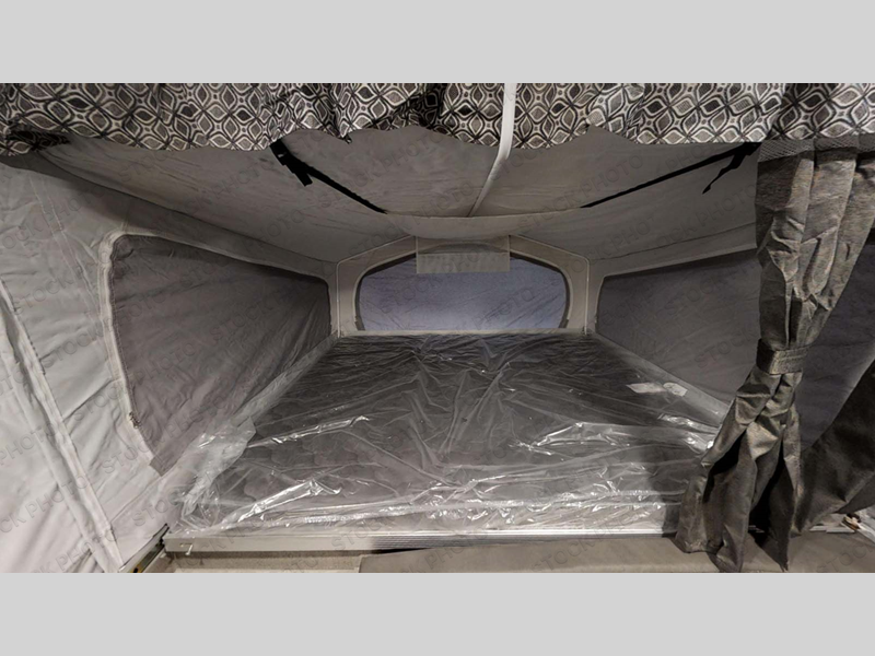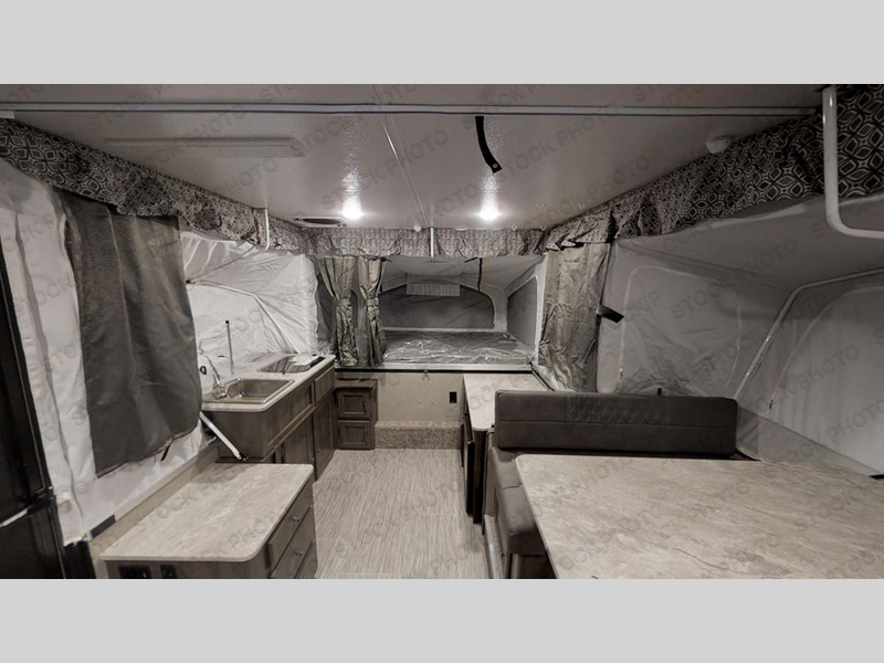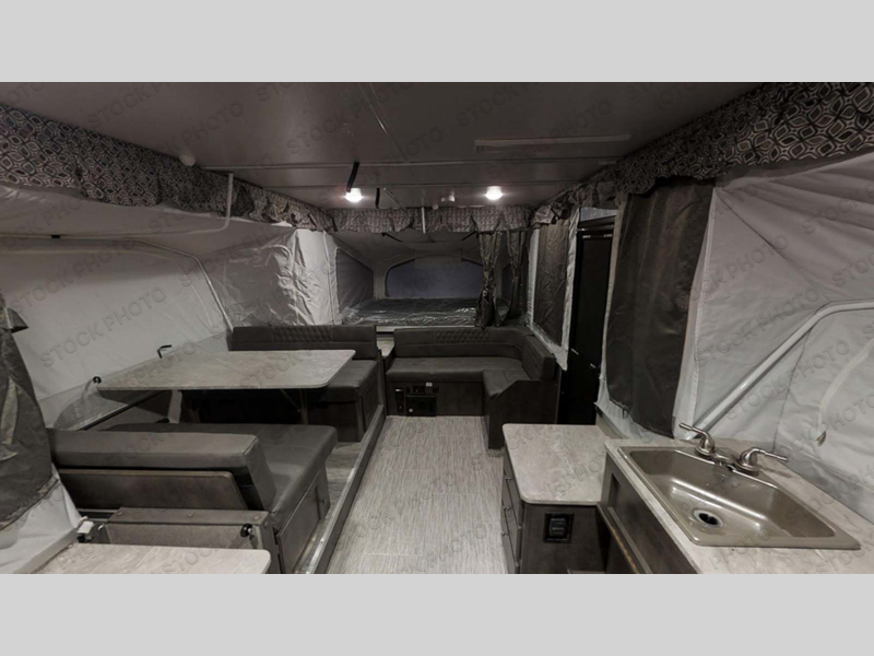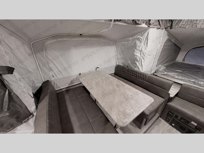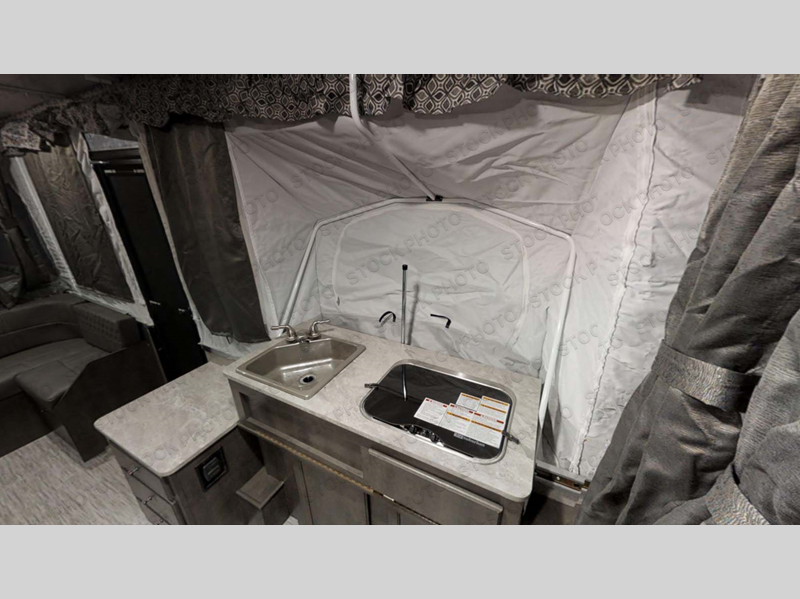 The first thing you're going to notice about this Flagstaff MAC Series folding pop-up camper is how spacious the interior is! The booth dinette sits on a single slide, so it can be moved out of the walkway which creates more room for you to just enjoy your time spent indoors. The L-shaped gaucho bed also offers some extra seating room while you're inside playing games or relaxing, and with the bay window at the permanently mounted indoor range, you can enjoy views of the campsite while you cook. This camper also has a great abundance of storage space with interior cabinets, the lift-up storage, exterior storage within the slide, and the EZ-reach storage trunk under the 70" 80" tent end bed. Another feature that you'll find extremely helpful are the USB charging ports.