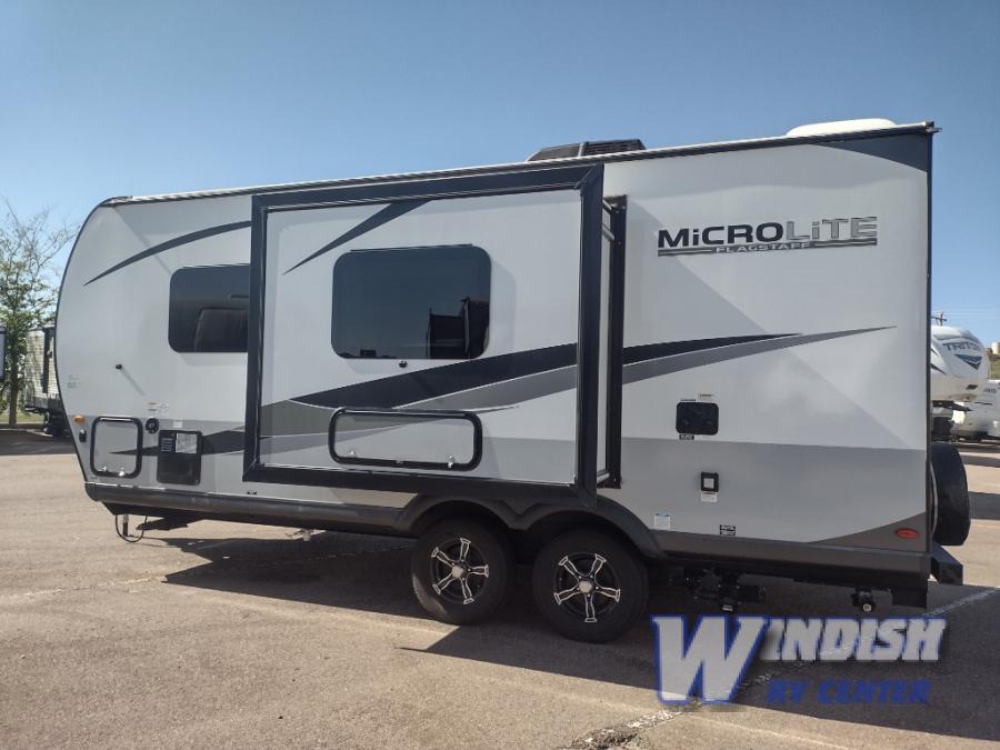 Pack your bags and get ready for your next camping trip with this Flagstaff Micro Lite travel trailer. You will enjoy the space the single slide provides, and within the slide is a U-shaped dinette where you can enjoy your meals. Fold out the Murphy bed each night for a good night's rest, and in the morning you can fold it away and enjoy a cup of coffee on the sofa. This unit features a kitchen with a three-burner cooktop and a microwave, and you'll appreciate a pantry for snacks. Bring along the extra lawn chairs in the pass-through storage, and there is also an exterior storage for your luggage or tackle boxes