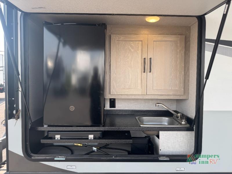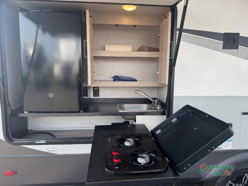 Outdoor Kitchen and Griddle: Keep your campsite active with an exterior kitchen setup that includes a mini fridge and a propane griddle, perfect for burgers, pancakes, or late-night snacks under the stars.