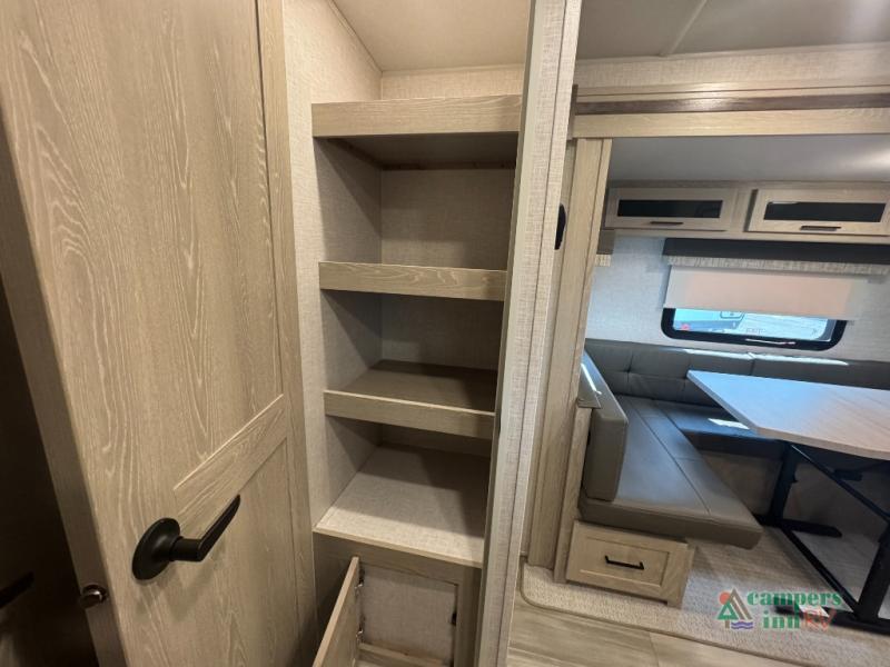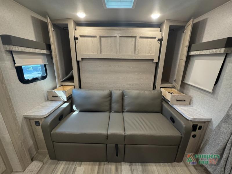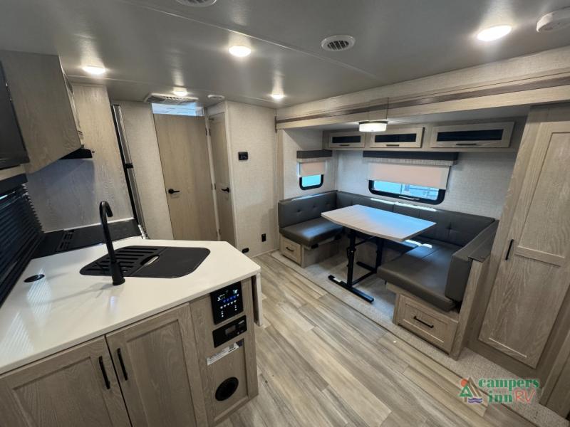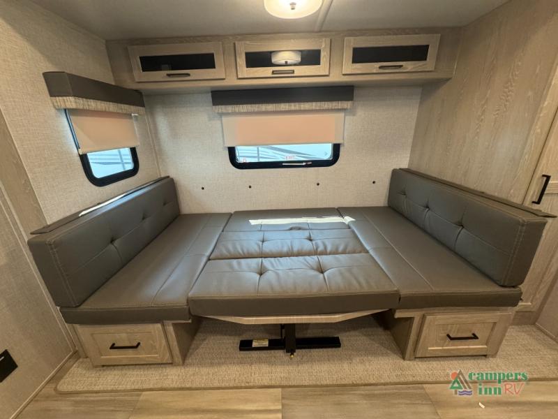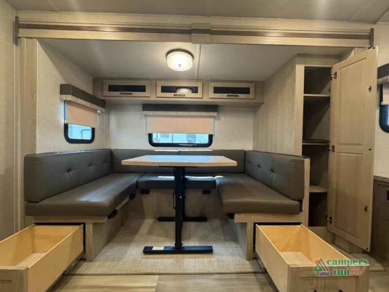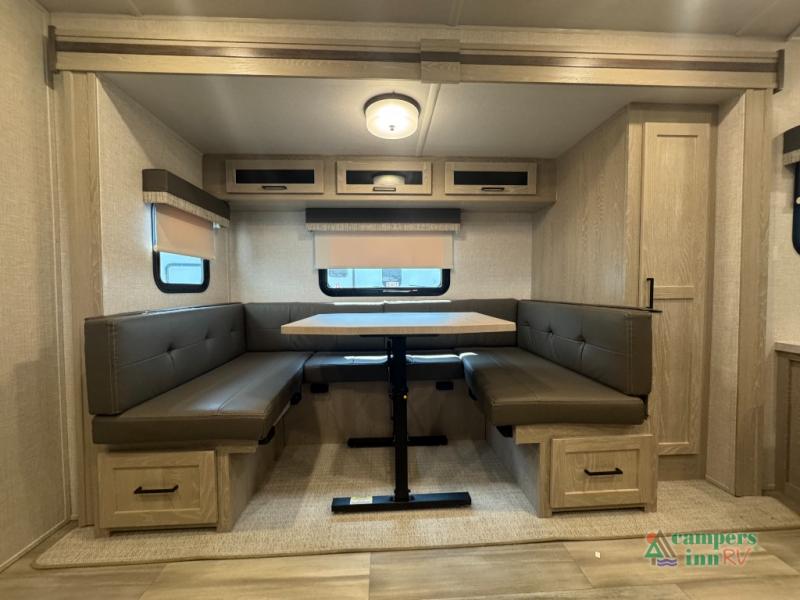 Large Slide-Out Dinette: The spacious U-shaped dinette offers room for meals, board games, and extra sleeping space, all within a deep slide-out that opens up the floorplan beautifully.