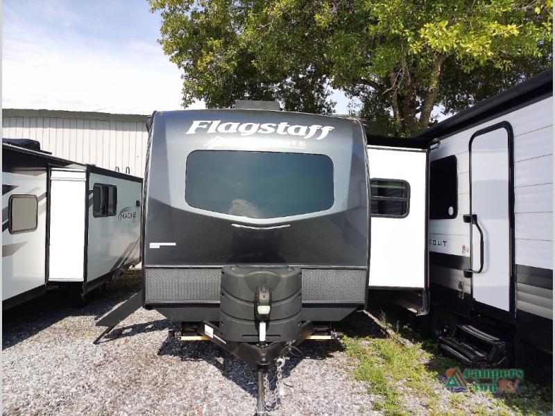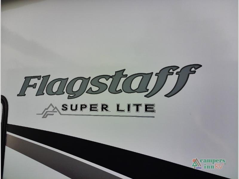 With any Flagstaff Super Lite travel trailer by Forest River the towing features include the TST tire pressure monitor system with a monitor providing safety on the road, Easy Lube axles and Nev-R adjust brakes, a power tongue jack for easy setup, and rear observation camera prep. Each is built with 6 sided aluminum framed side walls, end wall, front, floor and a roof, a plywood tongue and groove subfloor, electronically controlled heated holding tanks and an enclosed underbelly allowing you to travel during any season. The interior offers a Water-Pur filtration system, a multi-zone stereo with DVD, CD, AM/FM and Bluetooth control, a Showermiser water saving system, designer bedding and so much more! Choose a lightweight, towable by half-ton pickup truck Flagstaff Super Lite today!