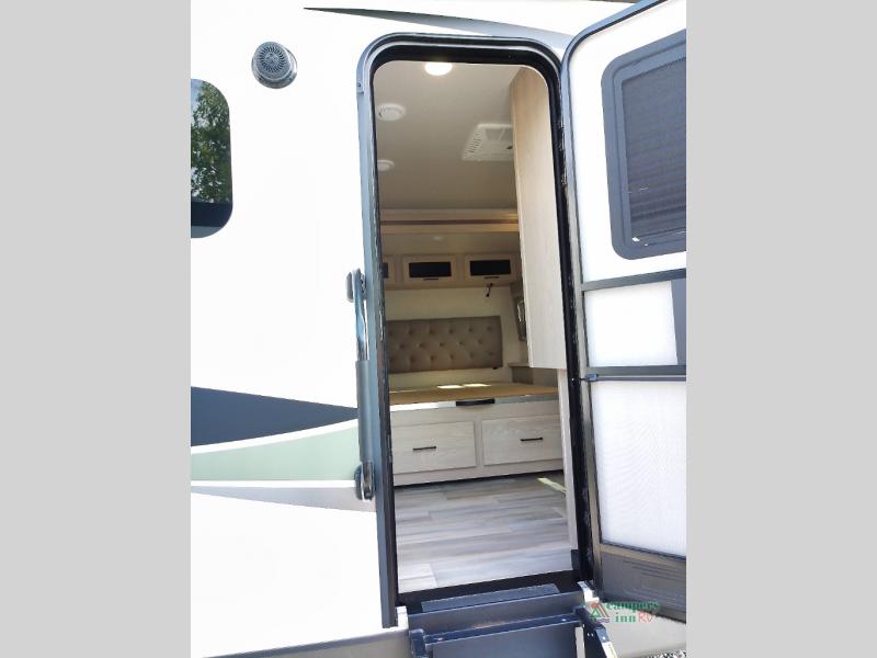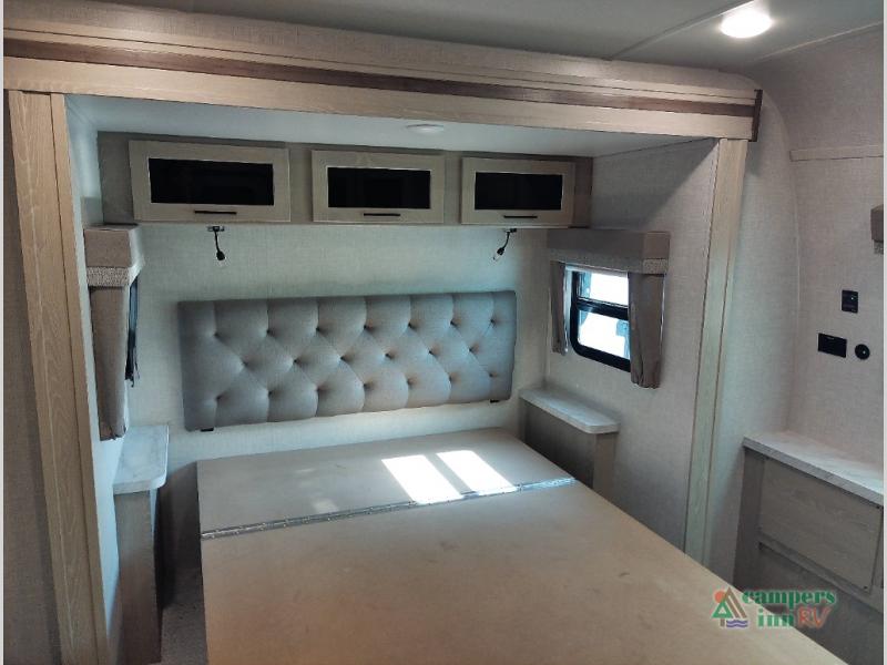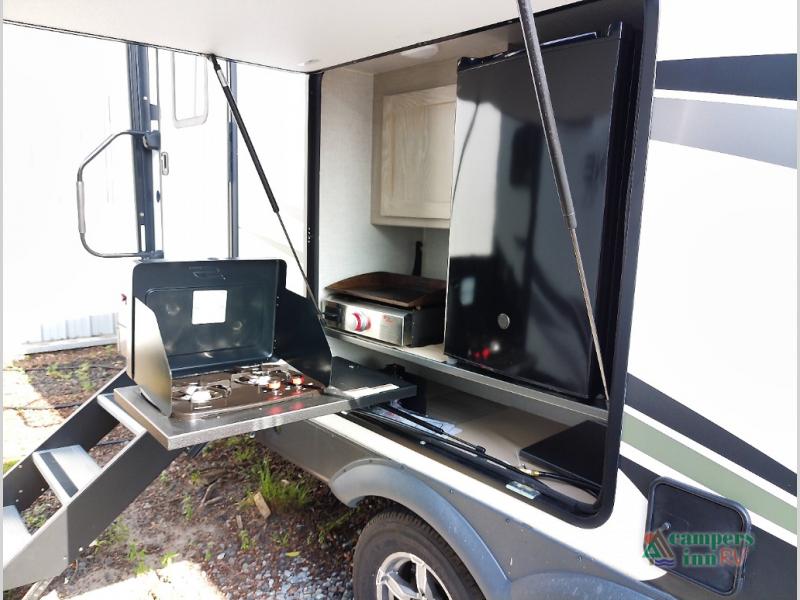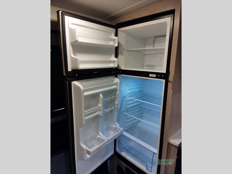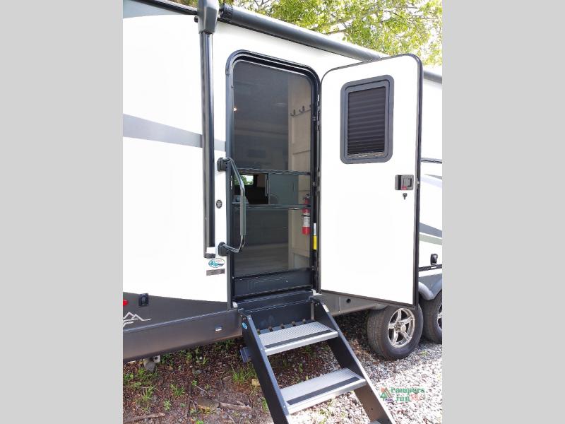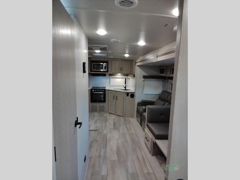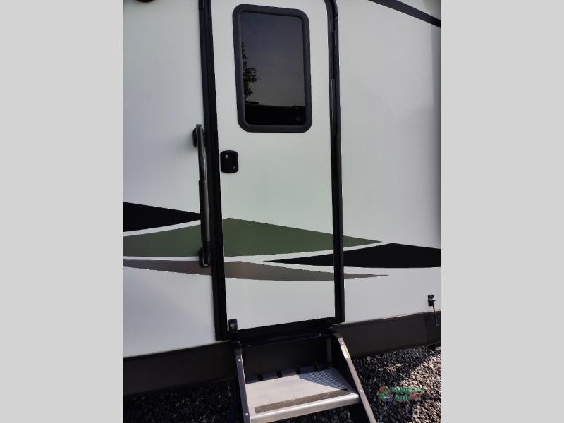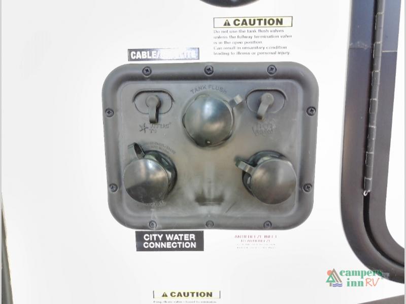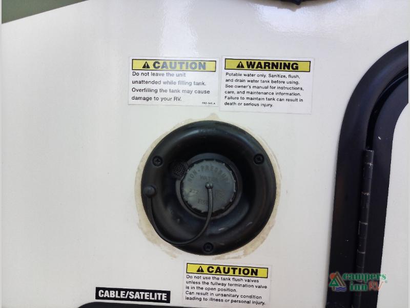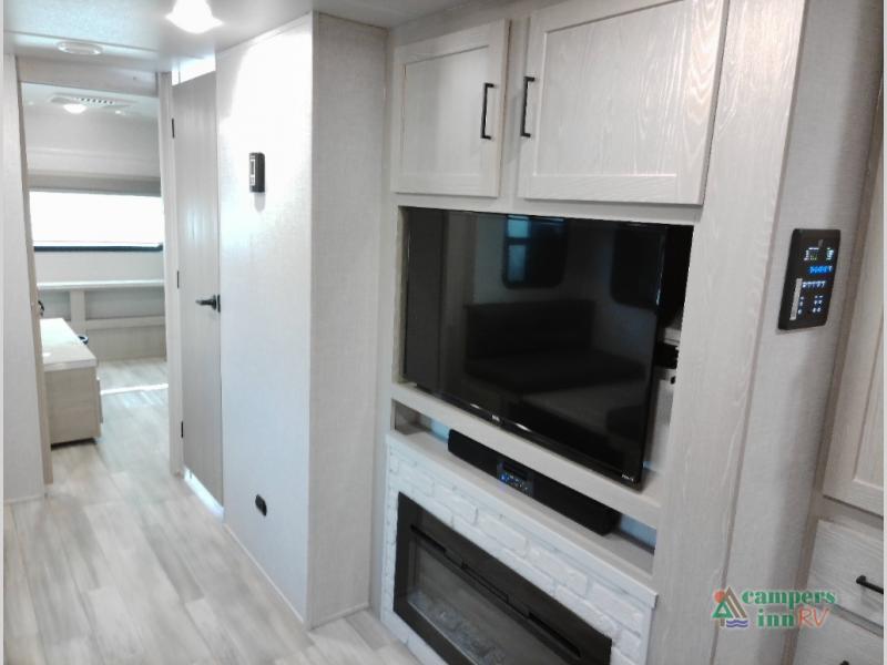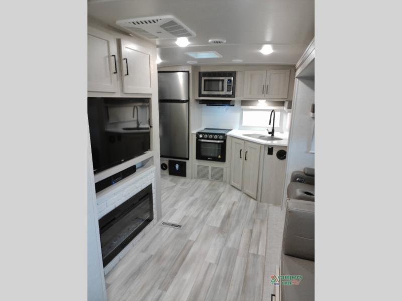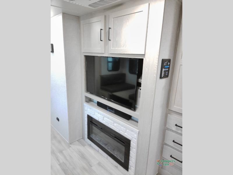 Whether you camp at state parks, National forests or on your friend's land, this trailer offers you plenty of floor space thanks to the two slide outs! As you enter the main entrance near the rear kitchen you can grab a drink from the refrigerator or a snack from the pantry and relax on the 60" theater seating or sit at the booth dinette. The LED TV offers entertainment while the fireplace will keep you cozy during the cooler months. Everyone will appreciate having a full bathroom to get cleaned up in, and the front bedroom gives you privacy and a queen bed slide, plus storage and the second exterior entry.