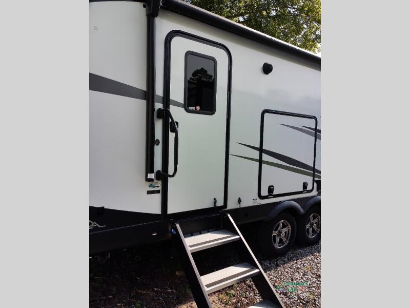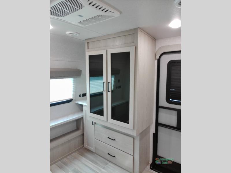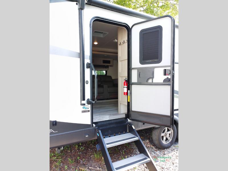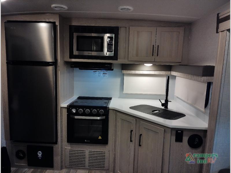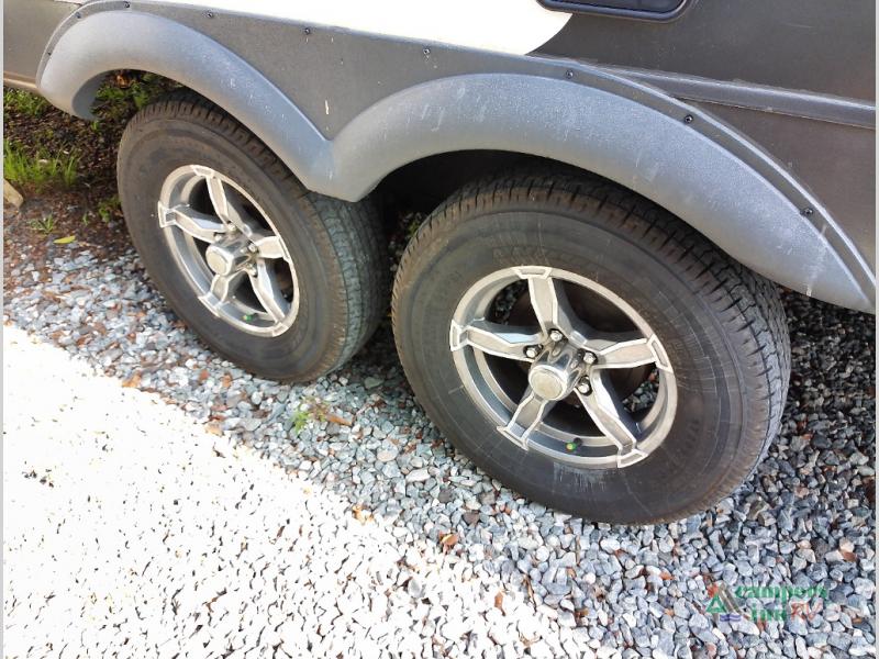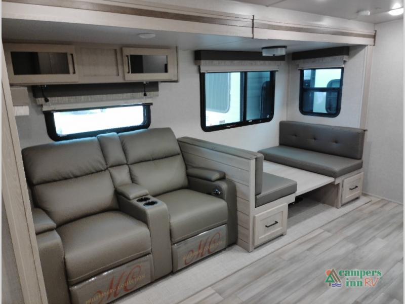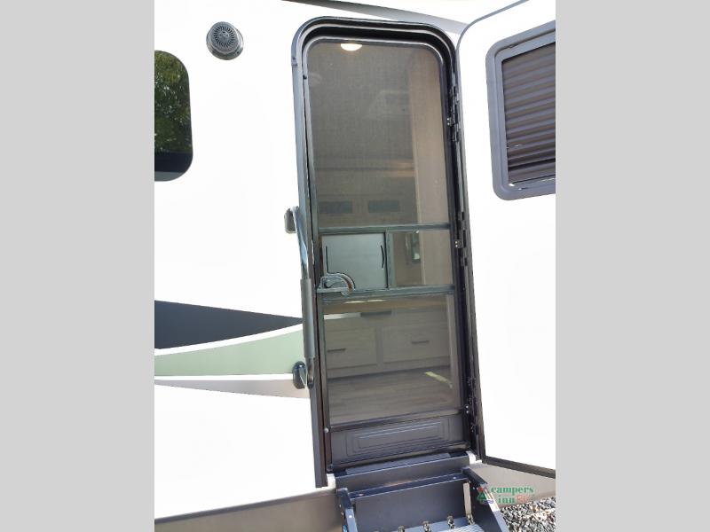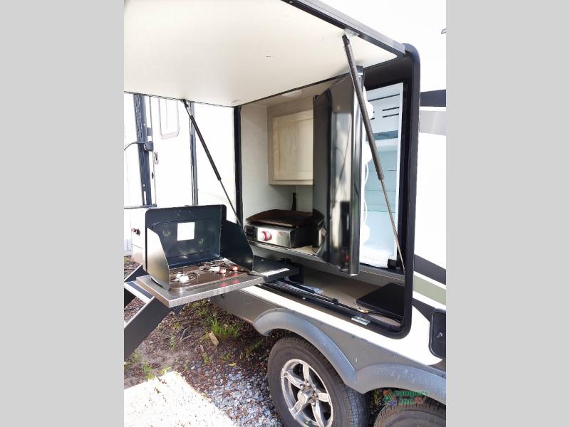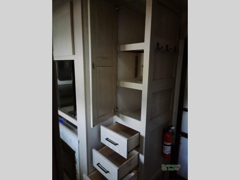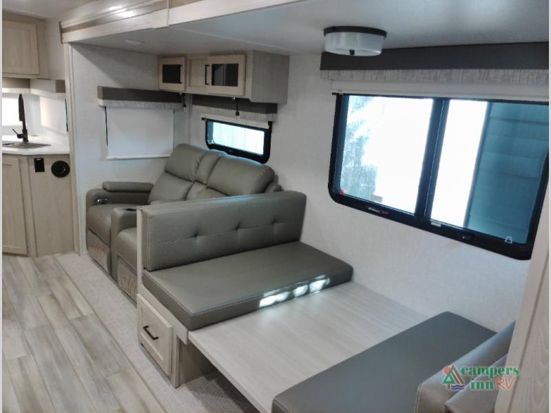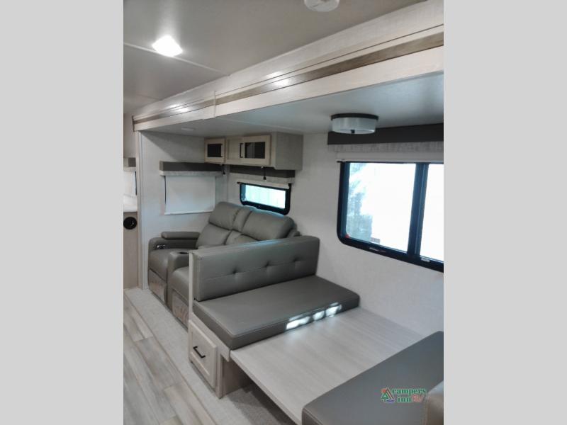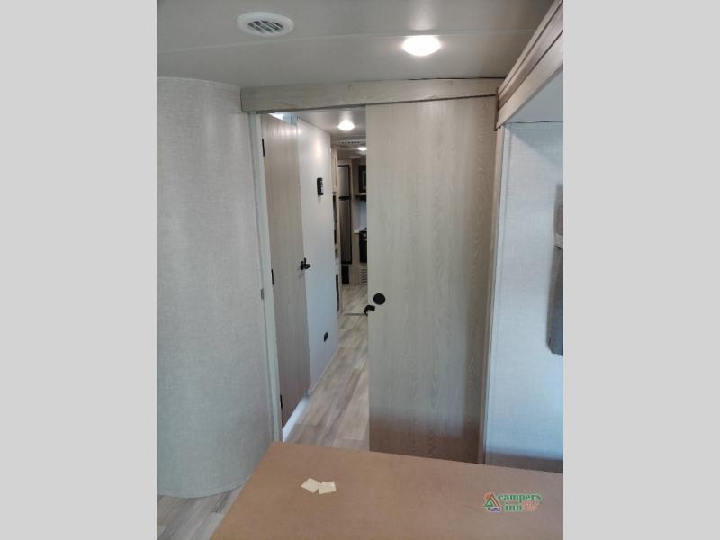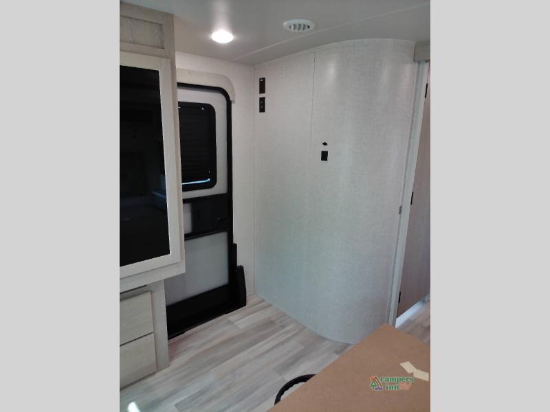 Whether you camp at state parks, National forests or on your friend's land, this trailer offers you plenty of floor space thanks to the two slide outs! As you enter the main entrance near the rear kitchen you can grab a drink from the refrigerator or a snack from the pantry and relax on the 60" theater seating or sit at the booth dinette. The LED TV offers entertainment while the fireplace will keep you cozy during the cooler months. Everyone will appreciate having a full bathroom to get cleaned up in, and the front bedroom gives you privacy and a queen bed slide, plus storage and the second exterior entry.