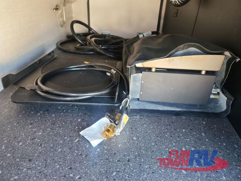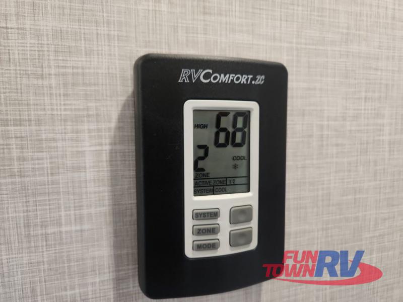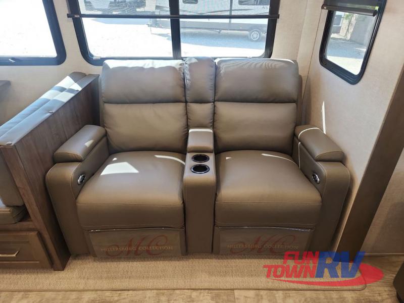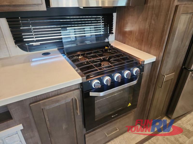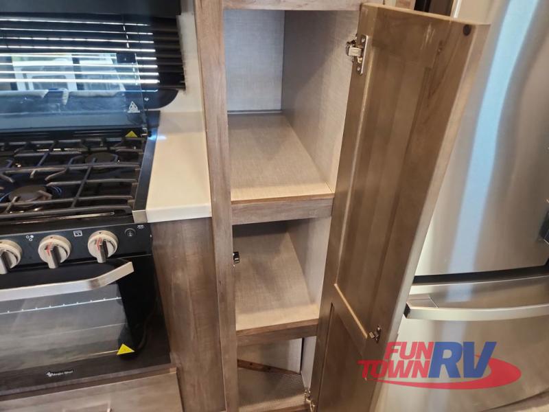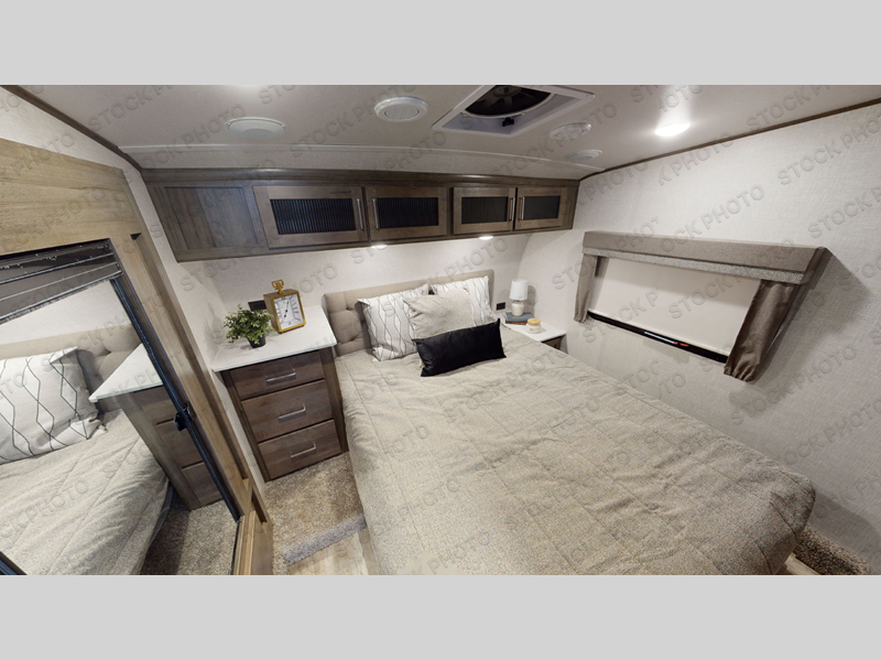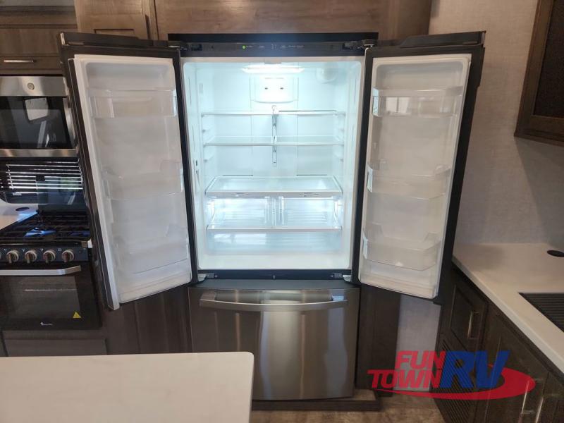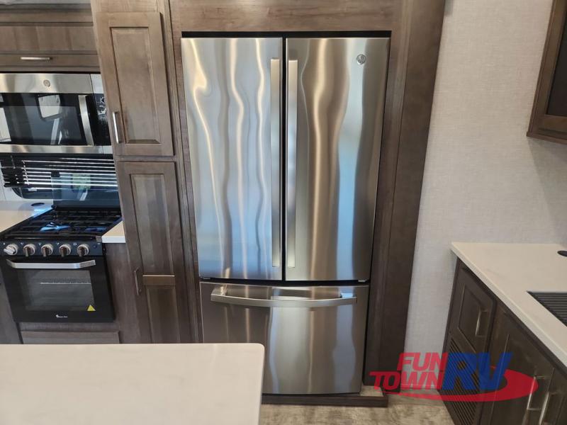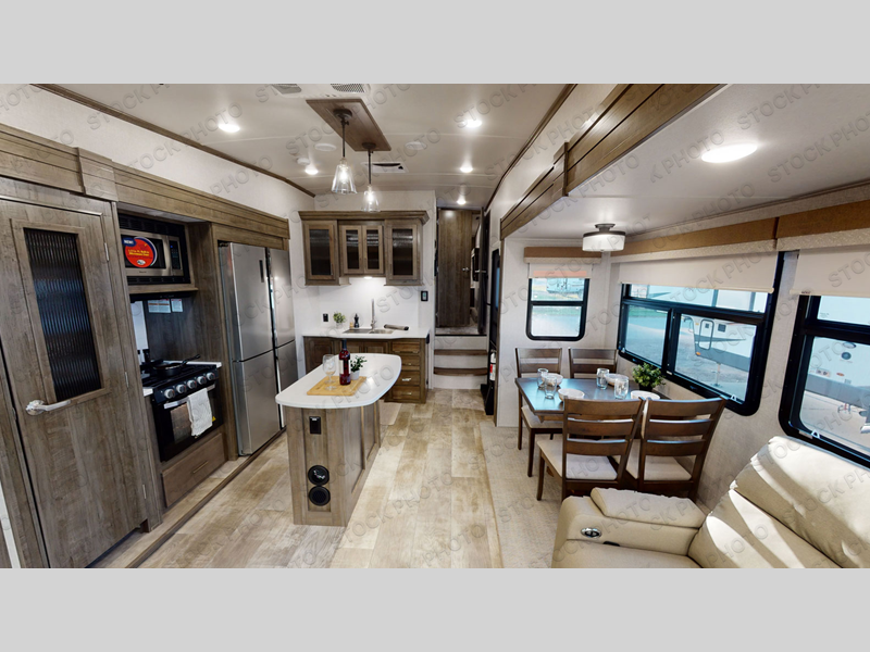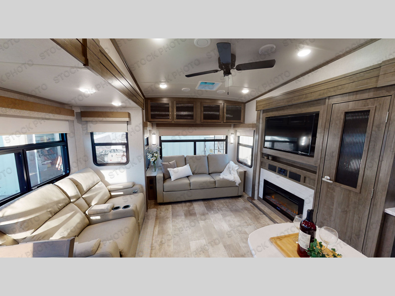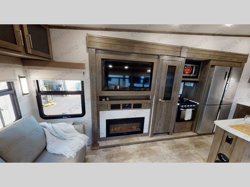 You can enjoy being outside under one of the two awnings as you relax and unwind at the RV park or campgrounds, and you will find plenty of space for your camping chairs and outdoor gear in the pass-through storage, plus more storage along the front and side. However, when you are indoors it might seem like you are outdoors with all the views out the enormous windows in both the rear, and door side slide. The kitchen appliances, the fireplace and the LED TV are within the second slide in this main area providing a spacious place to gather with nine people thanks to all of the seating. So you can choose from the rear sofa, theater seats, the booth dinette or sit at the island. And the front bedroom offers a queen bed or choose a king option, and a slide out wardrobe that stretches into the double entry bathroom.