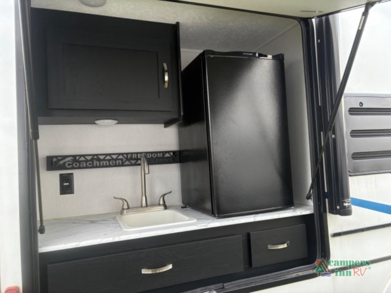 With any Freedom Express Ultra Lite travel trailer by Coachmen you will appreciate quality construction materials, such as vacuum bonded walls with Azdel composite, a 3/4 gel coated fiberglass cap with an automotive glass windshield, and a heated enclosed underbelly. Each model also features Tufflex PVC roofing, front diamond plate, and E-Z Lube axles for smooth towing. You'll find Carefree flooring indoors, as well as night shades, a dual basin American stonecast sink, and hidden hinge cabinetry. The power tongue jack included with the Ultra Lite Express Pack will make set-up a breeze, and each model includes back-up camera prep and they are Freedom solar ready if you plan to go off-grid. Enjoy lightweight camping with a Freedom Express Ultra Lite travel trailer today!