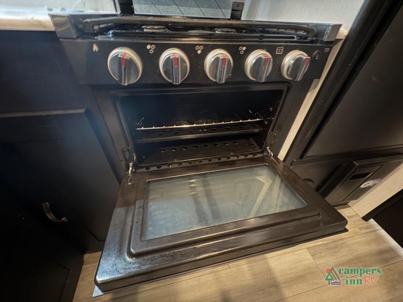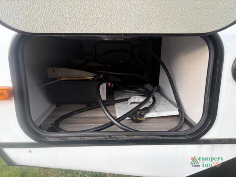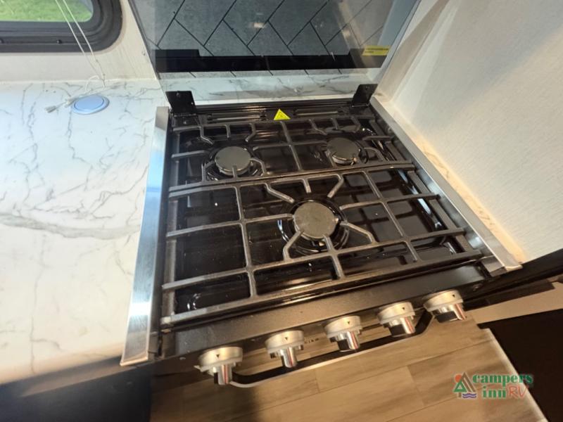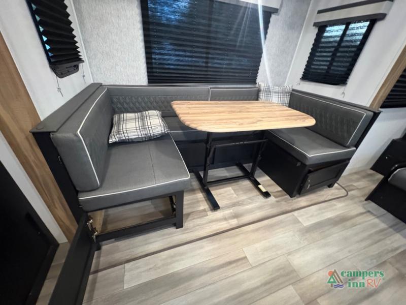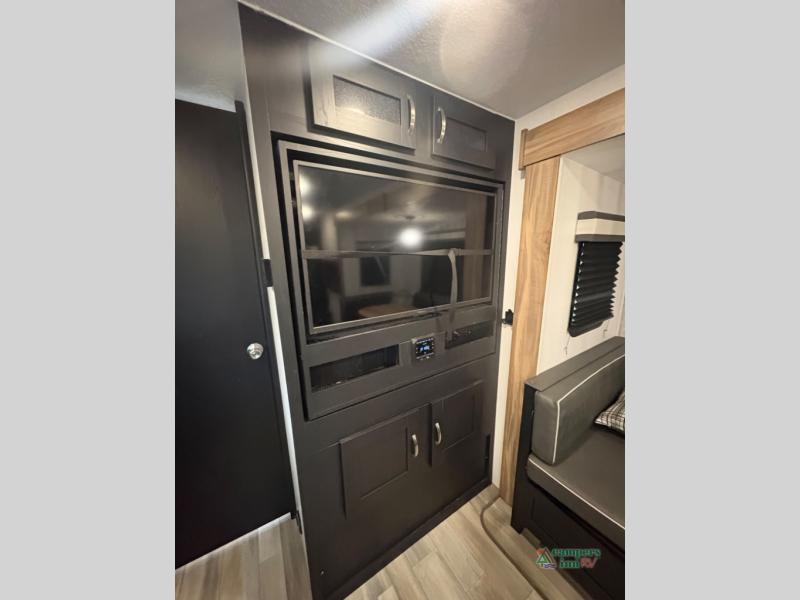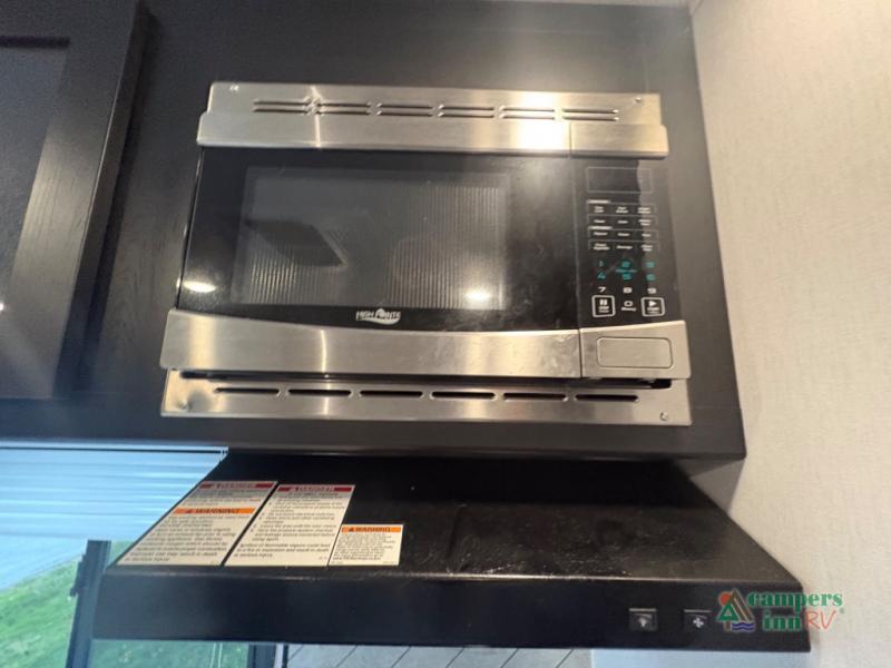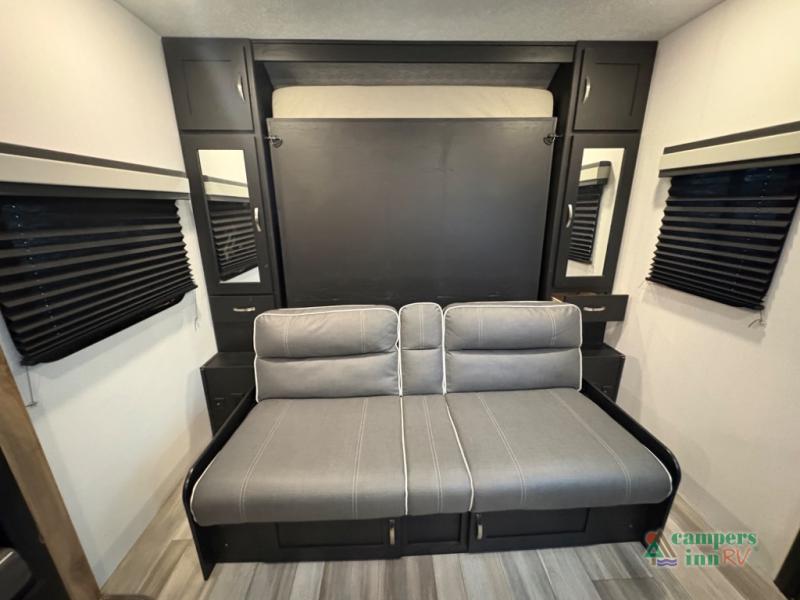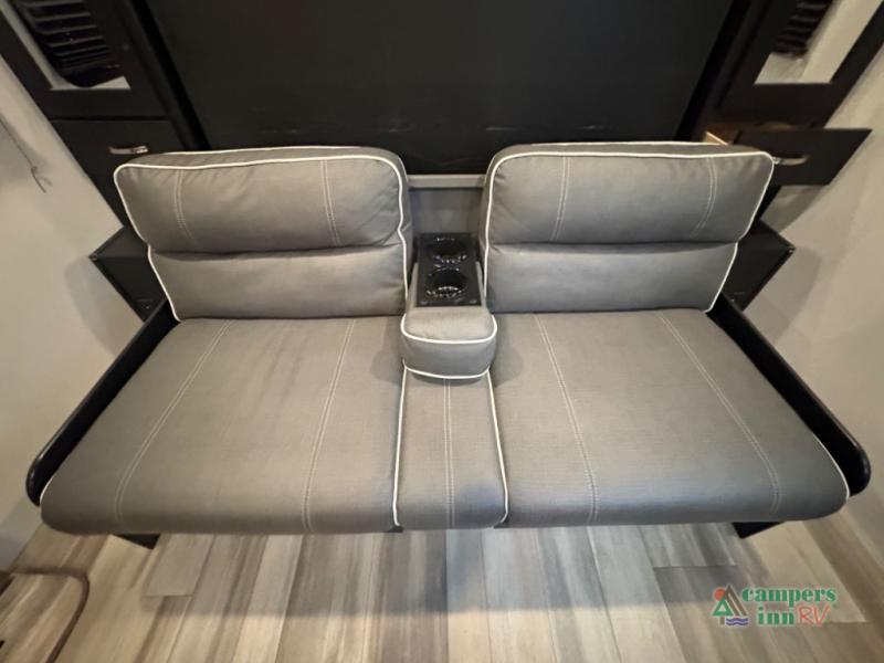 Escape the city life for relaxing weekends at the lake in this spacious travel trailer. Once you arrive at the campground, set up the 13' power awning with LED lights, then prepare lunch on the full camp kitchen. Head inside and gather around the U-shaped dinette for game night, or you can relax on the sofa and watch a movie on the LED TV. The interior kitchen includes everything needed to prepare meals, including a three burner cooktop, a microwave oven, plus an 8 cu. ft. double door refrigerator. When it comes time to call it a night you can quickly fold down the Murphy bed behind the sofa, and your guests can sleep on the dinette.
