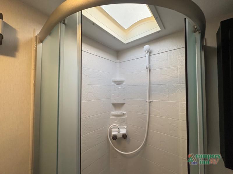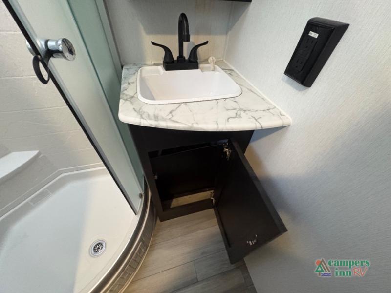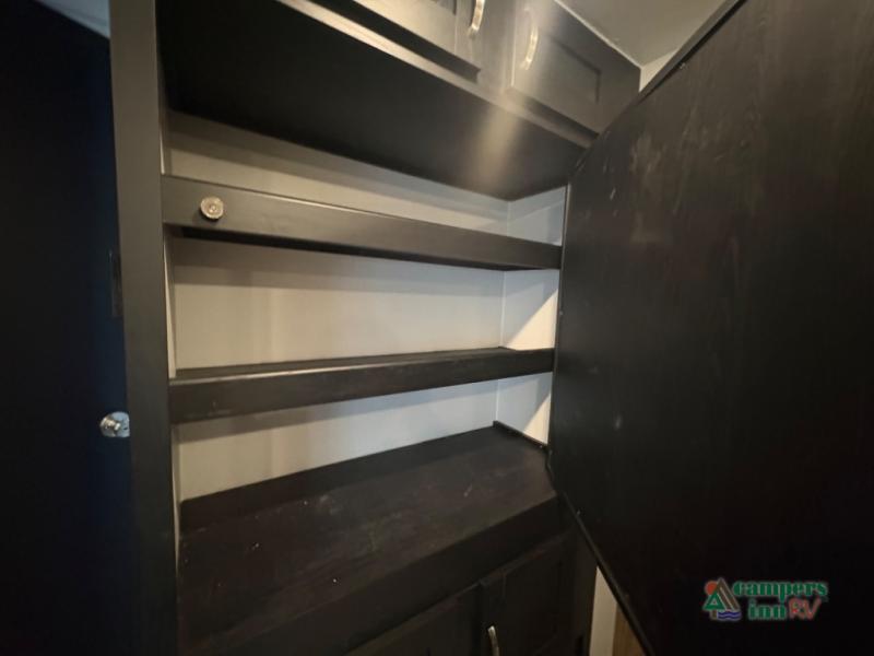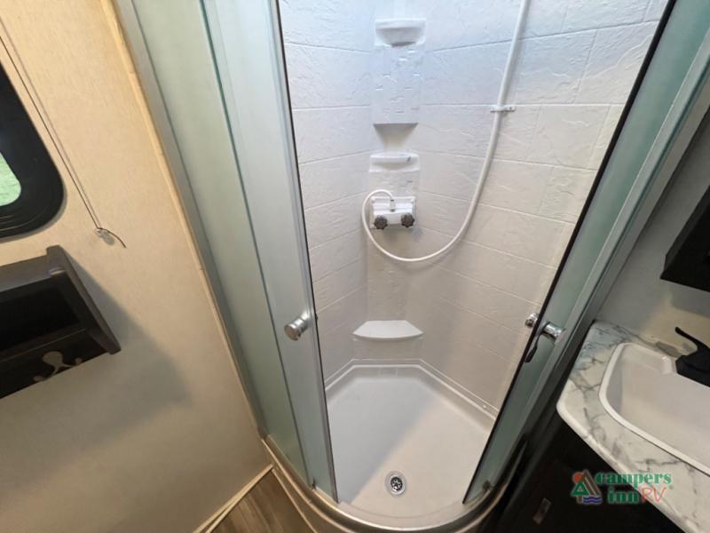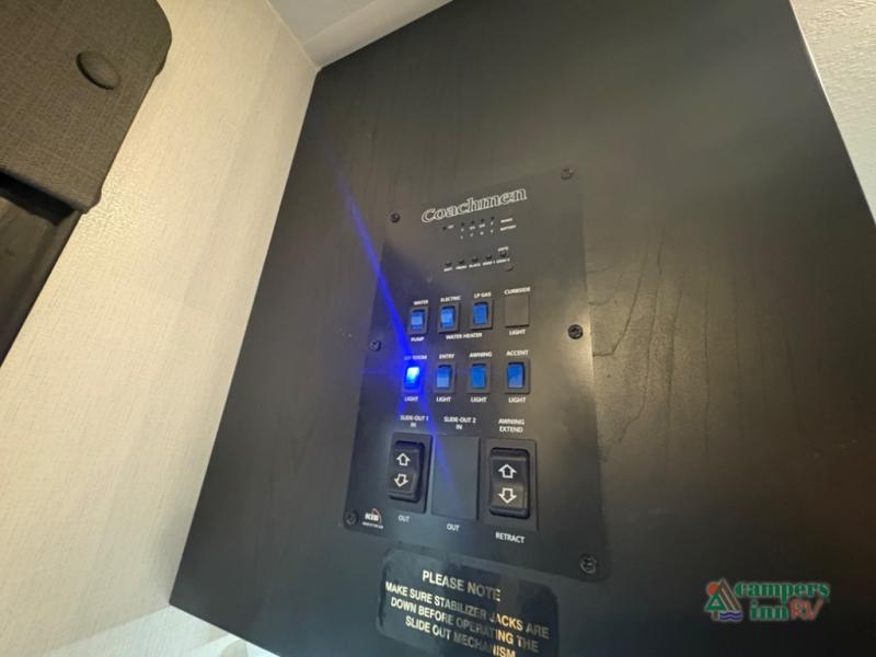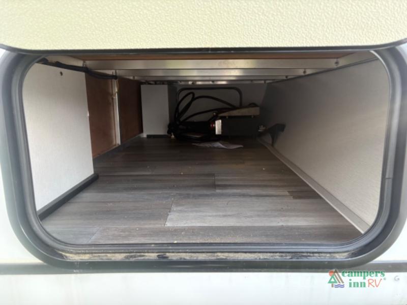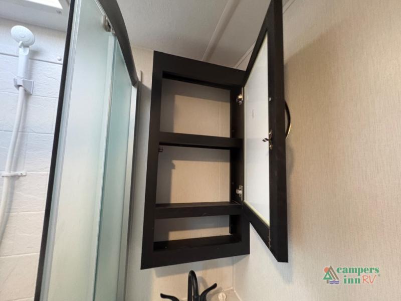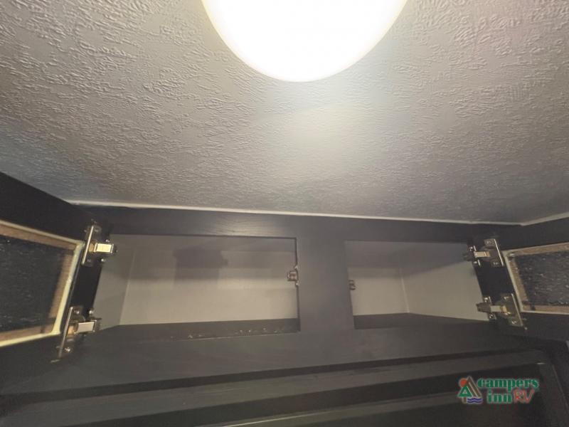 Escape the city life for relaxing weekends at the lake in this spacious travel trailer. Once you arrive at the campground, set up the 13' power awning with LED lights, then prepare lunch on the full camp kitchen. Head inside and gather around the U-shaped dinette for game night, or you can relax on the sofa and watch a movie on the LED TV. The interior kitchen includes everything needed to prepare meals, including a three burner cooktop, a microwave oven, plus an 8 cu. ft. double door refrigerator. When it comes time to call it a night you can quickly fold down the Murphy bed behind the sofa, and your guests can sleep on the dinette.