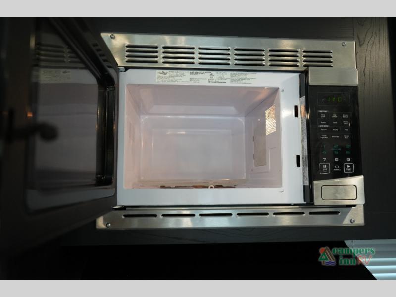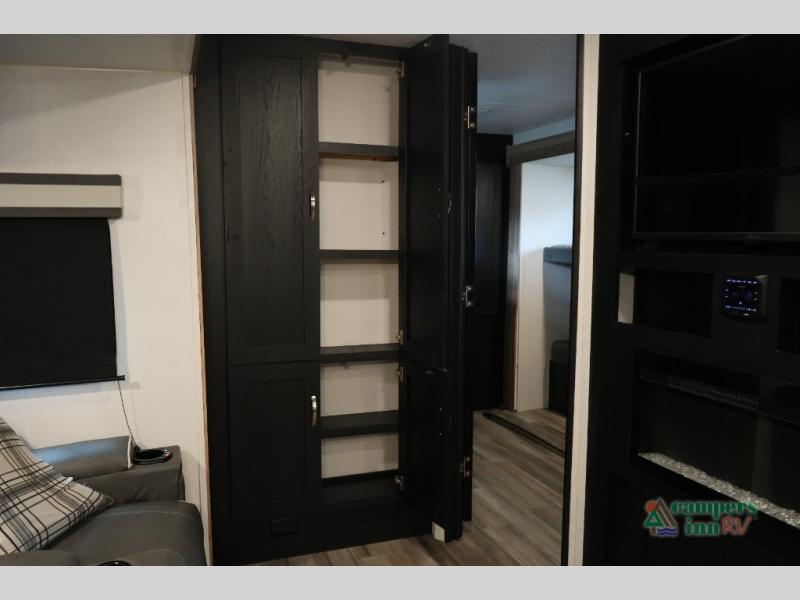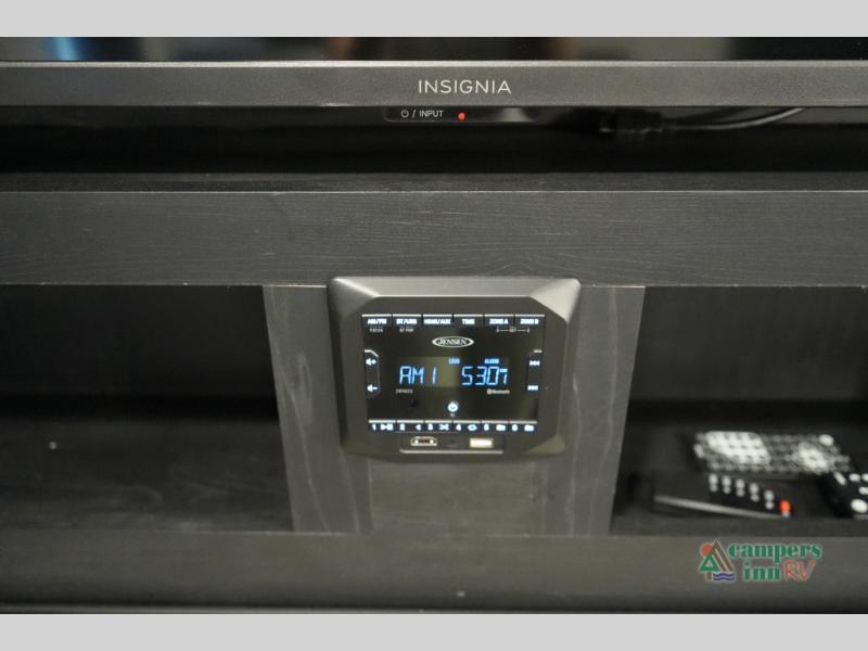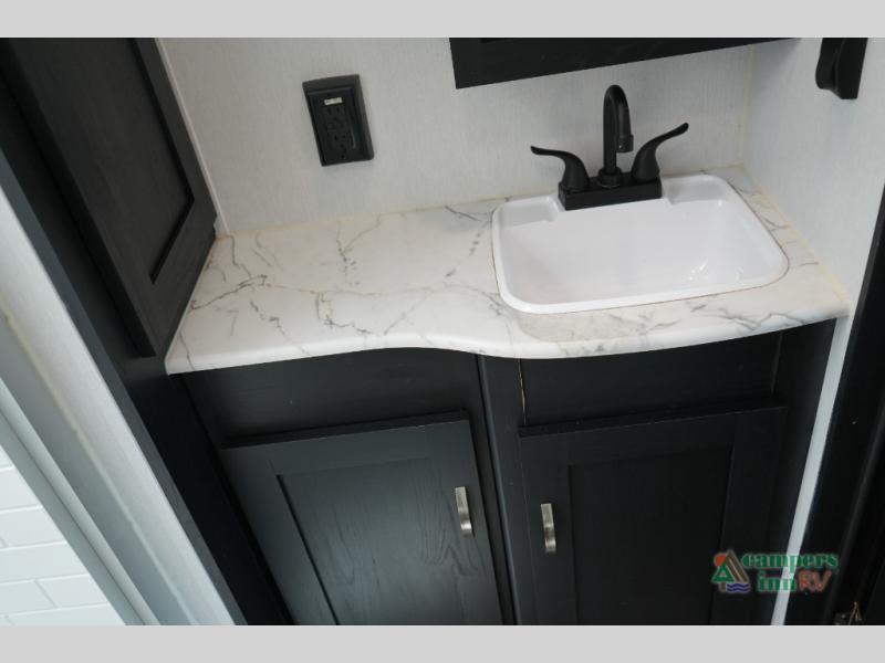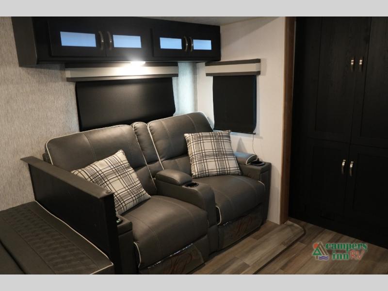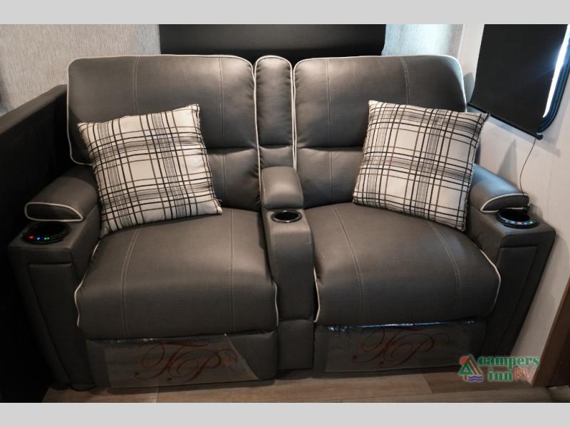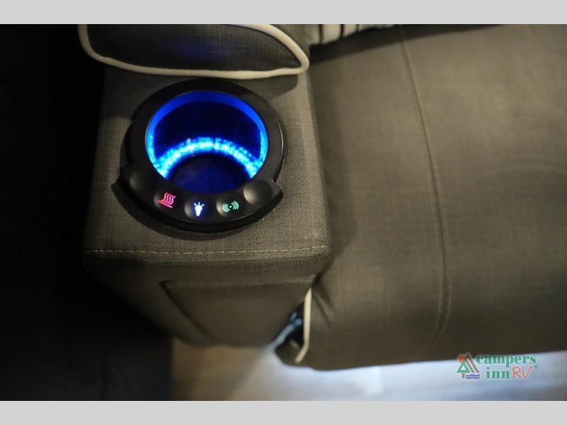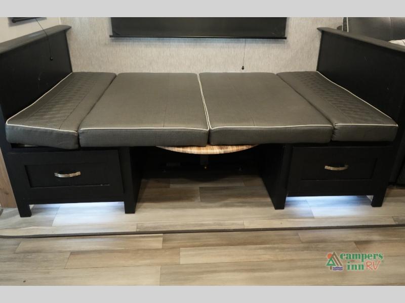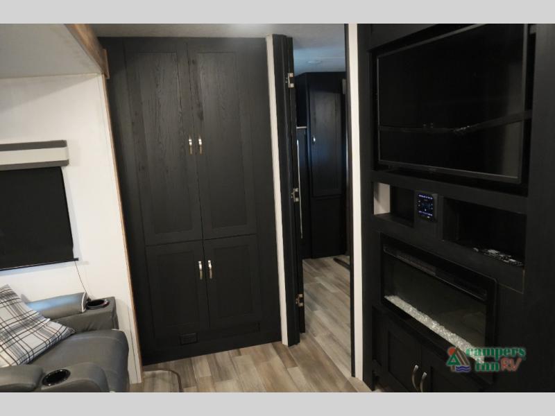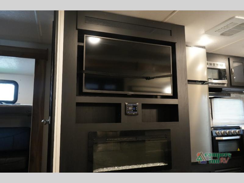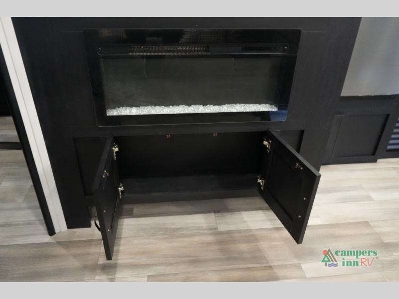 Enjoy a modern living area with a fireplace, hide-a-bed sofa or optional theater seating, booth dinette, and entertainment center. Cook indoors with full kitchen amenities or outside with the camp kitchen that includes a griddle, sink, and mini fridge. Dual power awnings provide shade for relaxing outdoors.