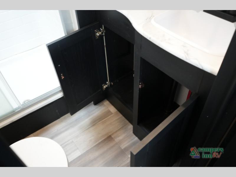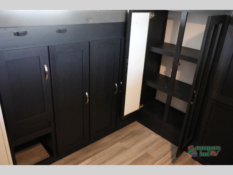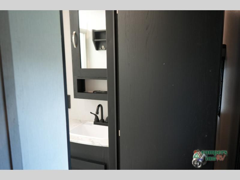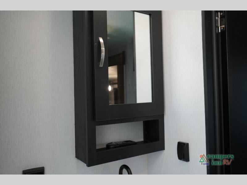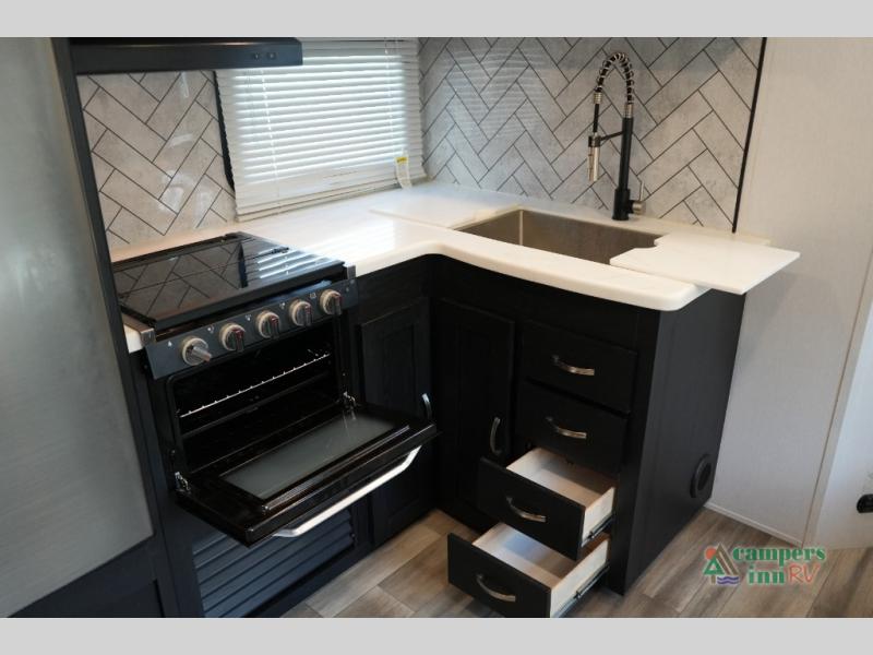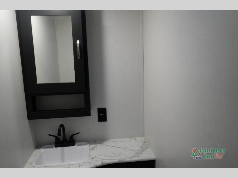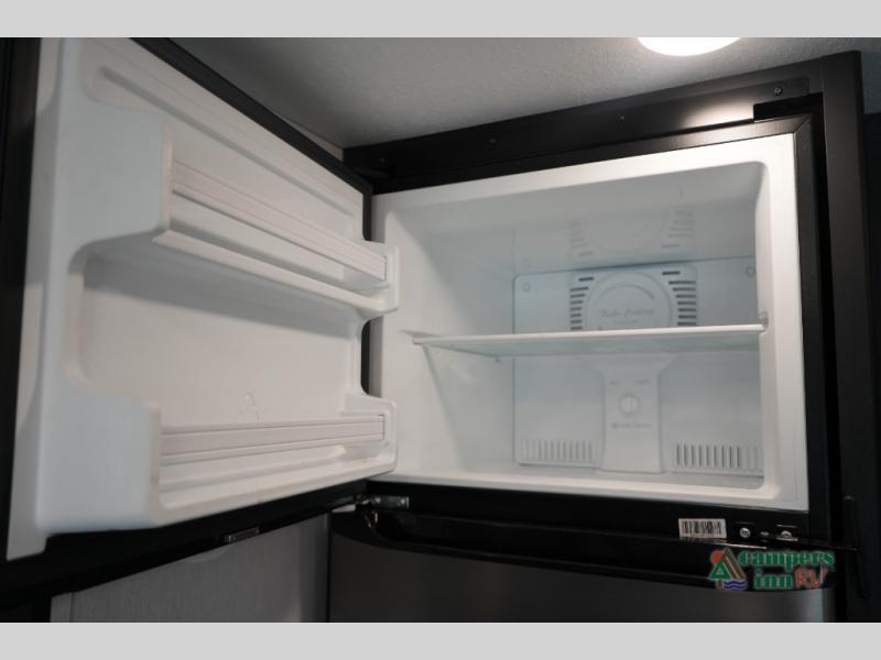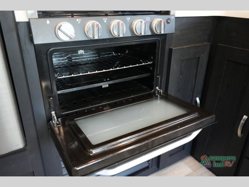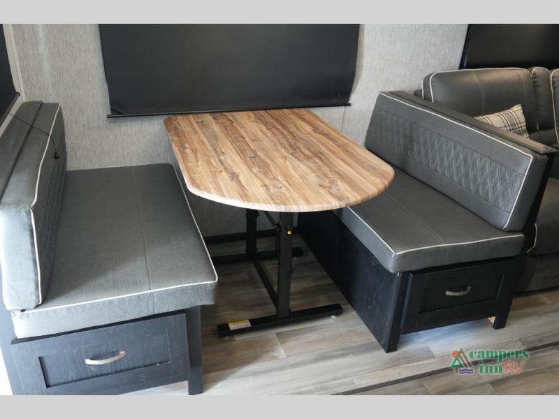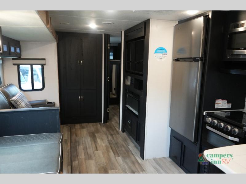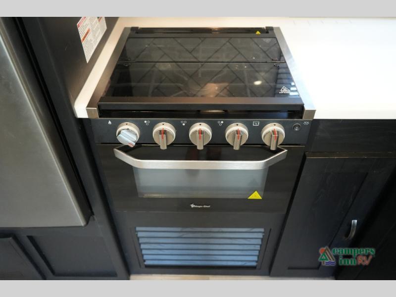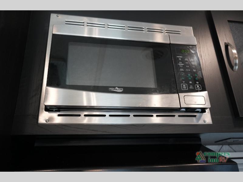 Enjoy a modern living area with a fireplace, hide-a-bed sofa or optional theater seating, booth dinette, and entertainment center. Cook indoors with full kitchen amenities or outside with the camp kitchen that includes a griddle, sink, and mini fridge. Dual power awnings provide shade for relaxing outdoors.