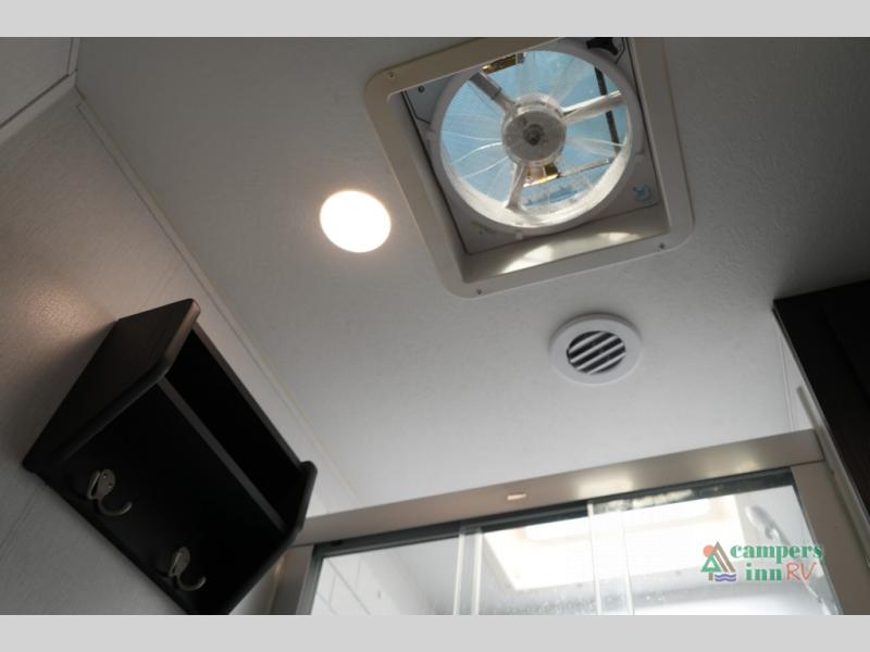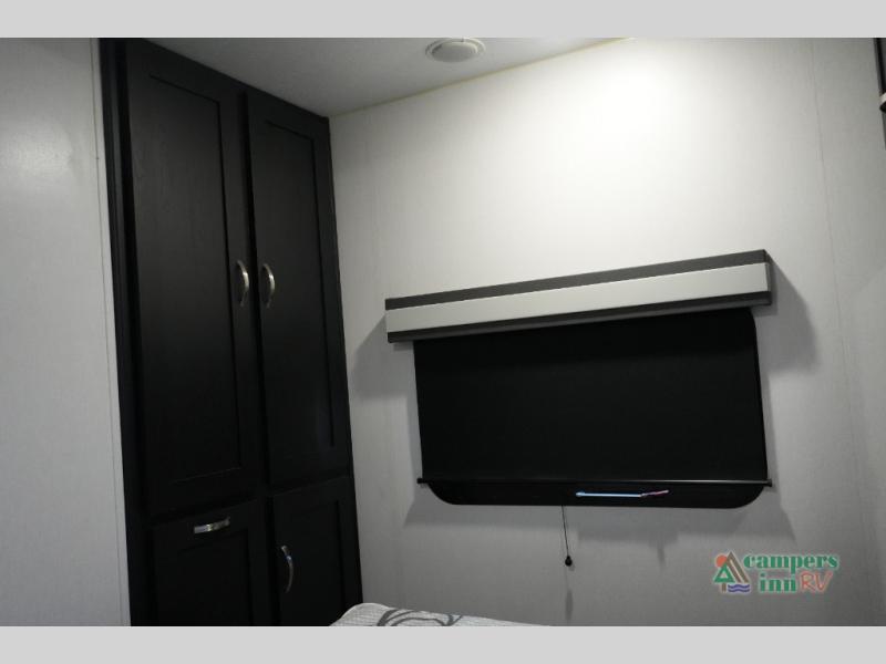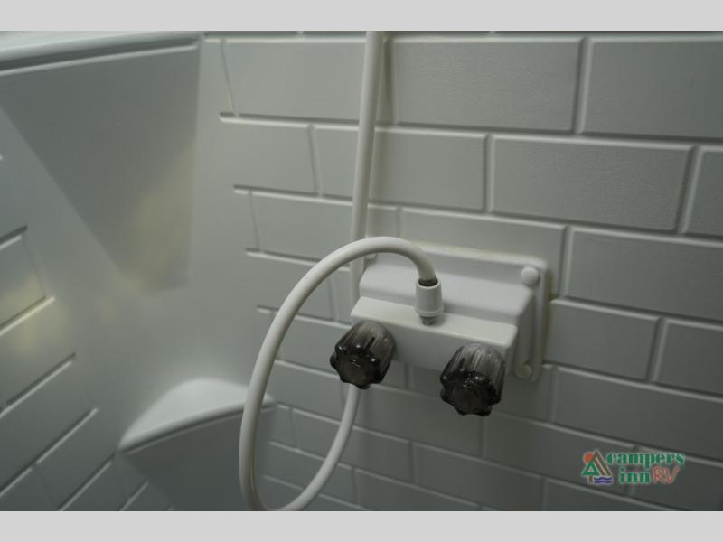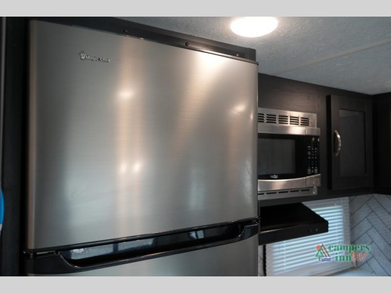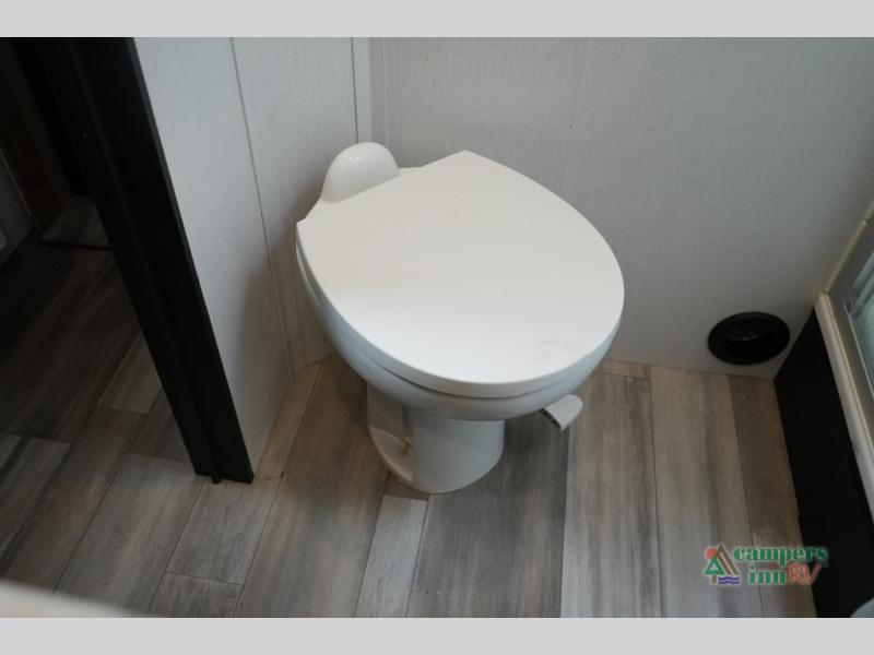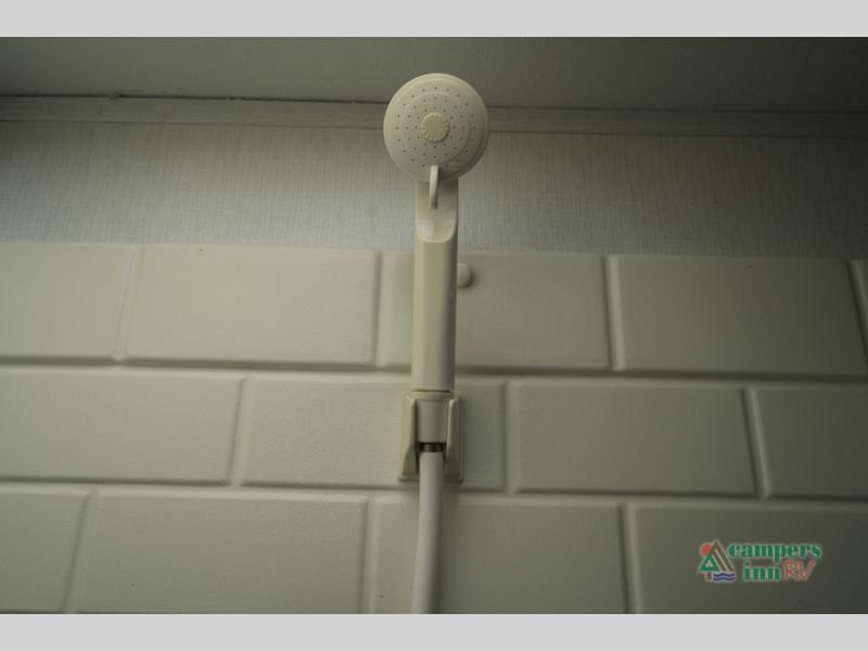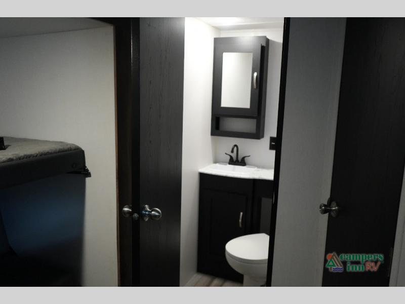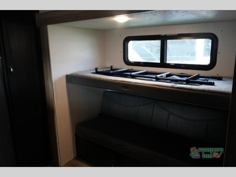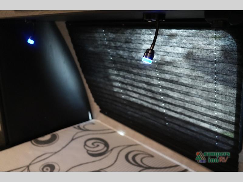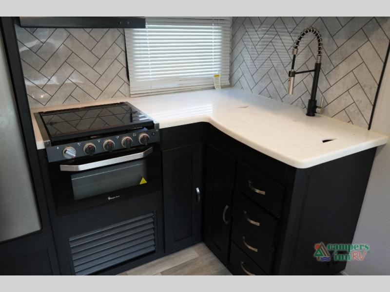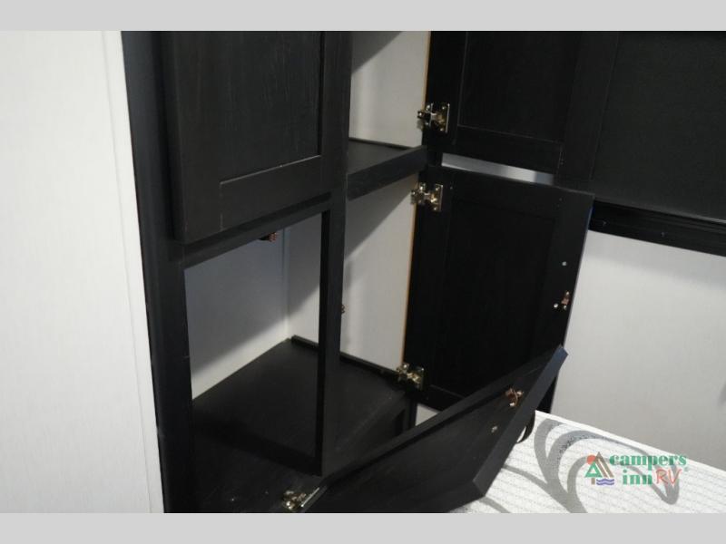 Enjoy a modern living area with a fireplace, hide-a-bed sofa or optional theater seating, booth dinette, and entertainment center. Cook indoors with full kitchen amenities or outside with the camp kitchen that includes a griddle, sink, and mini fridge. Dual power awnings provide shade for relaxing outdoors.
