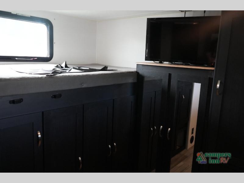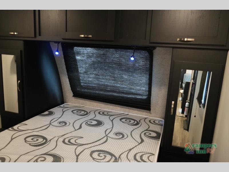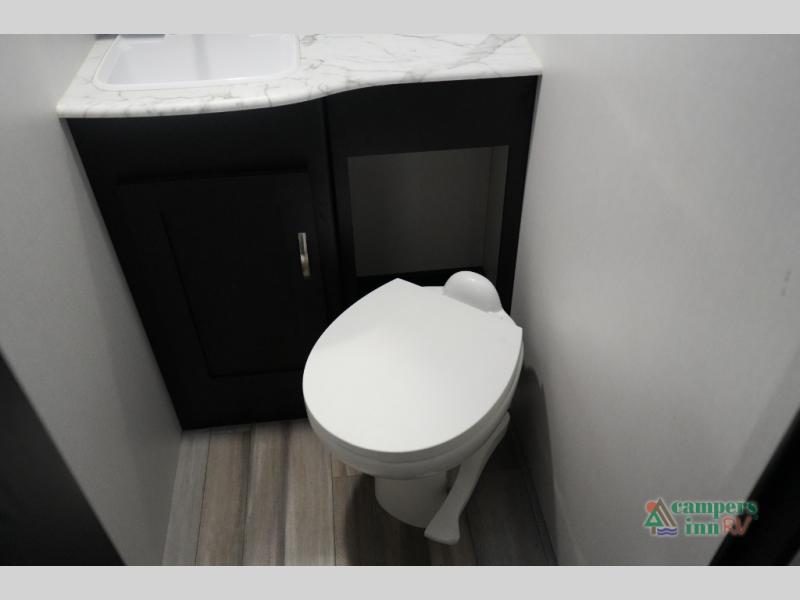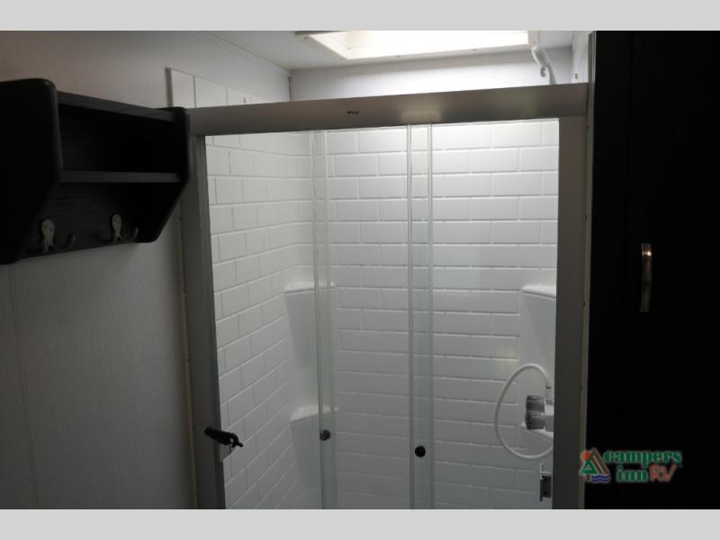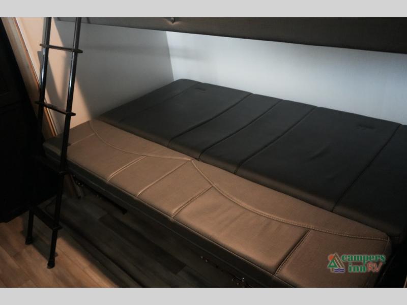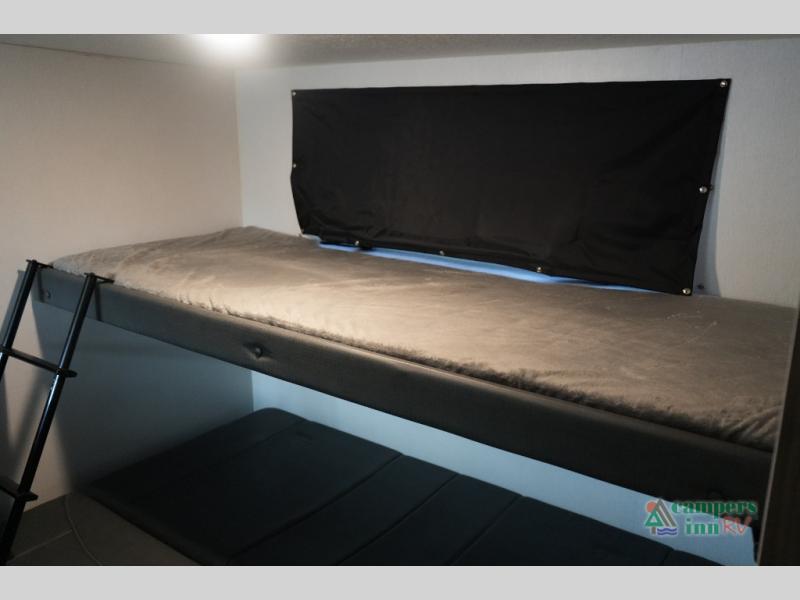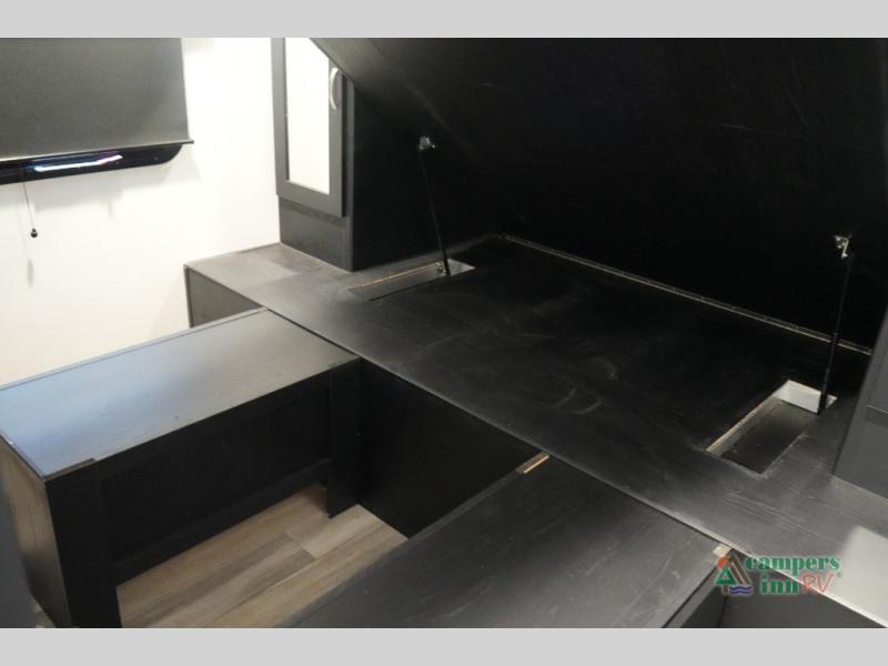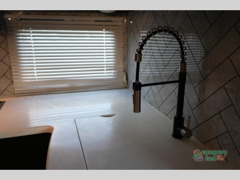 Built with Azdel vacuum-bonded walls, aluminum cage construction, Tufflex PVC roofing, and a heated enclosed underbelly for four-season camping. Frameless windows, vaulted underbed storage, 50 AMP service, hidden hinge cabinetry, and the AIR 360+ antenna system add durability and tech-ready convenience.