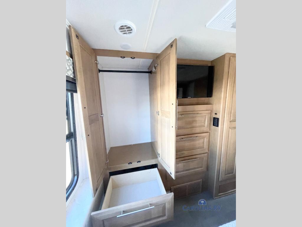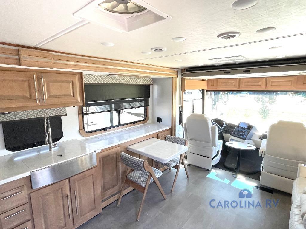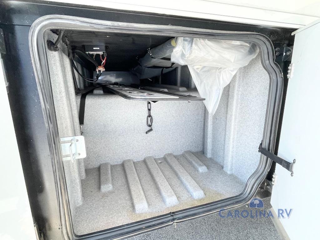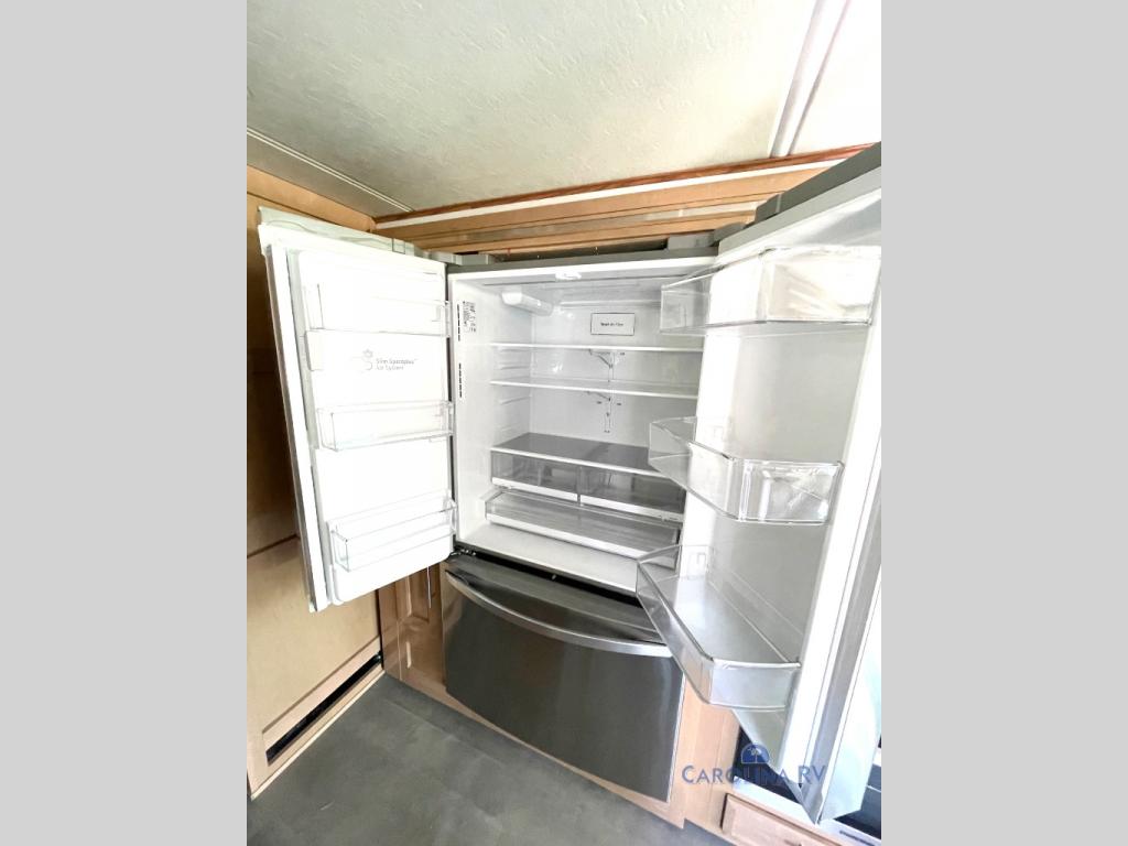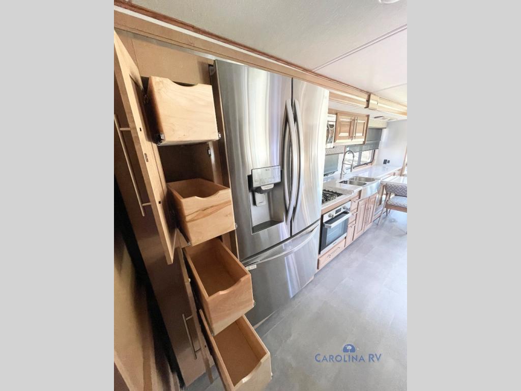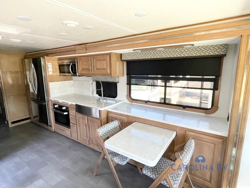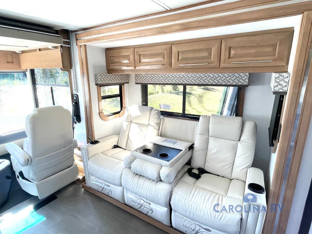 Start living your best life in this motorhome! It features a rear private bedroom with a power tilt 72" x 80" king bed slide across from a dresser with overhead cabinets and a 32" LED TV next to an area prepped to add an optional stacked washer and dryer. Freshen up each morning in the full bathroom with the neo-angled 41" x 34" shower then head to the fully equipped kitchen and grab some bacon stored in the 23 cu. ft. refrigerator to fry up on the three burner cooktop. There is an expandable buffet dinette to enjoy your meals at with a power lift 50" TV above it that can be viewed from the theater seating slide. If you need to get some work done while you're traveling then you will appreciate the passenger workstation in the cab area!