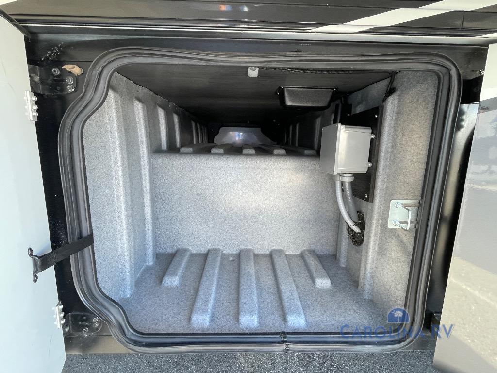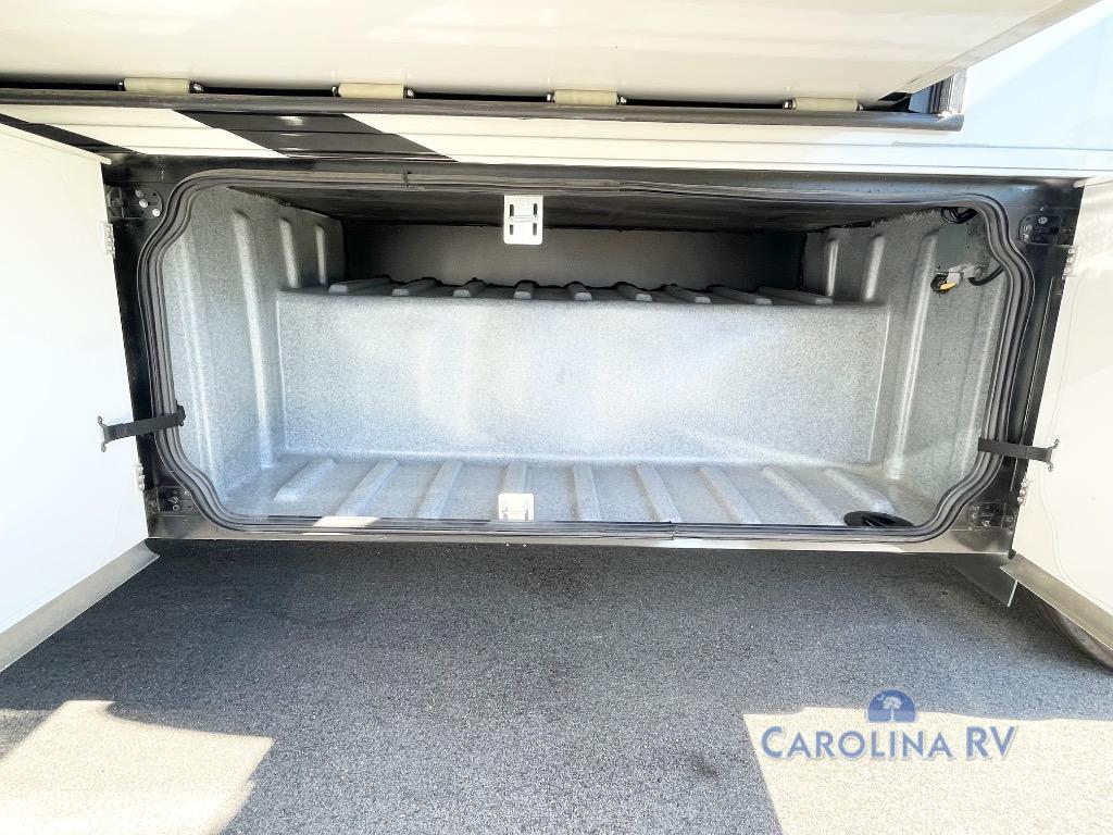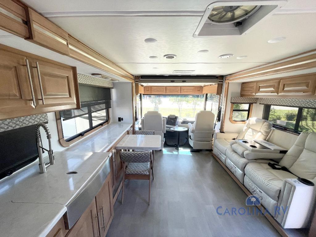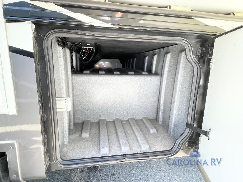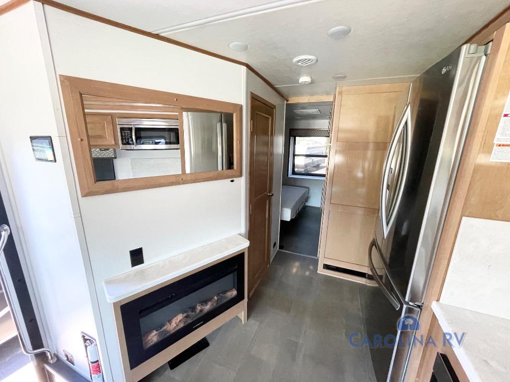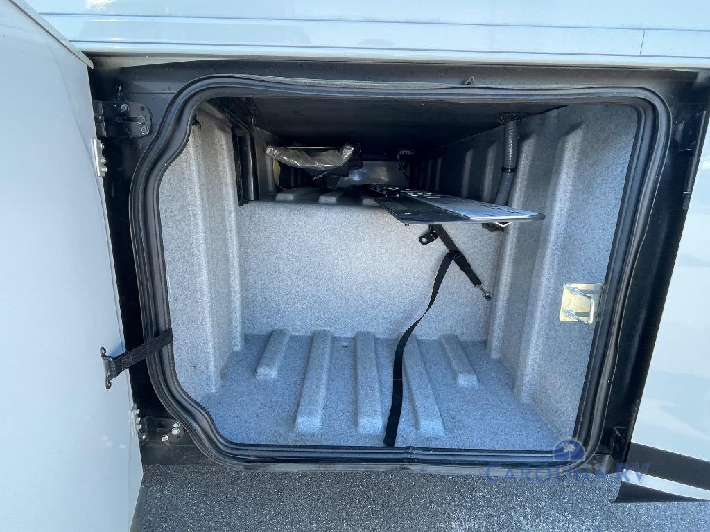 Start living your best life in this motorhome! It features a rear private bedroom with a power tilt 72" x 80" king bed slide across from a dresser with overhead cabinets and a 32" LED TV next to an area prepped to add an optional stacked washer and dryer. Freshen up each morning in the full bathroom with the neo-angled 41" x 34" shower then head to the fully equipped kitchen and grab some bacon stored in the 23 cu. ft. refrigerator to fry up on the three burner cooktop. There is an expandable buffet dinette to enjoy your meals at with a power lift 50" TV above it that can be viewed from the theater seating slide. If you need to get some work done while you're traveling then you will appreciate the passenger workstation in the cab area!