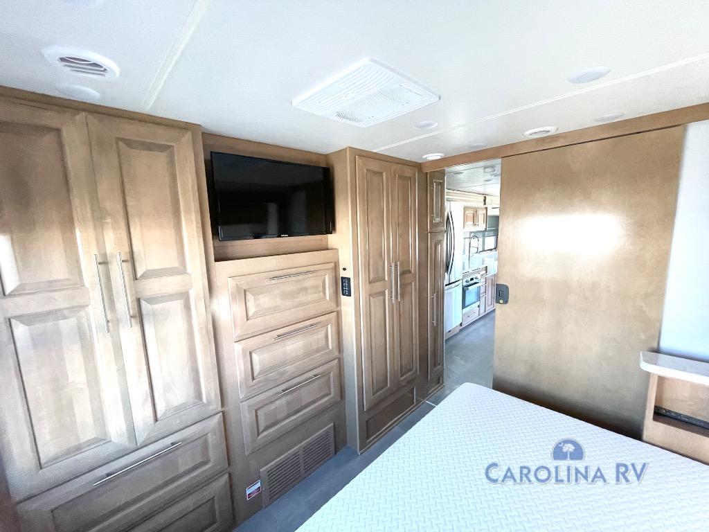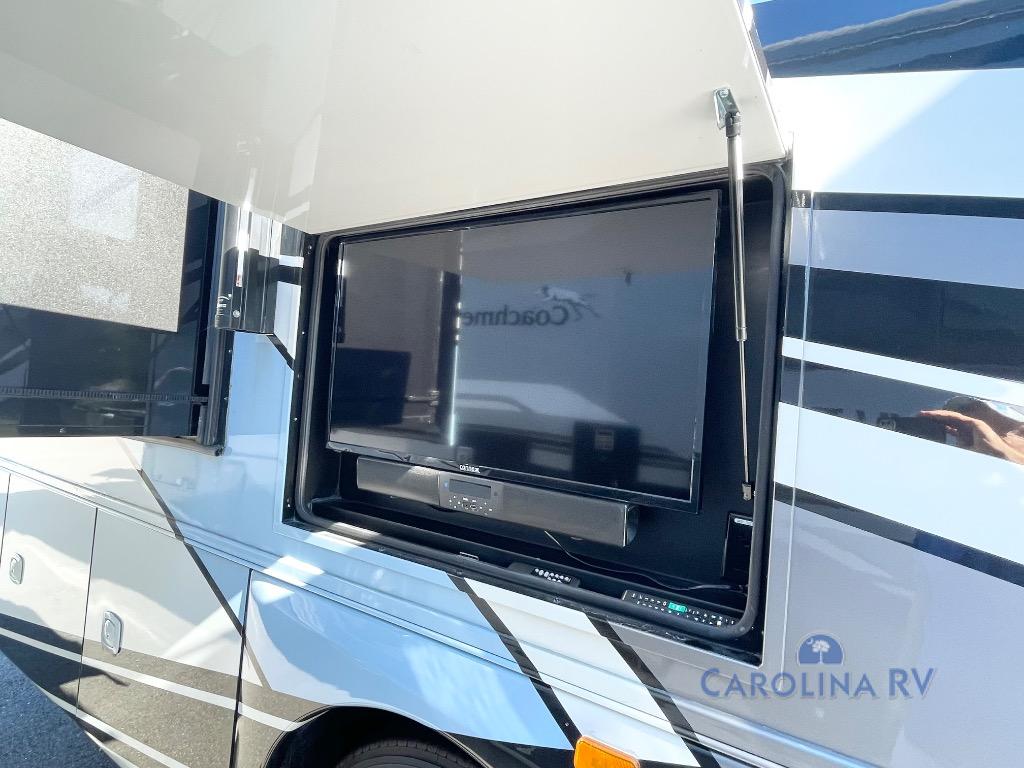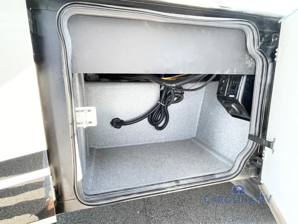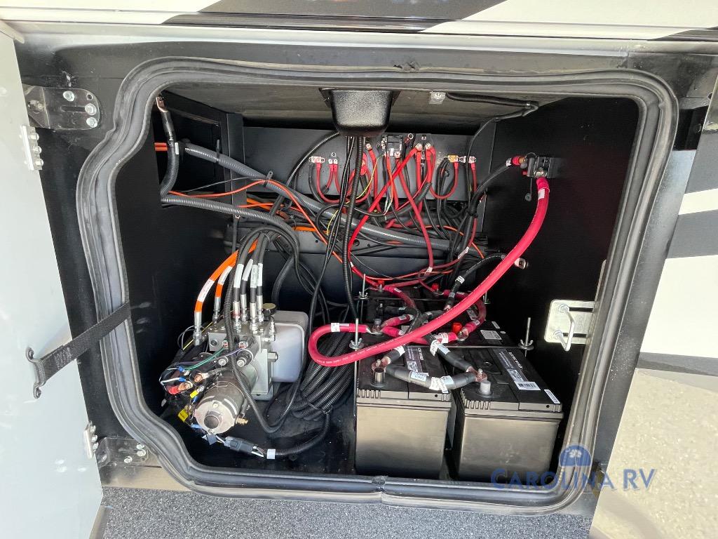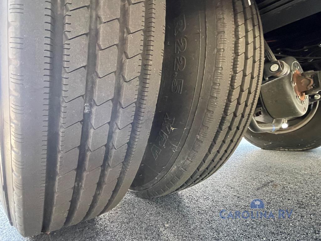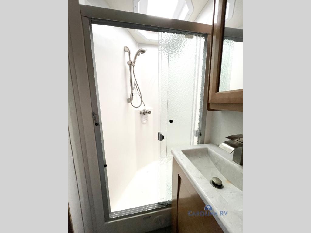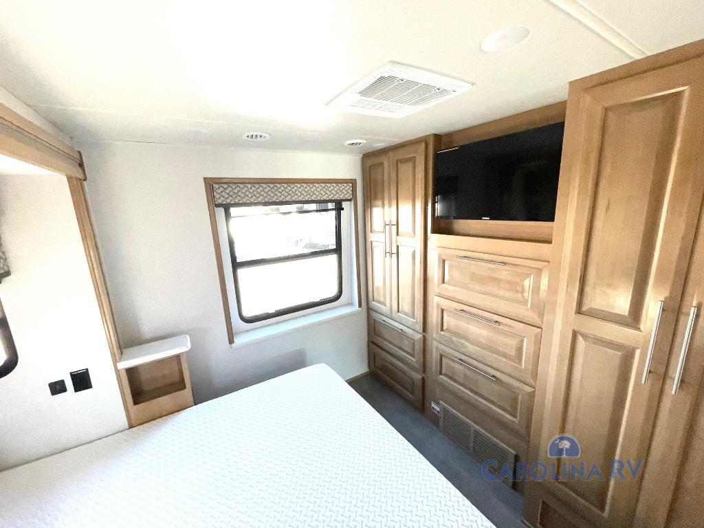 Start living your best life in this motorhome! It features a rear private bedroom with a power tilt 72" x 80" king bed slide across from a dresser with overhead cabinets and a 32" LED TV next to an area prepped to add an optional stacked washer and dryer. Freshen up each morning in the full bathroom with the neo-angled 41" x 34" shower then head to the fully equipped kitchen and grab some bacon stored in the 23 cu. ft. refrigerator to fry up on the three burner cooktop. There is an expandable buffet dinette to enjoy your meals at with a power lift 50" TV above it that can be viewed from the theater seating slide. If you need to get some work done while you're traveling then you will appreciate the passenger workstation in the cab area!