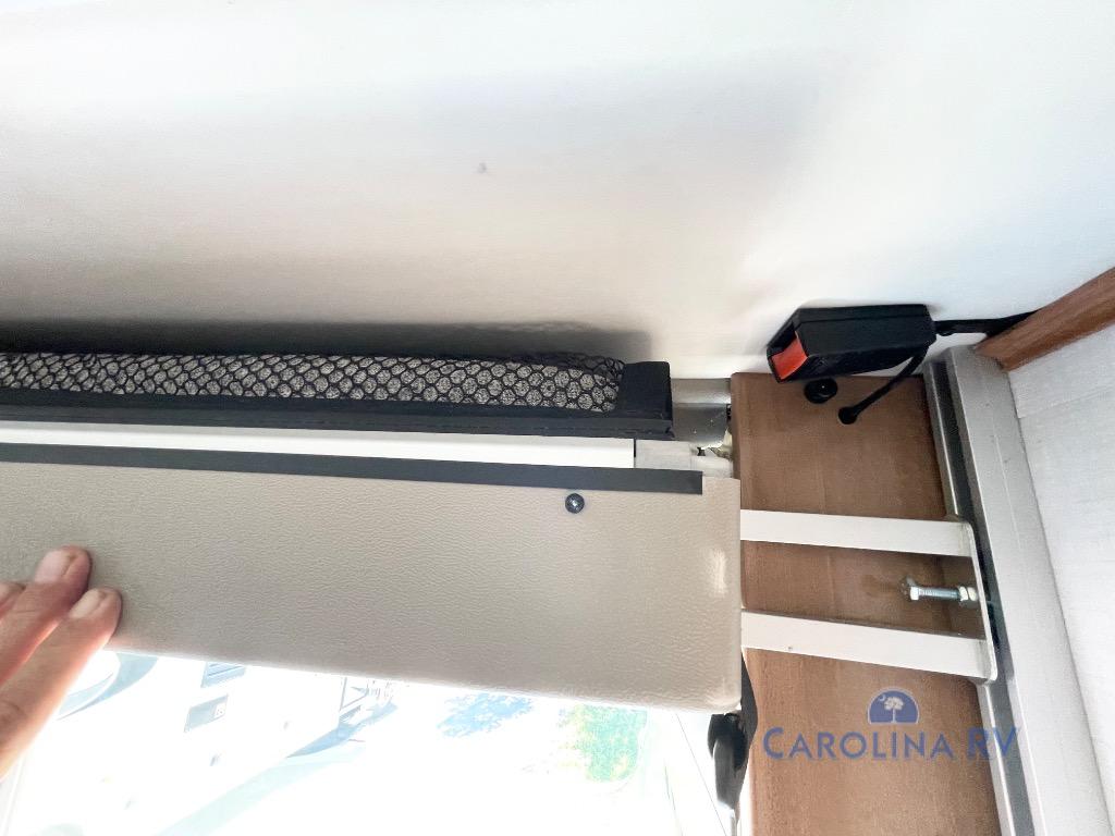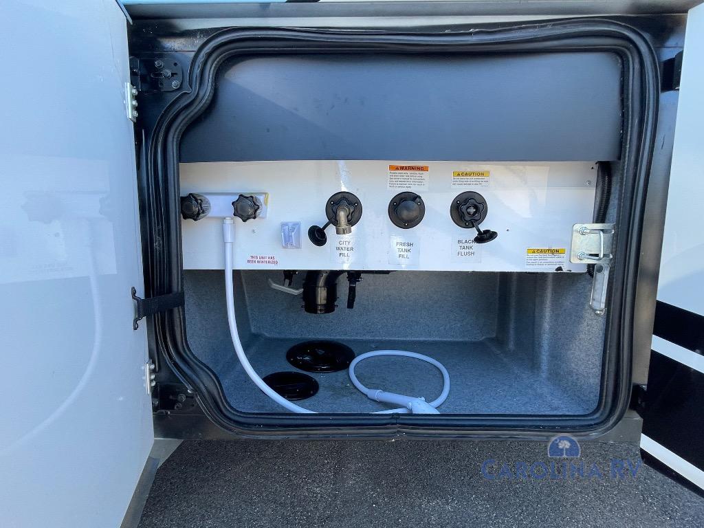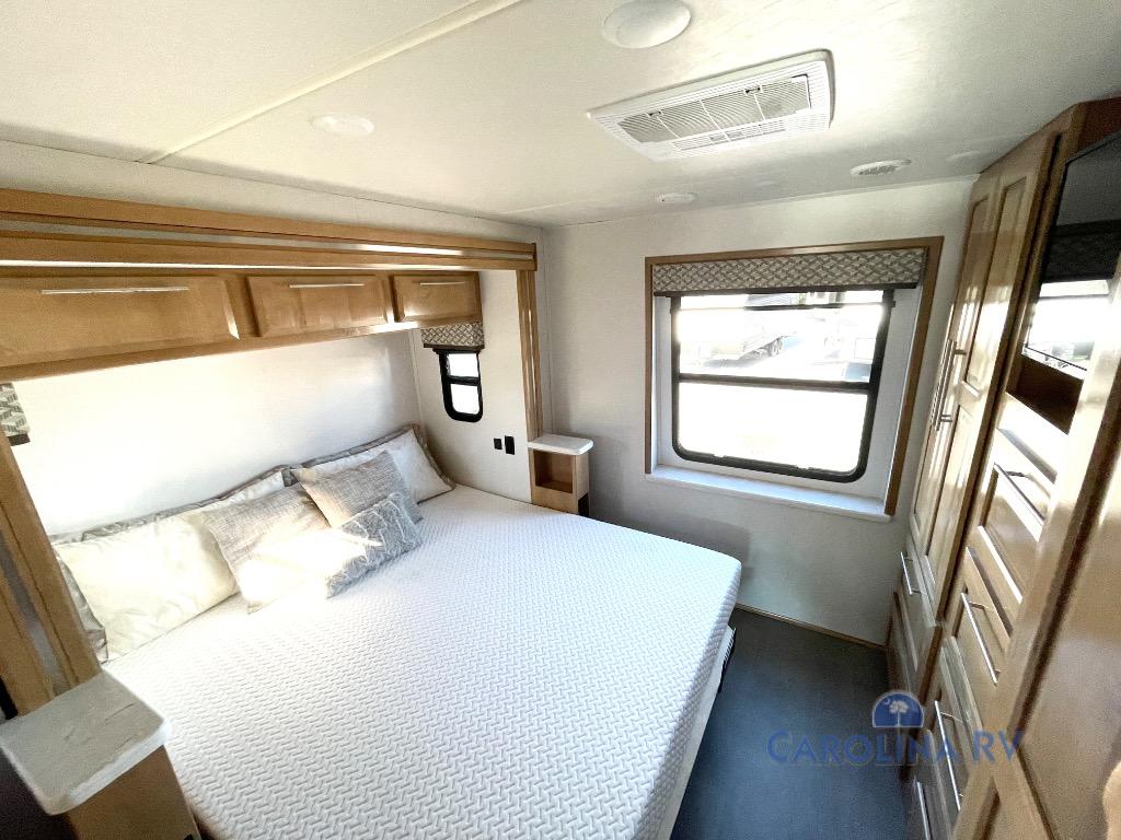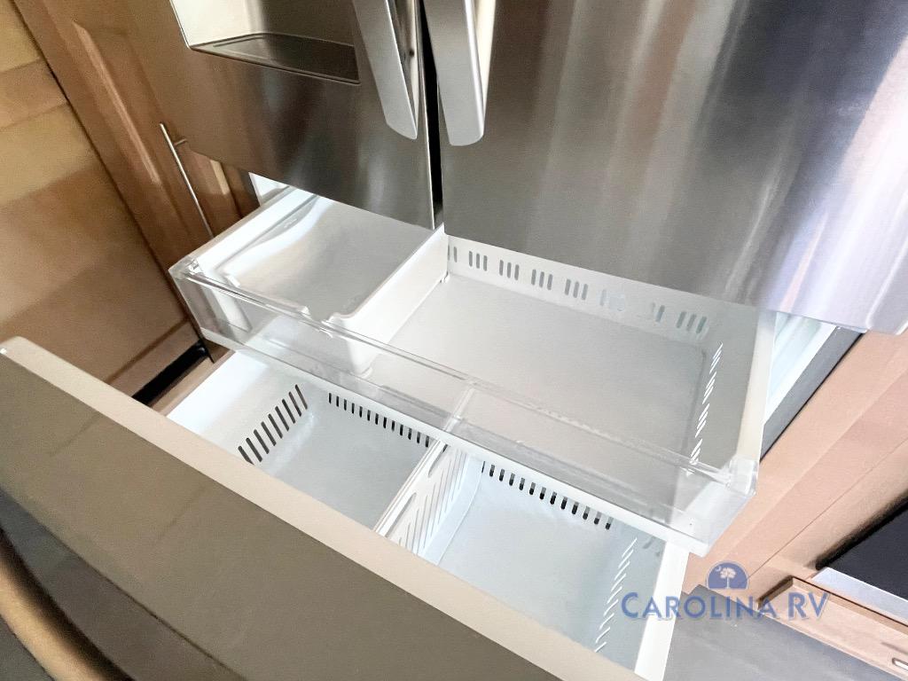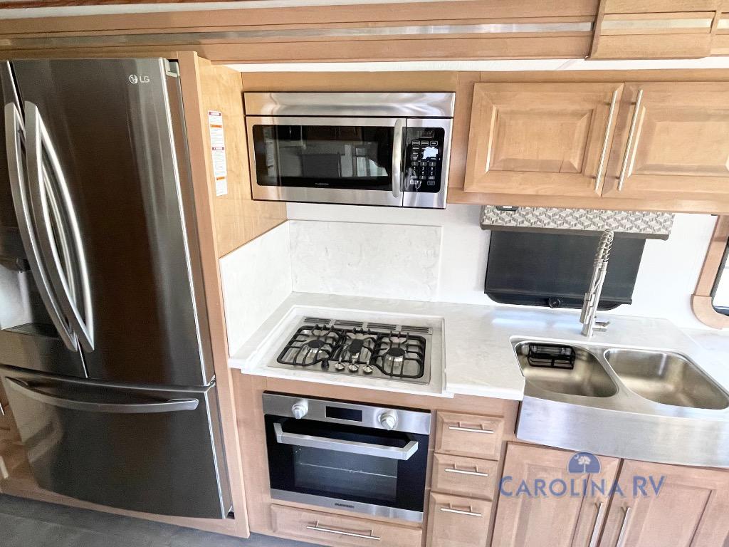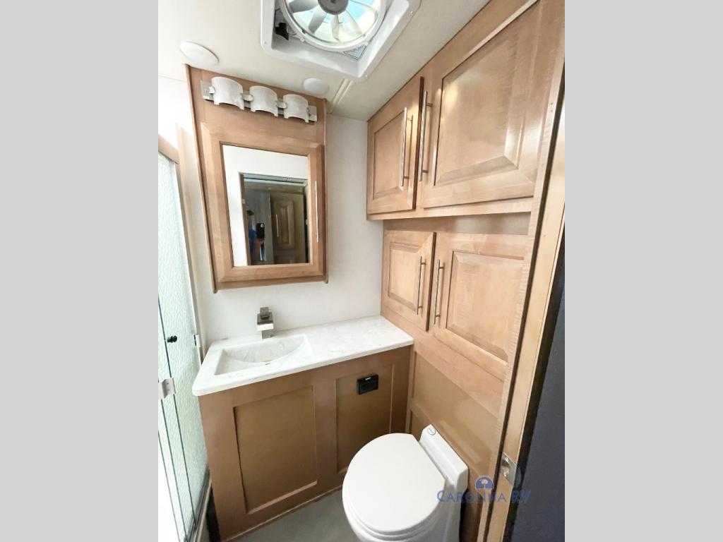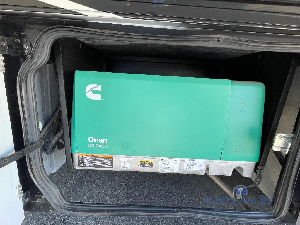 Start living your best life in this motorhome! It features a rear private bedroom with a power tilt 72" x 80" king bed slide across from a dresser with overhead cabinets and a 32" LED TV next to an area prepped to add an optional stacked washer and dryer. Freshen up each morning in the full bathroom with the neo-angled 41" x 34" shower then head to the fully equipped kitchen and grab some bacon stored in the 23 cu. ft. refrigerator to fry up on the three burner cooktop. There is an expandable buffet dinette to enjoy your meals at with a power lift 50" TV above it that can be viewed from the theater seating slide. If you need to get some work done while you're traveling then you will appreciate the passenger workstation in the cab area!
