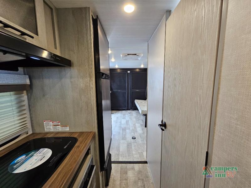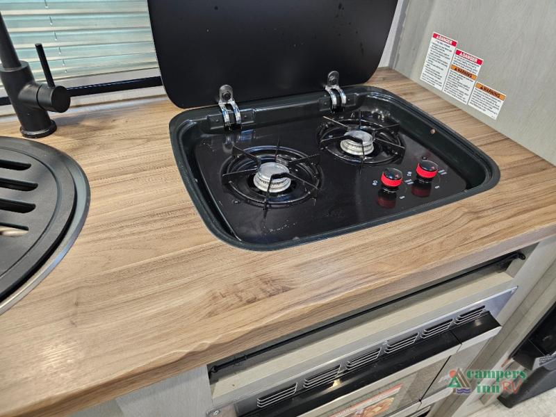 Galley Kitchen includes seamless countertops, a two-burner cooktop, stainless steel appliances, and a large refrigerator