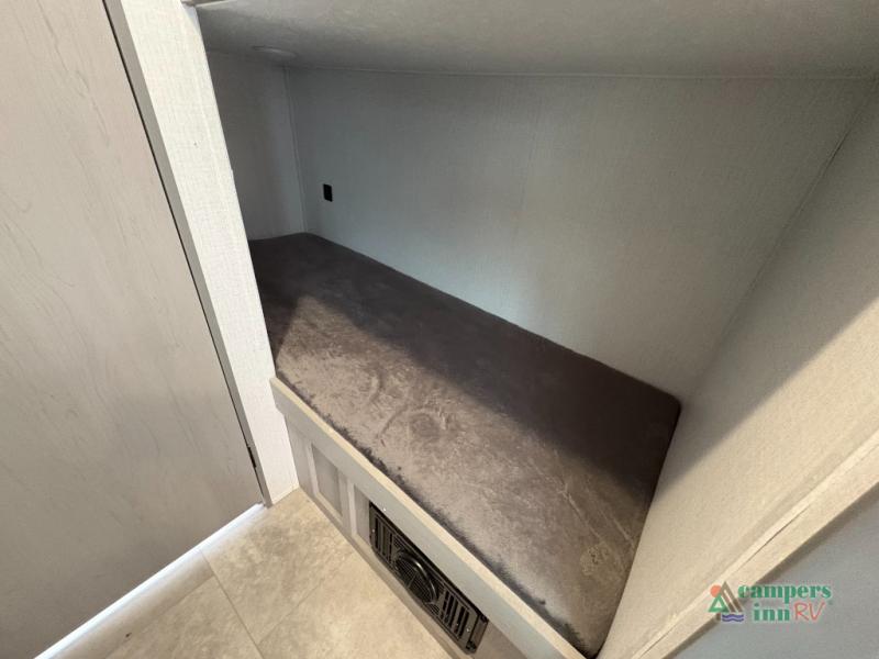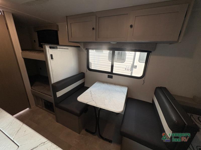 Inside, you’ll find a smart, space-saving floorplan that feels open and inviting. The front queen bed offers a cozy retreat after a long day of exploring, while rear bunk beds are perfect for kids or guests. The booth dinette easily converts into extra sleeping space, giving you room for up to five travelers.