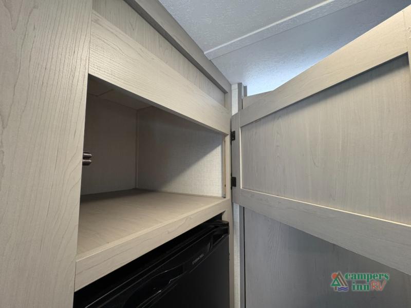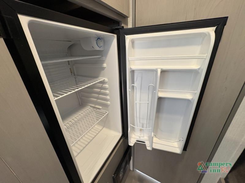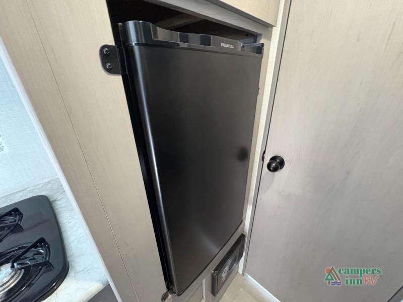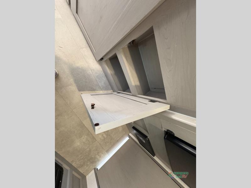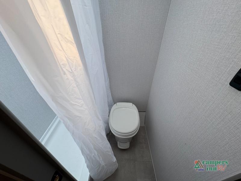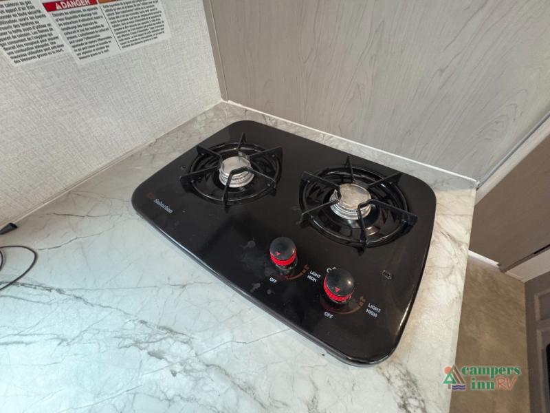 The kitchen comes equipped with a two-burner cooktop, microwave, refrigerator, and plenty of storage for your camping essentials. A full bathroom with a shower and toilet adds comfort and convenience, while durable flooring and modern finishes make this compact camper feel like home.