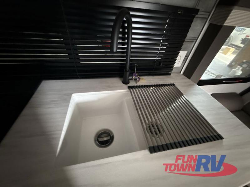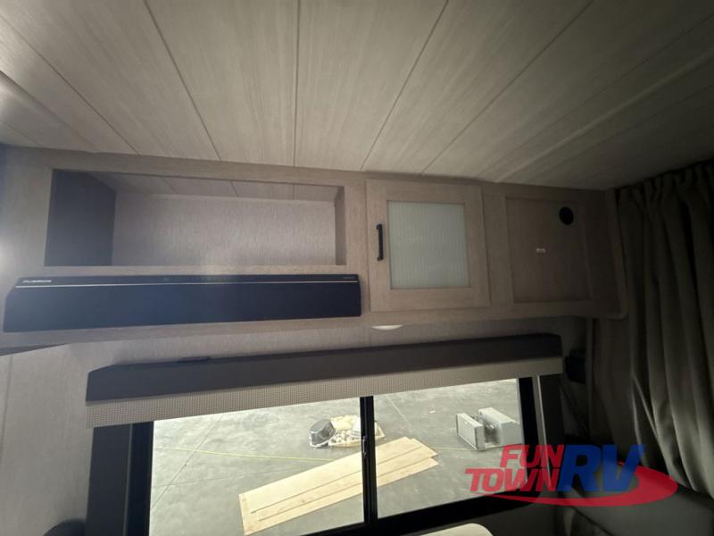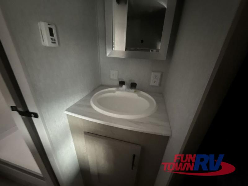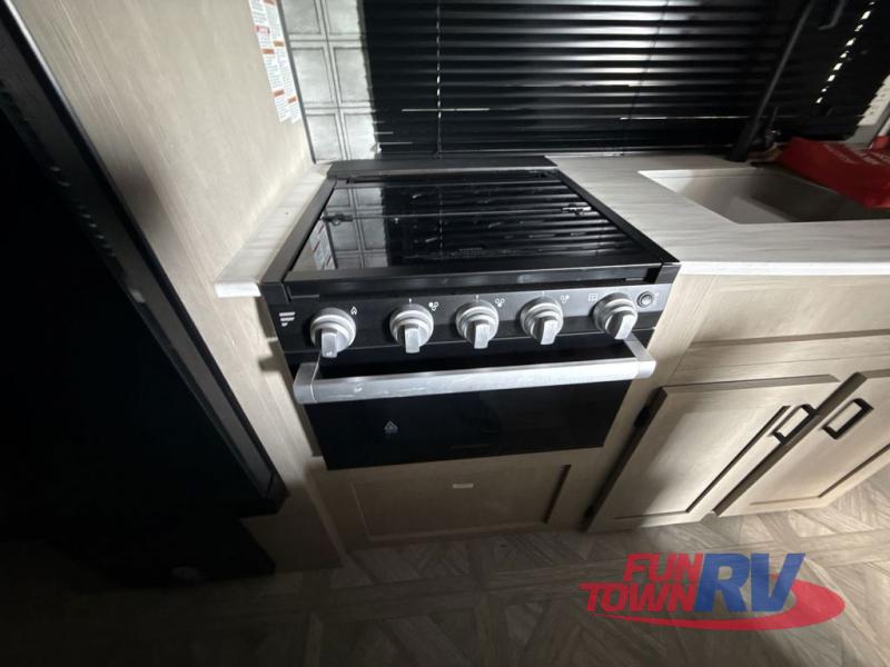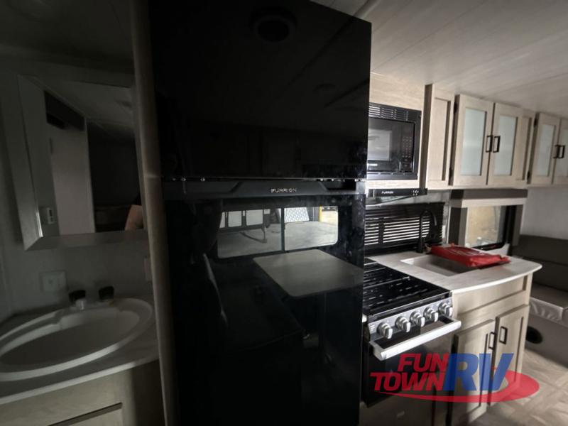 Load up this light weight travel trailer with double-size bunksĀ and head to your favorite campsite! There is plenty of seating and sleeping spaces between the rear bunks, the customĀ king bed, the booth dinette, and the sofa. The front bed has closets on either side of it and a privacy curtain to draw at night. The oversized 11 cu. ft. refrigerator will keep your perishables fresh and the three burner cooktop is just waiting for you to prepare a delicious home cooked meal. And you might want to add the optional outside kitchen for a sunrise breakfast!