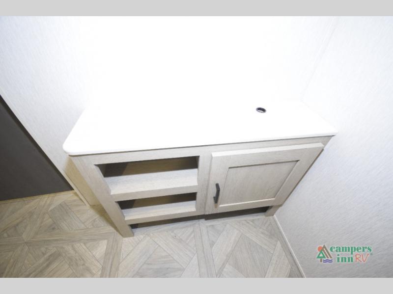 Add in the mirrored fireplace for a cozy touch on cooler evenings and enjoy movie night or quiet time with a warm, ambient glow. When you're outside, take full advantage of the exterior camp kitchen—perfect for grilling, snacking, and keeping the mess out of your living area.