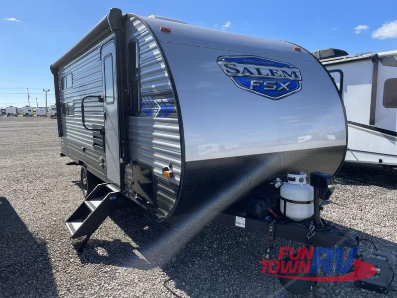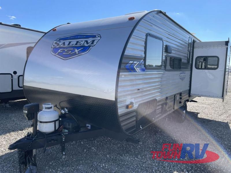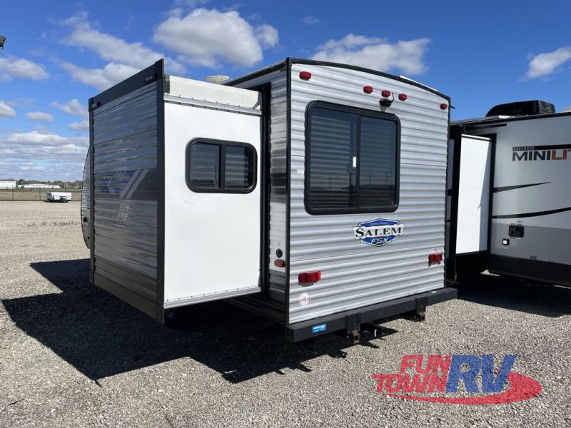 The Forest River Salem FSX travel trailers and toy hauler travel trailers are ultra comfortable and lightweight, perfect for first time or seasoned campers alike! You will love how easy it will be to relax with residential features that will make your space feel just like home, and the durable construction means you can enjoy your RV for years to come. There are a wide variety of floorplans to choose from, including couple's trailers, bunk models, and toy haulers, all with full bath and kitchen amenities and plenty of storage for all your gear!